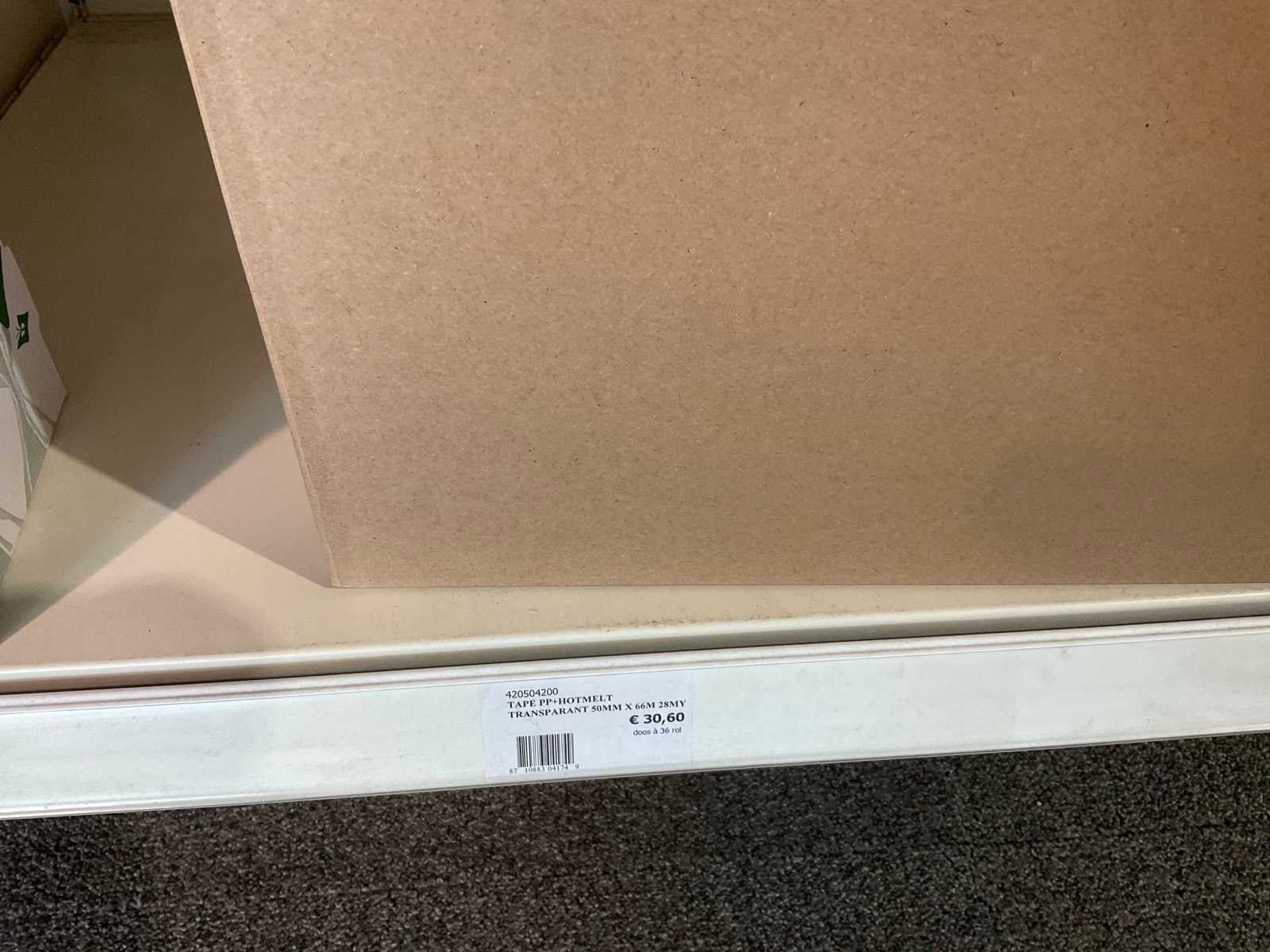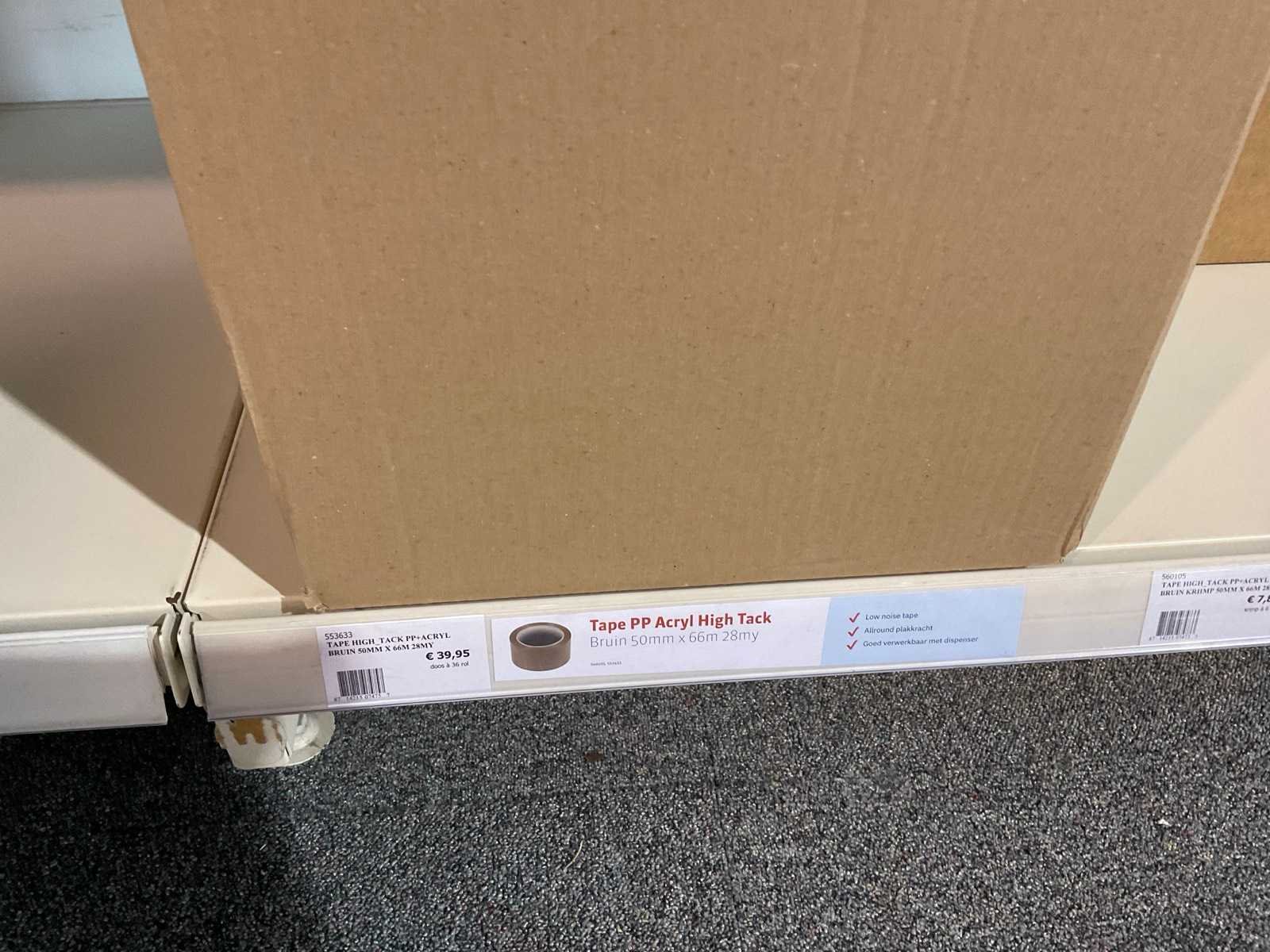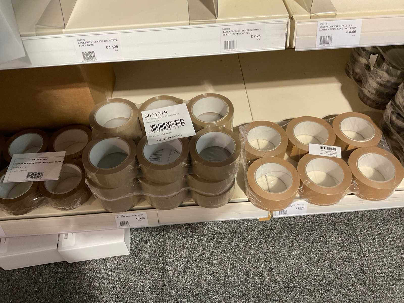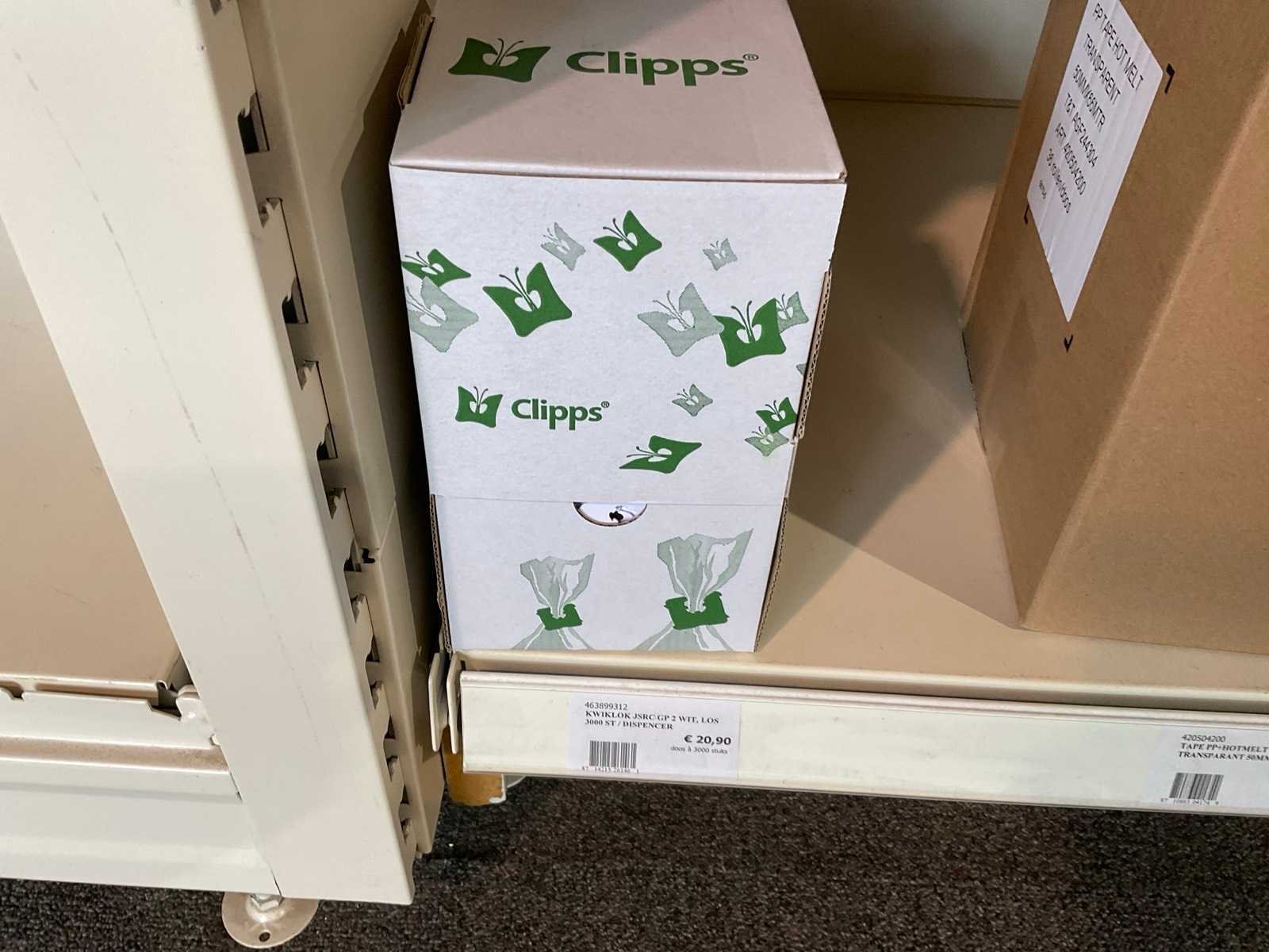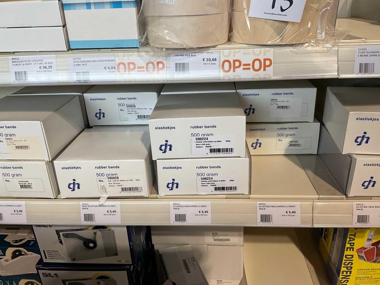 Exclusief stelling Bestaande uit: Tape, zakkensluit, clipps, tapeafrollers, etiketten, elastiekjes, wikkelstrips, hangetiketten.