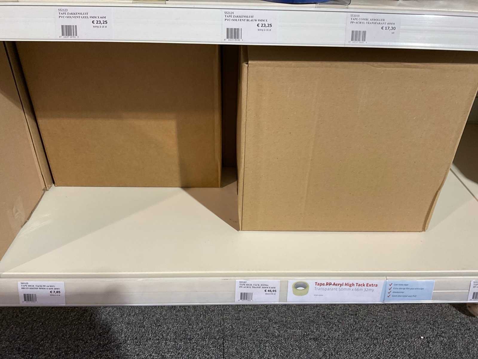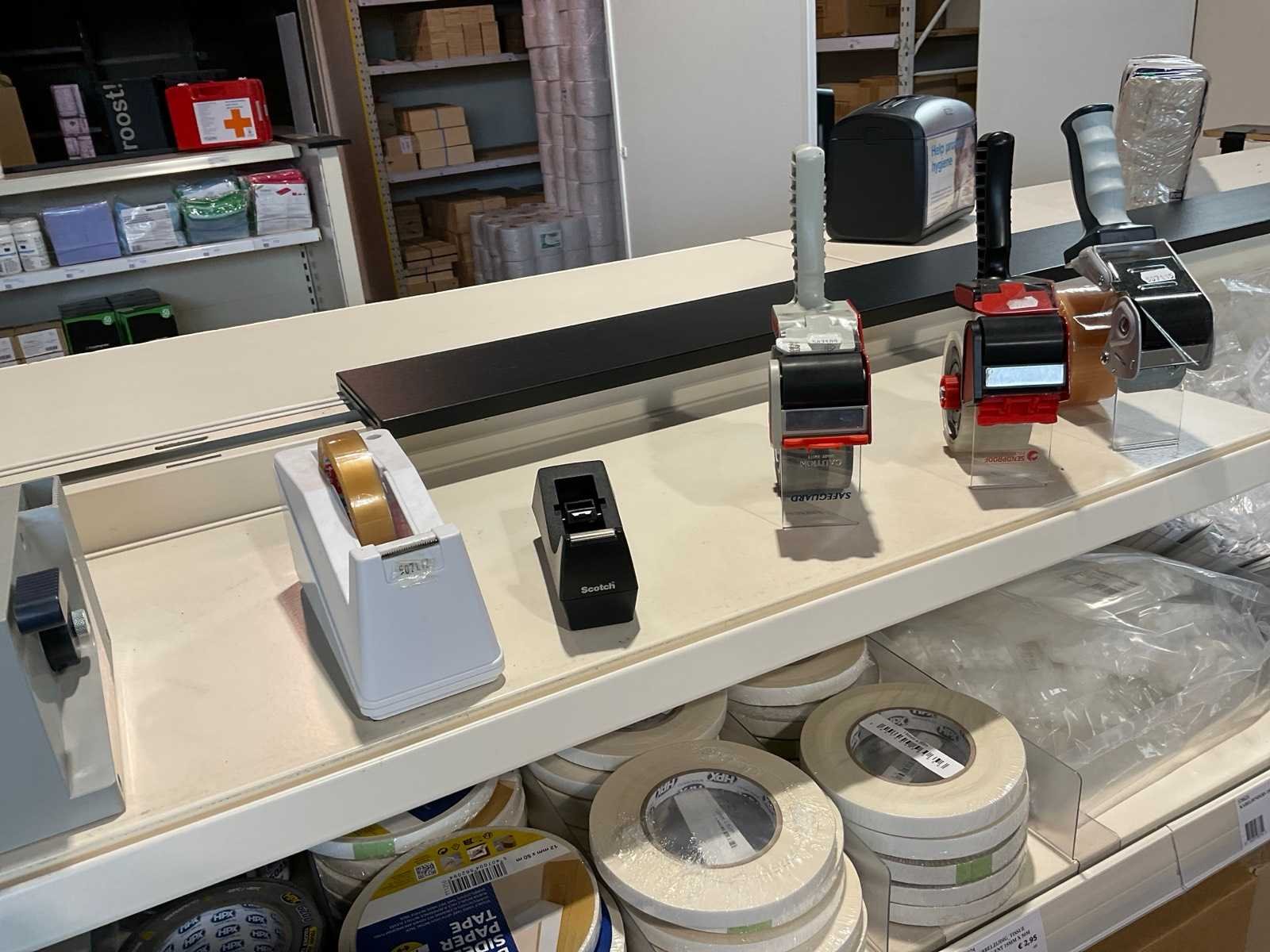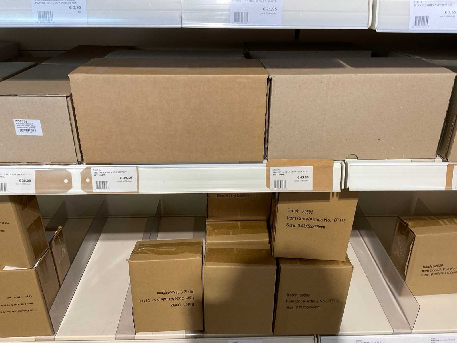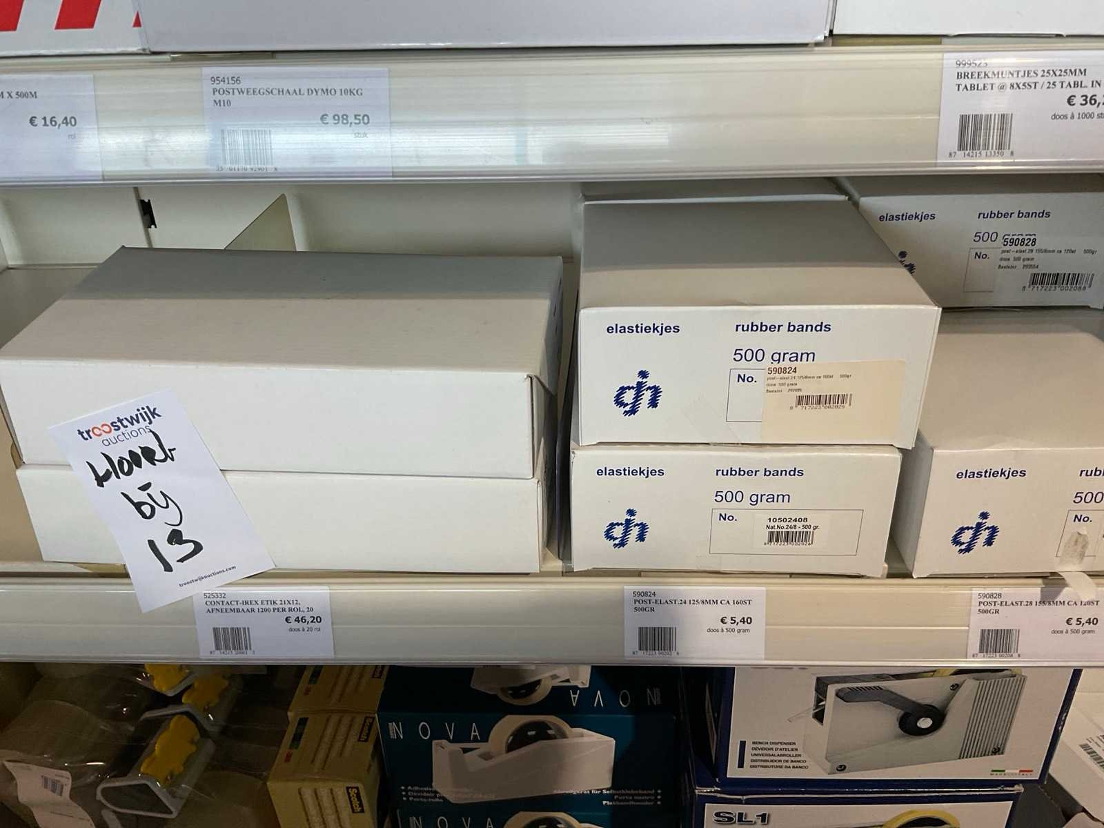 Exclusief stelling Bestaande uit: Tape, zakkensluit, clipps, tapeafrollers, etiketten, elastiekjes, wikkelstrips, hangetiketten.
