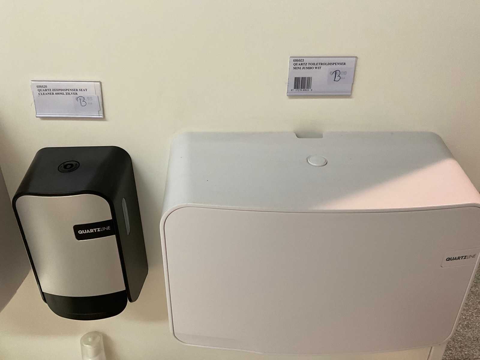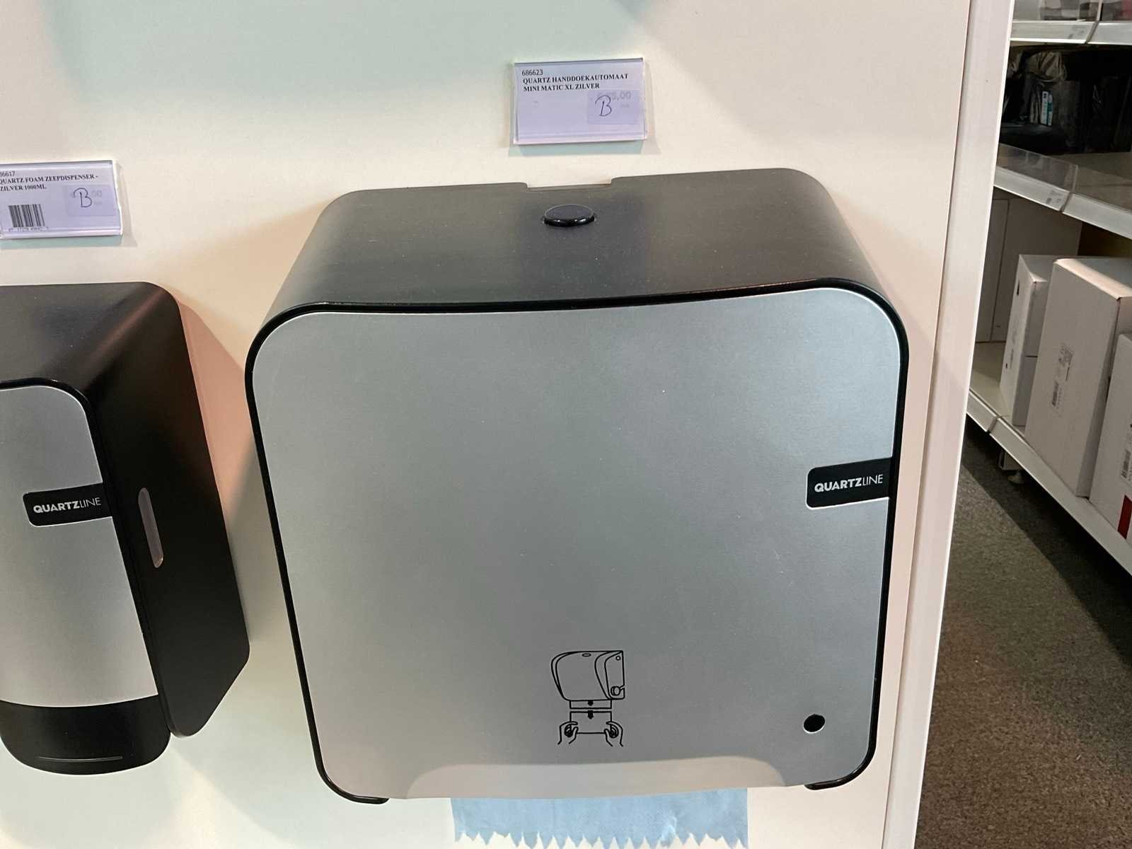 2 stellingen met diverse samples van Quartzline o.a. toiletroldispenser, handdoekdispenser, zeepdispenser, poetsroldispenser en luchtverfrisser, inclusief stelling. Inclusief winkelstelling. Merk: Quartzline Type: Showroom met samples