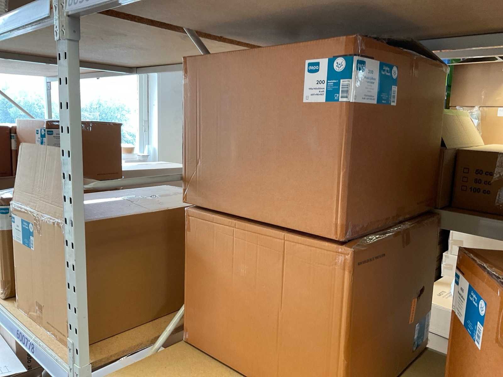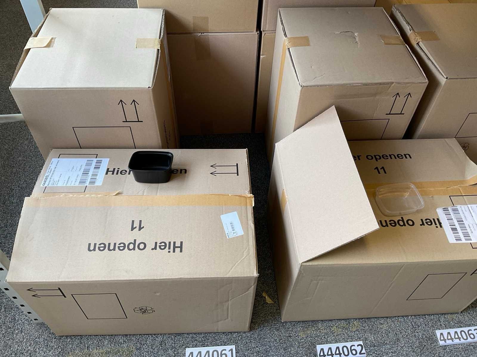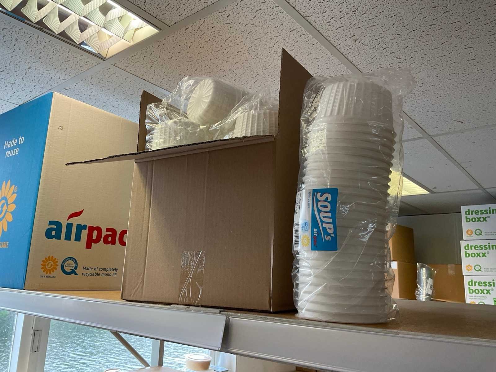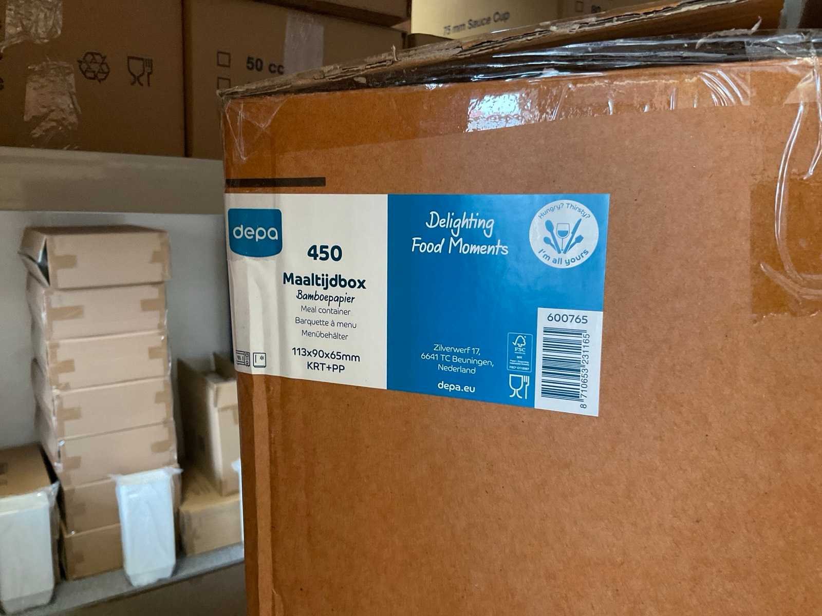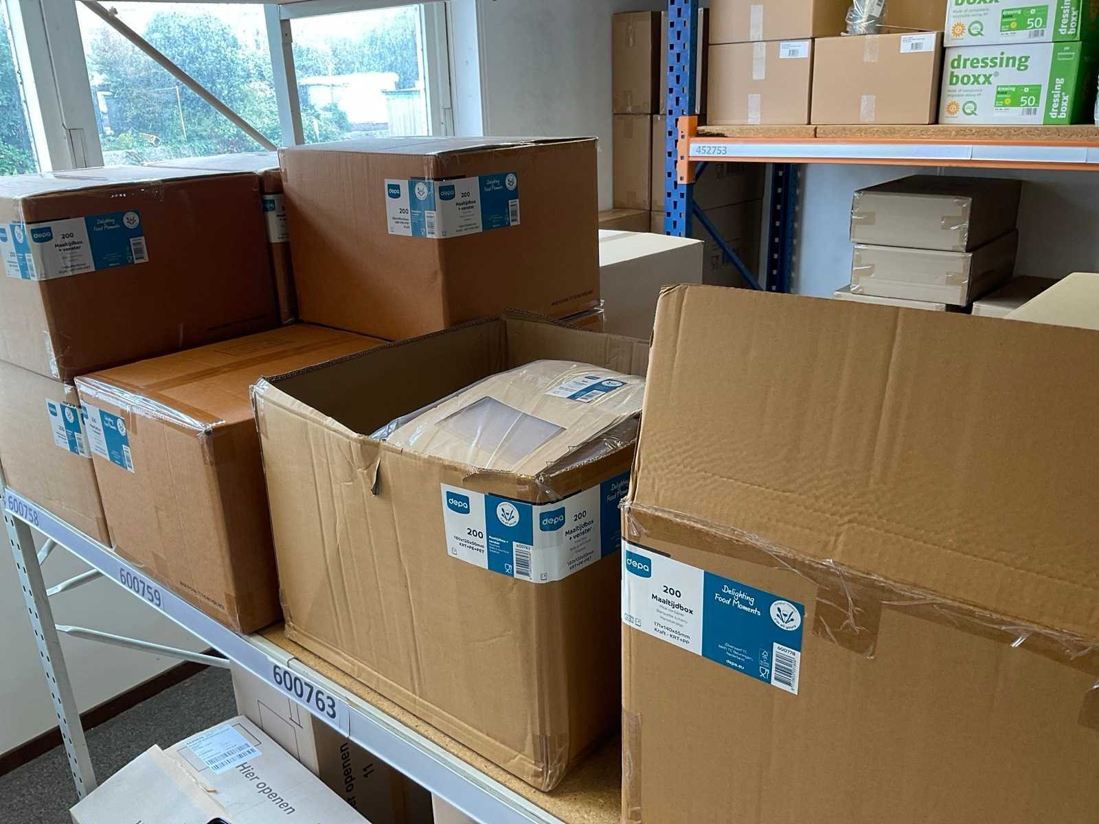 Inhoud 1 zijde stelling, bestaande uit maaltijboxen, soepbekers, hamburgerboxen, schalen, bakjes, exclusief stelling. Merk: Depa
