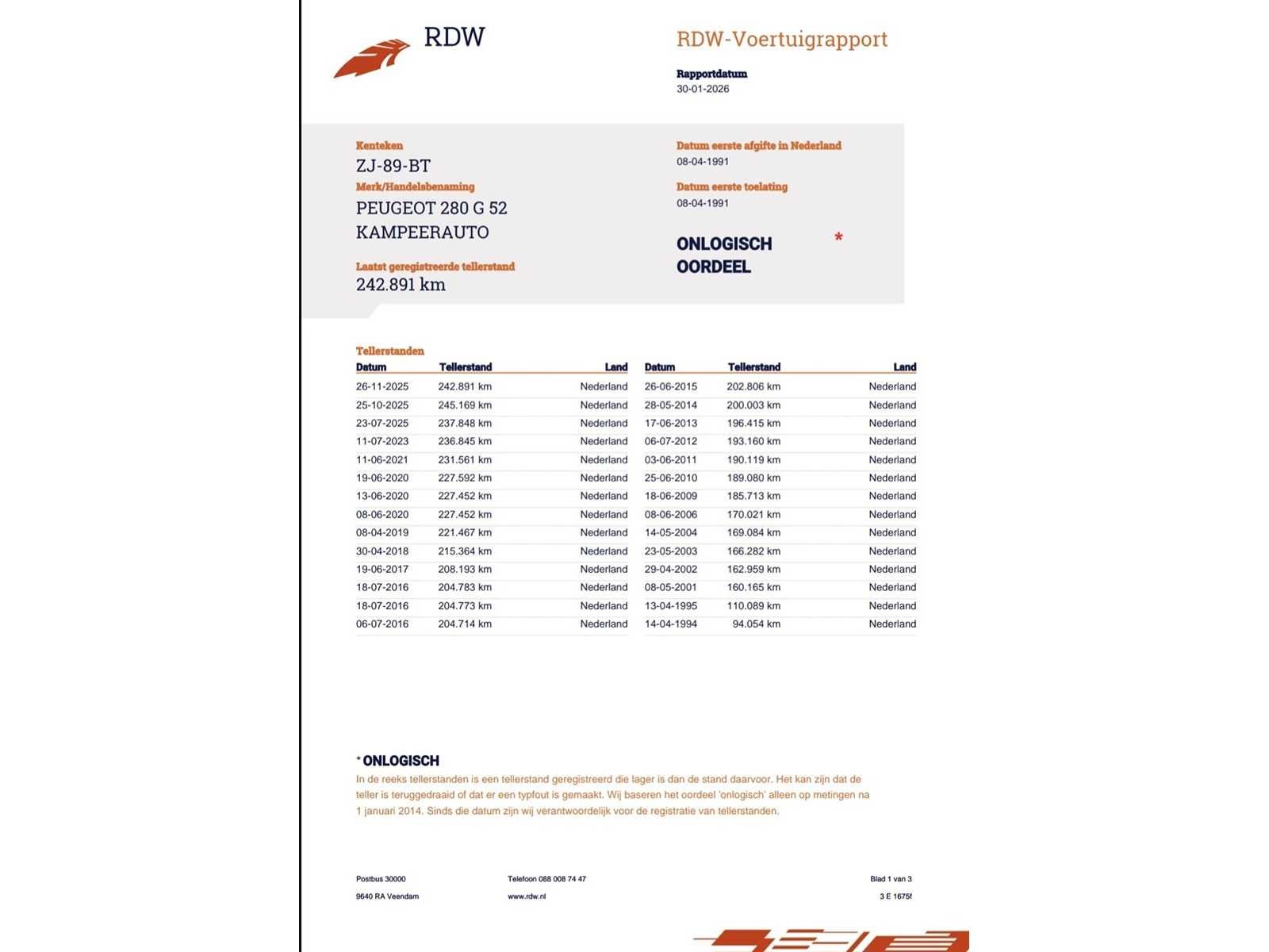 Voorzien van; fietsendrager; koelkast; kookplaat; luifel; Kenteken: ZJ-89-BT Merk: Peugeot Model: 280 G 52 Type: Bürstner Mobil Aantal zitplaatsen: 7 Bruto BPM (NL): 0€ Datum eerste toelating (NL): 1991-04-08 Datum eerste toelating: 1991-04-08 APK vervaldatum: 2027-07-23 Afgelezen kilometerstand: 242915km Vermogen (kW): 55kW Vermogen (pk): 75hp Cilinderinhoud: 2500cc Emissieklasse: 0 Brandstof: diesel Aantal deuren: 3 Kleur: wit Carrosserie: Kampeerwagen Ledig gewicht: 2320 Self drive export possible : true