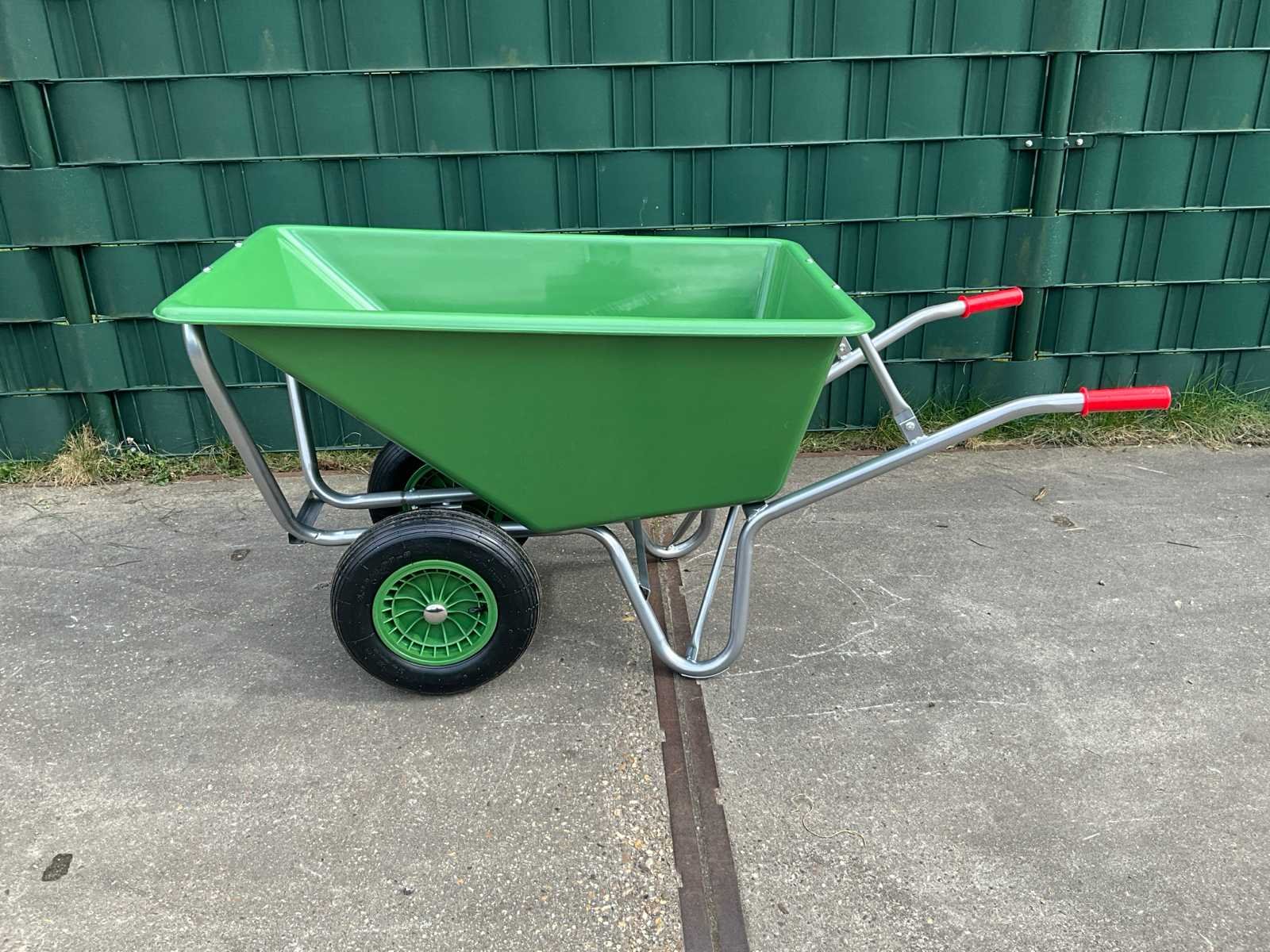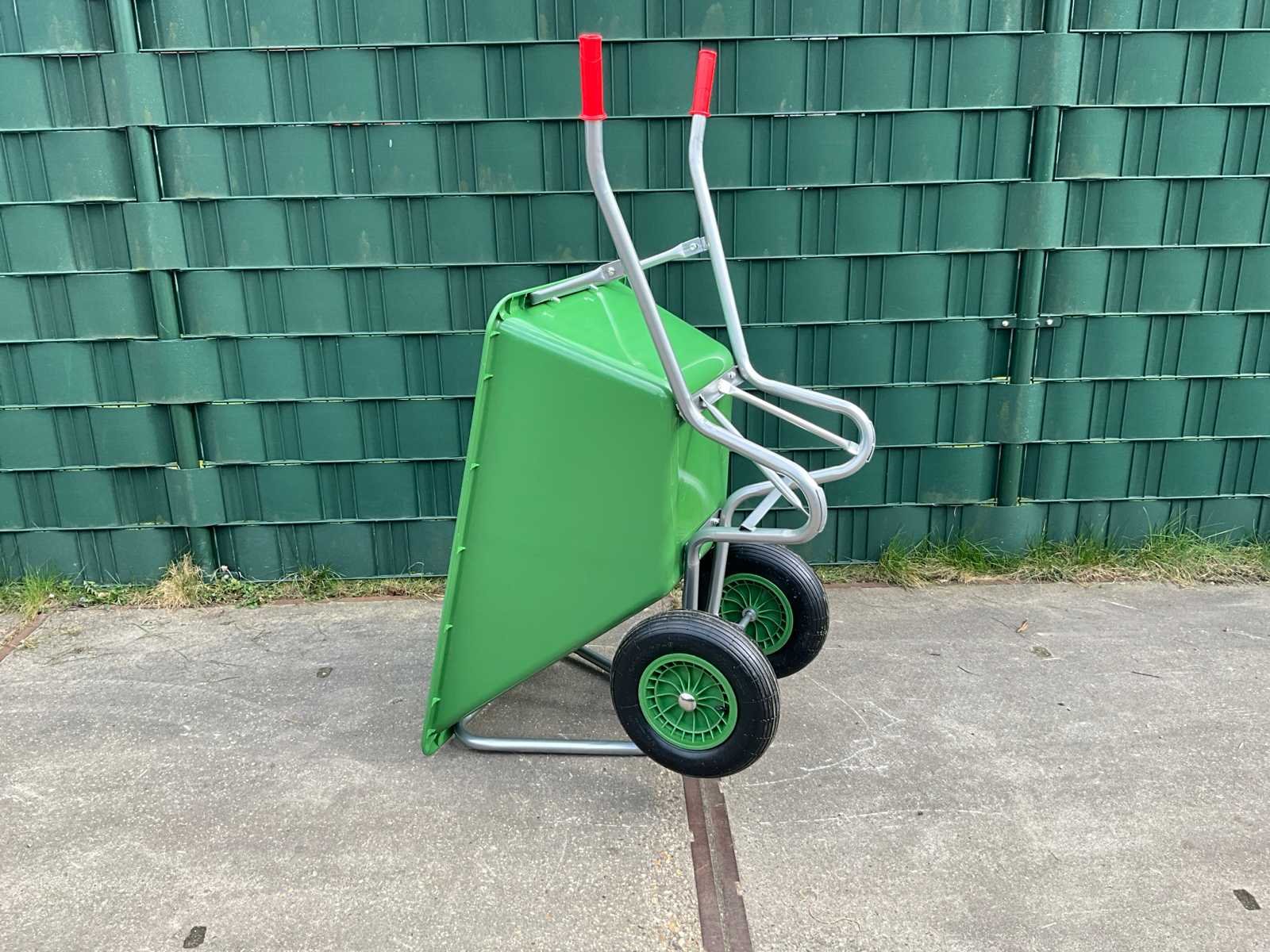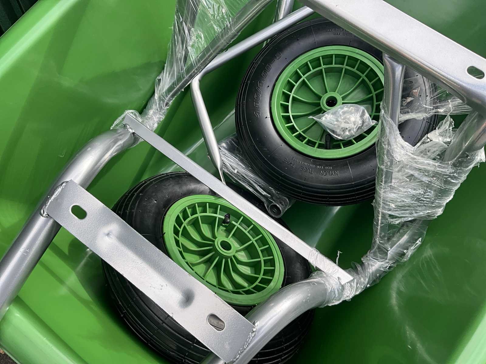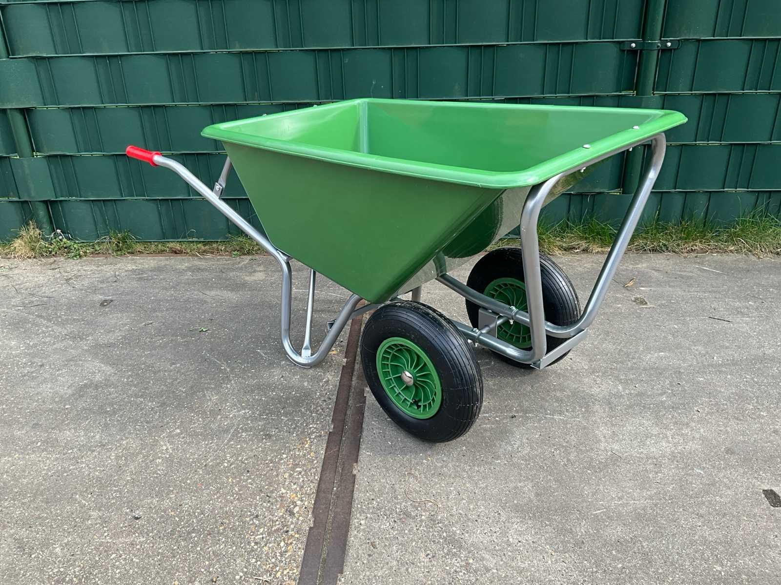 Stevige kruiwagen met grote 160 liter bak en dubbel wiel voor extra stabiliteit; Verzinkt frame; Kunststof wielen met rollager en luchtbanden; 4.80/4.00-8; nylon tube; max inflation 2.0 bar maz snelheid 20 KM/H; Extra stevige kunststof bak; De maximum laadcapaciteit is 200 kg; Geleverd als bouwpakket zie laatste foto's Merk: HH Model: Poly 160 liter 2 wielen Kleur: Groen Gewicht: 18kg Lengte: 165cm Breedte: 71cm Hoogte: 80cm Materiaal: Kunststof / metaal