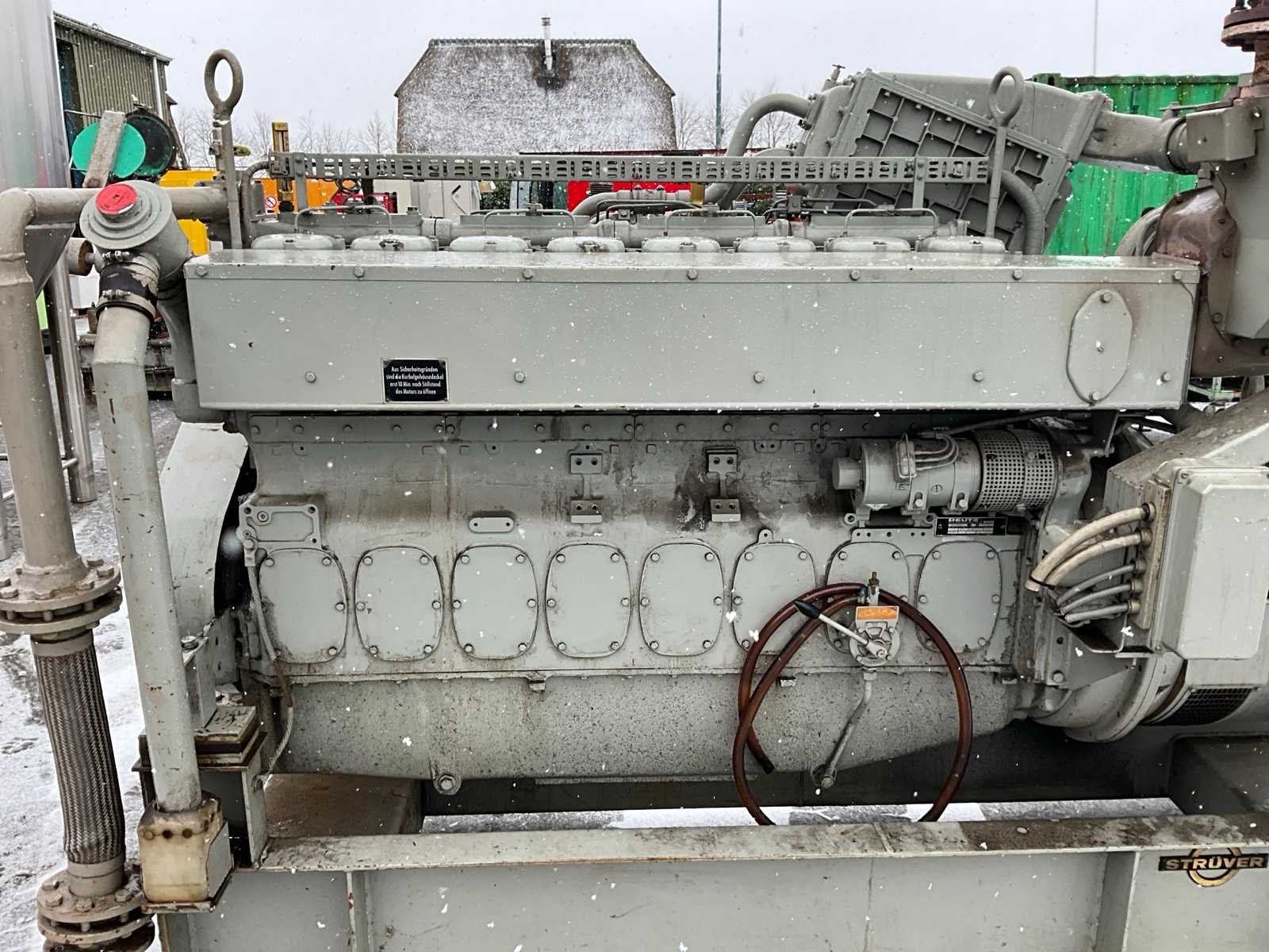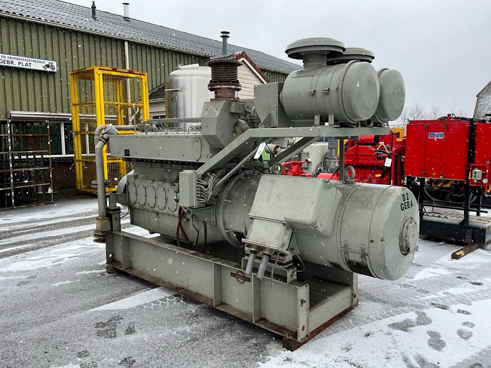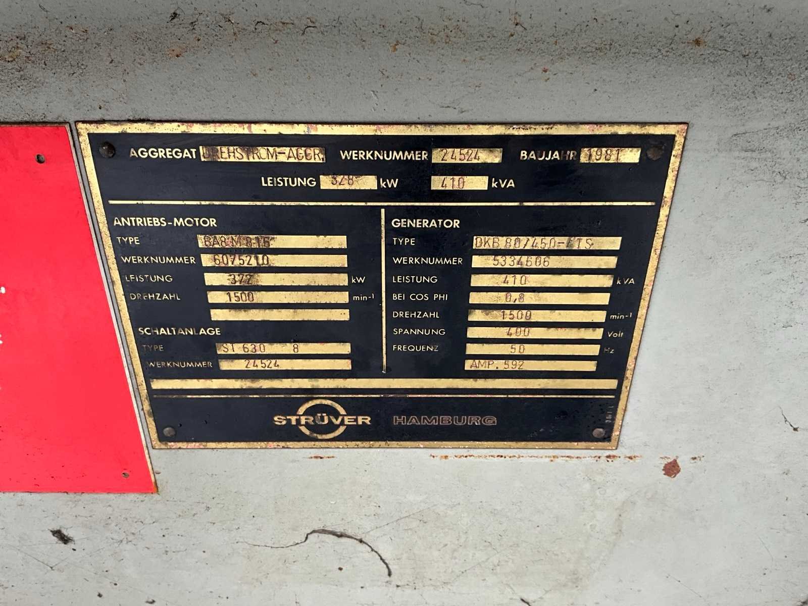 Inclusief sturingskast, afmeting circa: 730x1020x2000 mm, radiator, afmeting circa: 1150x1400x1450 mm Merk: Strüver Bouwjaar: 1981 Serienummer: 24524 Capaciteit.: 410kVA Aansluiting: 400V Motor merk: Deutz Motorcapaciteit: 372kW Generator merk: AVK Generator type: DKB 80/450 4 TS Generator capaciteit: 2.22A Totale afmeting L: 3400mm Totale afmeting Breedte: 1200mm Totale afmeting Hoogte: 2130mm