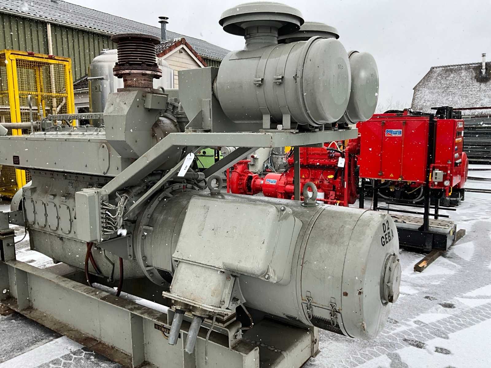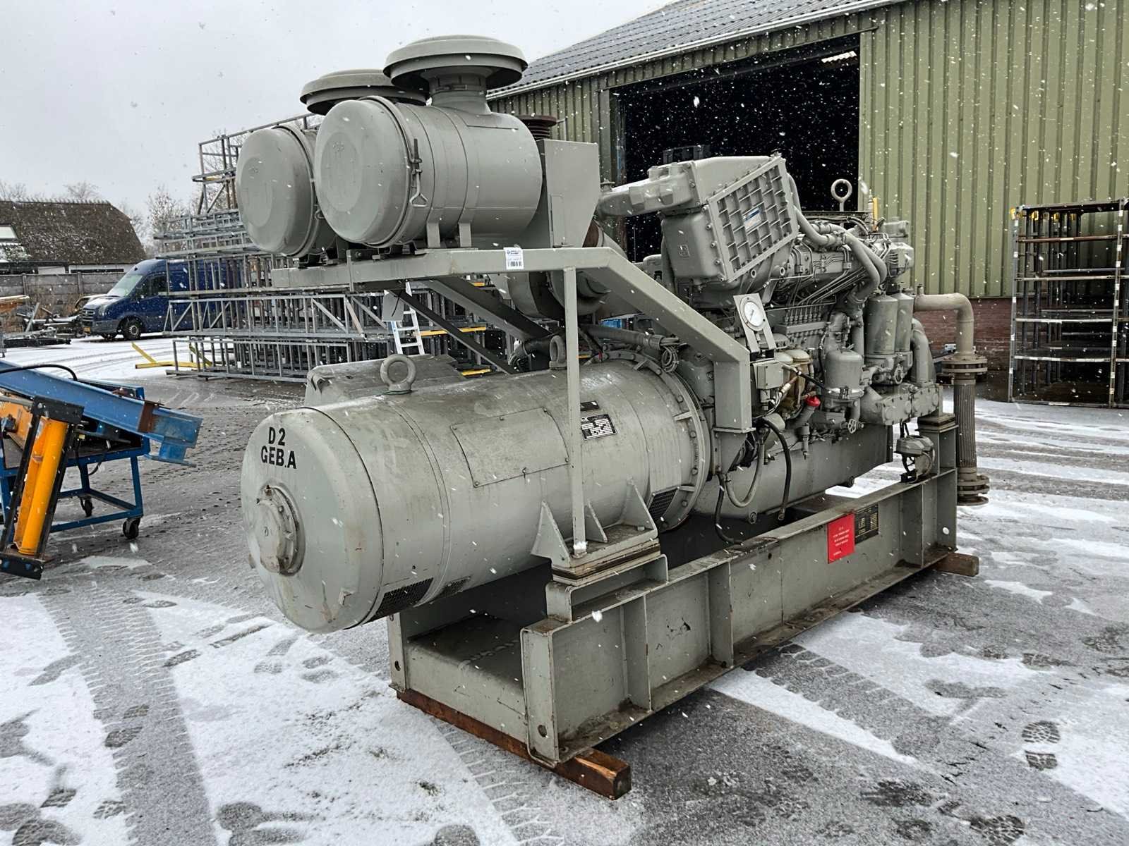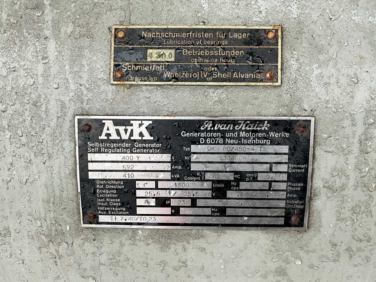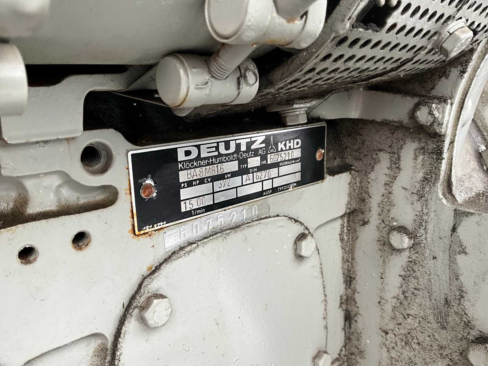 Inclusief sturingskast, afmeting circa: 730x1020x2000 mm, radiator, afmeting circa: 1150x1400x1450 mm Merk: Strüver Bouwjaar: 1981 Serienummer: 24524 Capaciteit.: 410kVA Aansluiting: 400V Motor merk: Deutz Motorcapaciteit: 372kW Generator merk: AVK Generator type: DKB 80/450 4 TS Generator capaciteit: 2.22A Totale afmeting L: 3400mm Totale afmeting Breedte: 1200mm Totale afmeting Hoogte: 2130mm