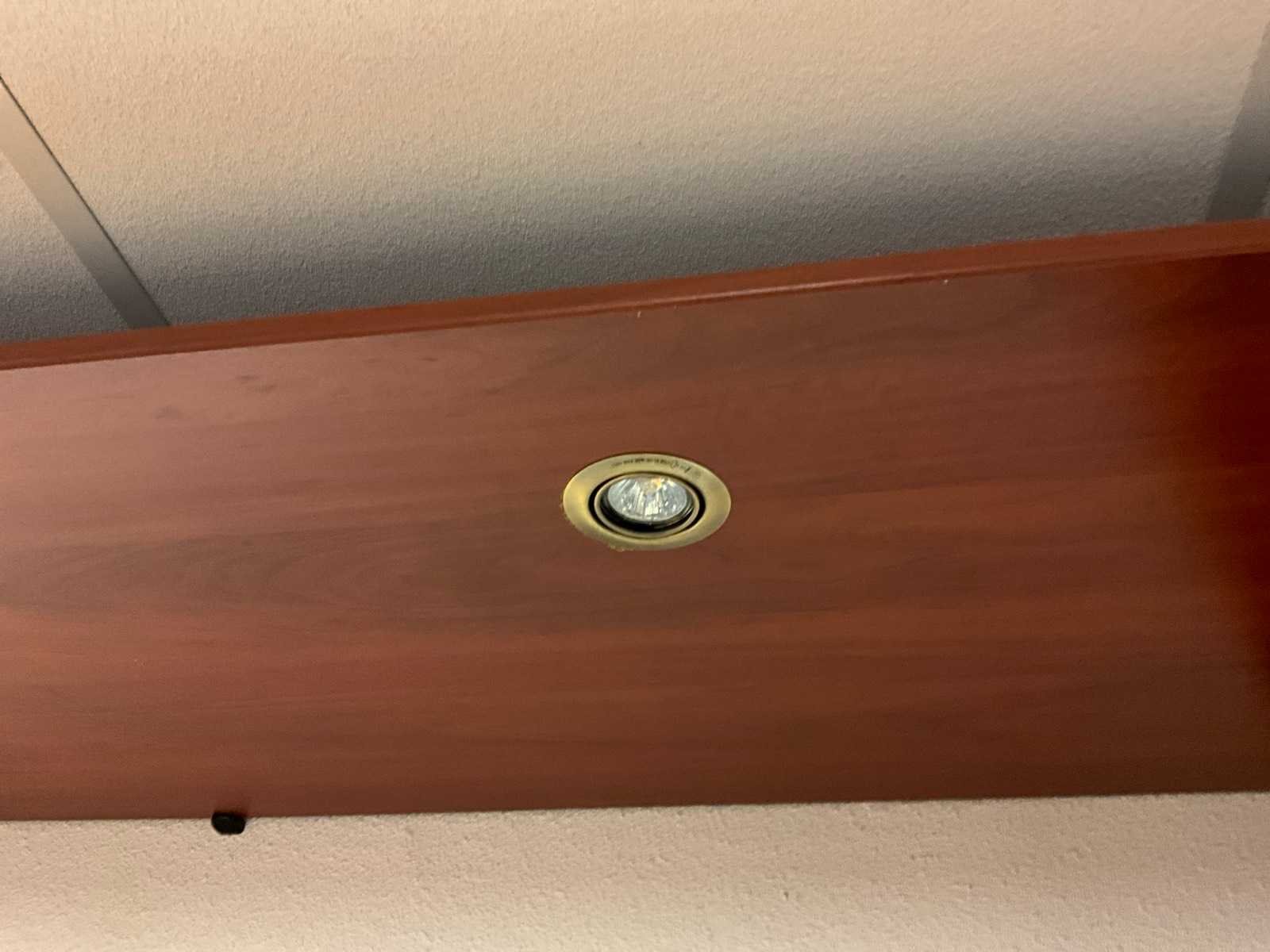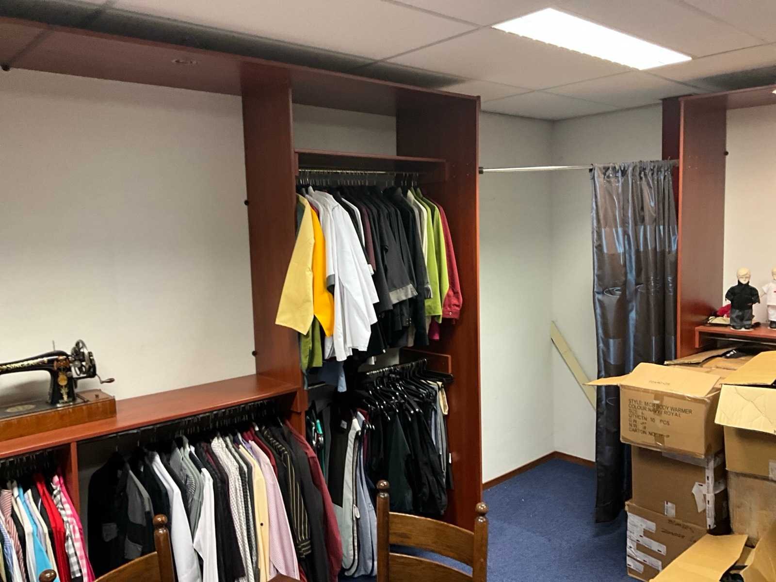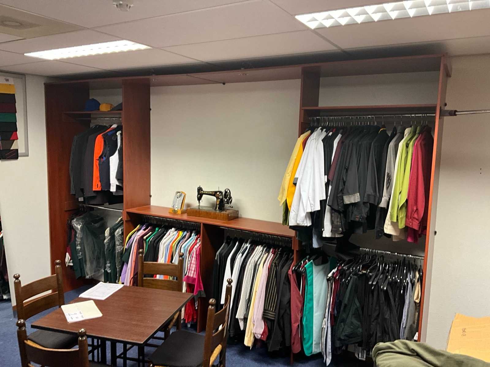 Circa 2.6m hoog, langste kast 4m breed, ingebouwde spots, inclusief gordijn tbv pasruimte, zonder inhoud
