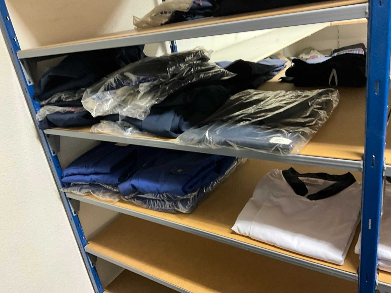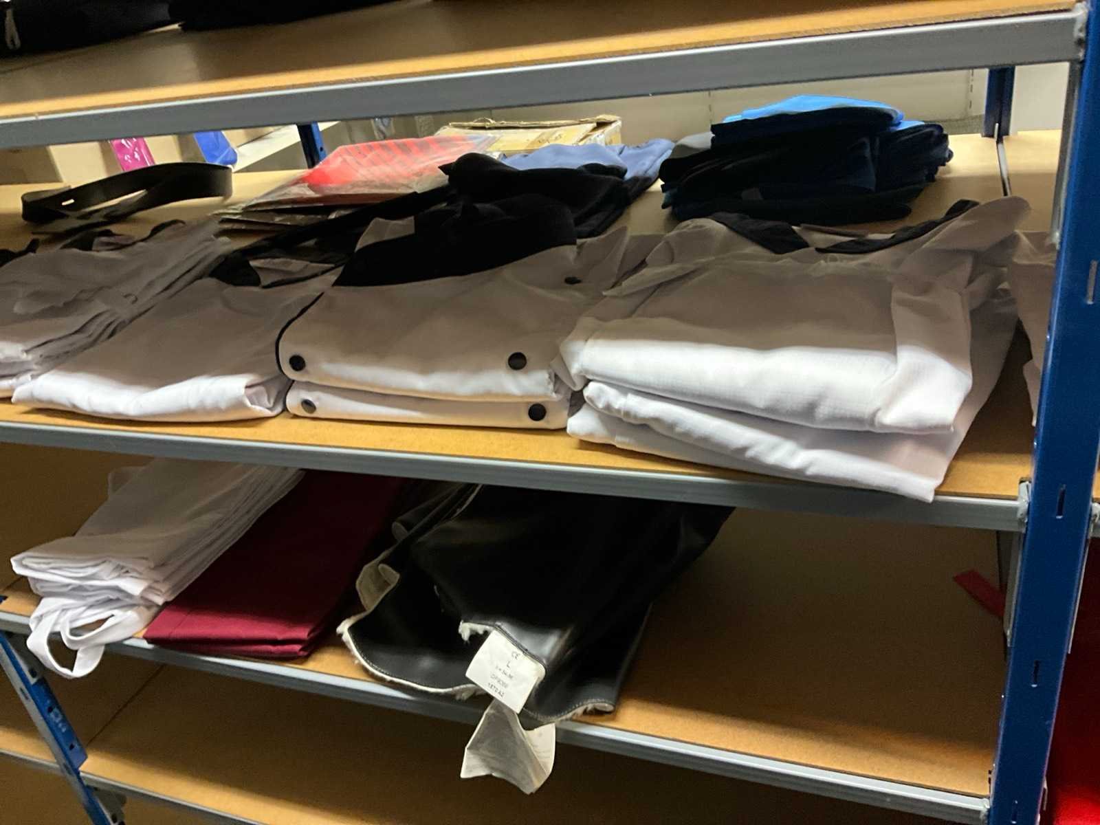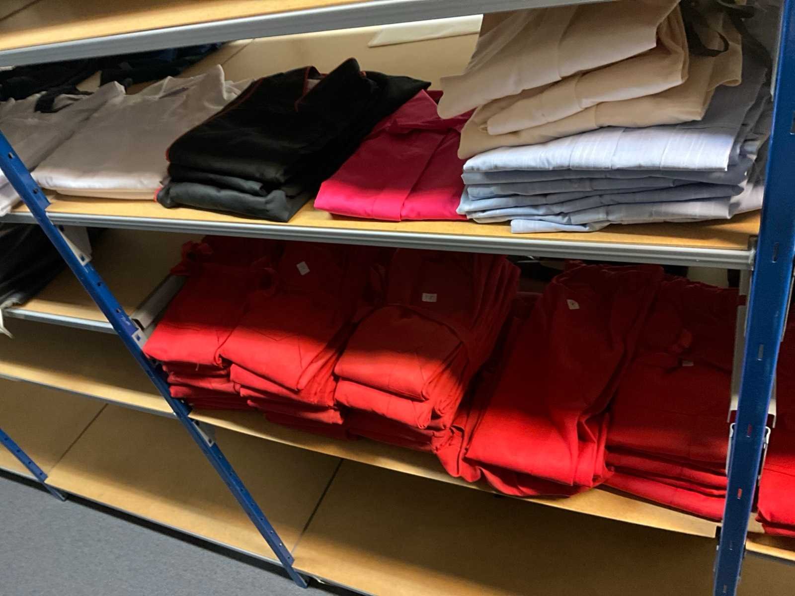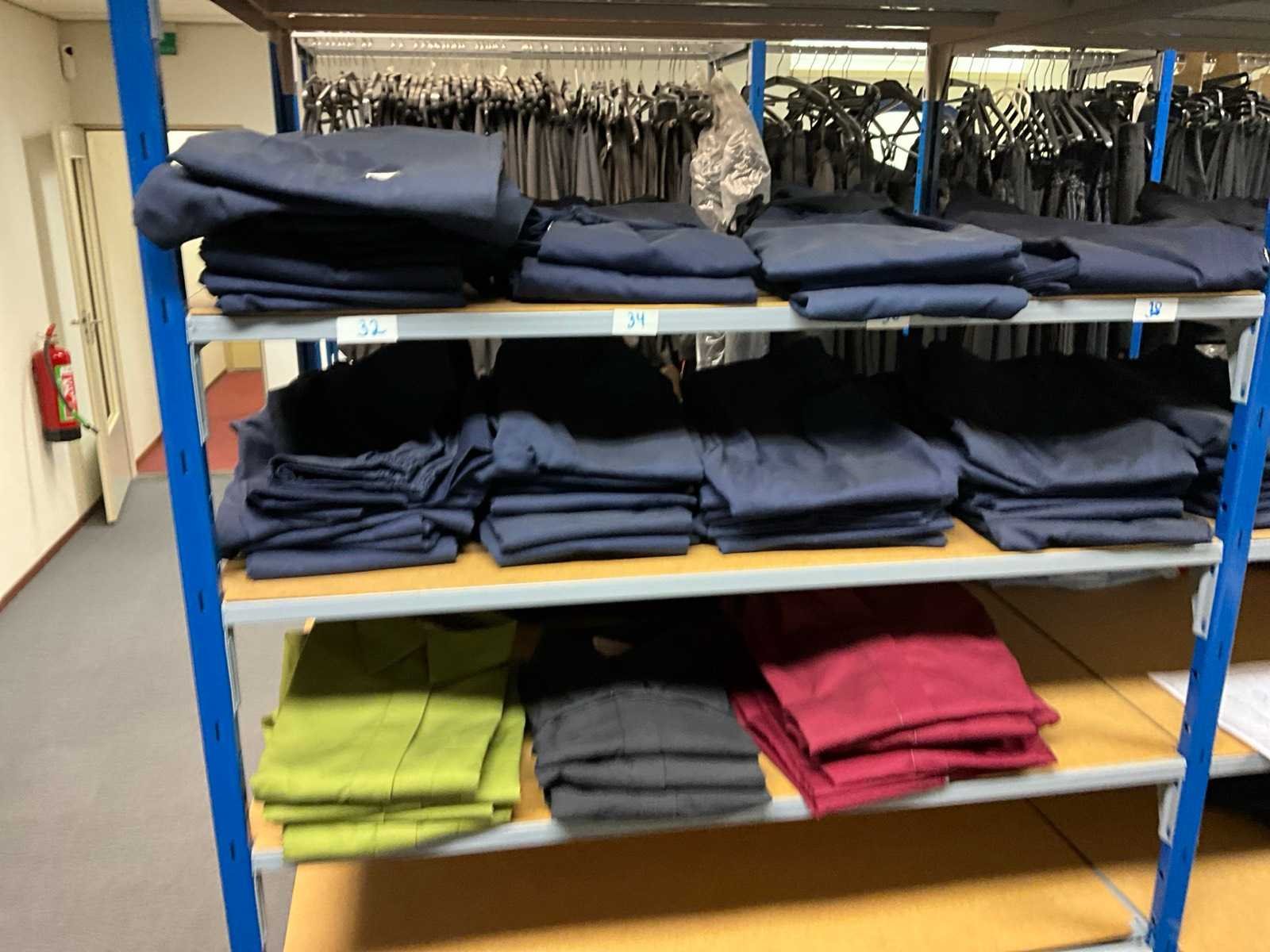 Bestaande uit circa: 65x bakkersbroek, 36x koksjas, 20x hilton, 110x foodjas, 336x werkbroek, 275x sloof en 150x stropdas/strik. Enkele andere merken, diverse maten en kleuren, exclusief stellingen Merk: Devagro