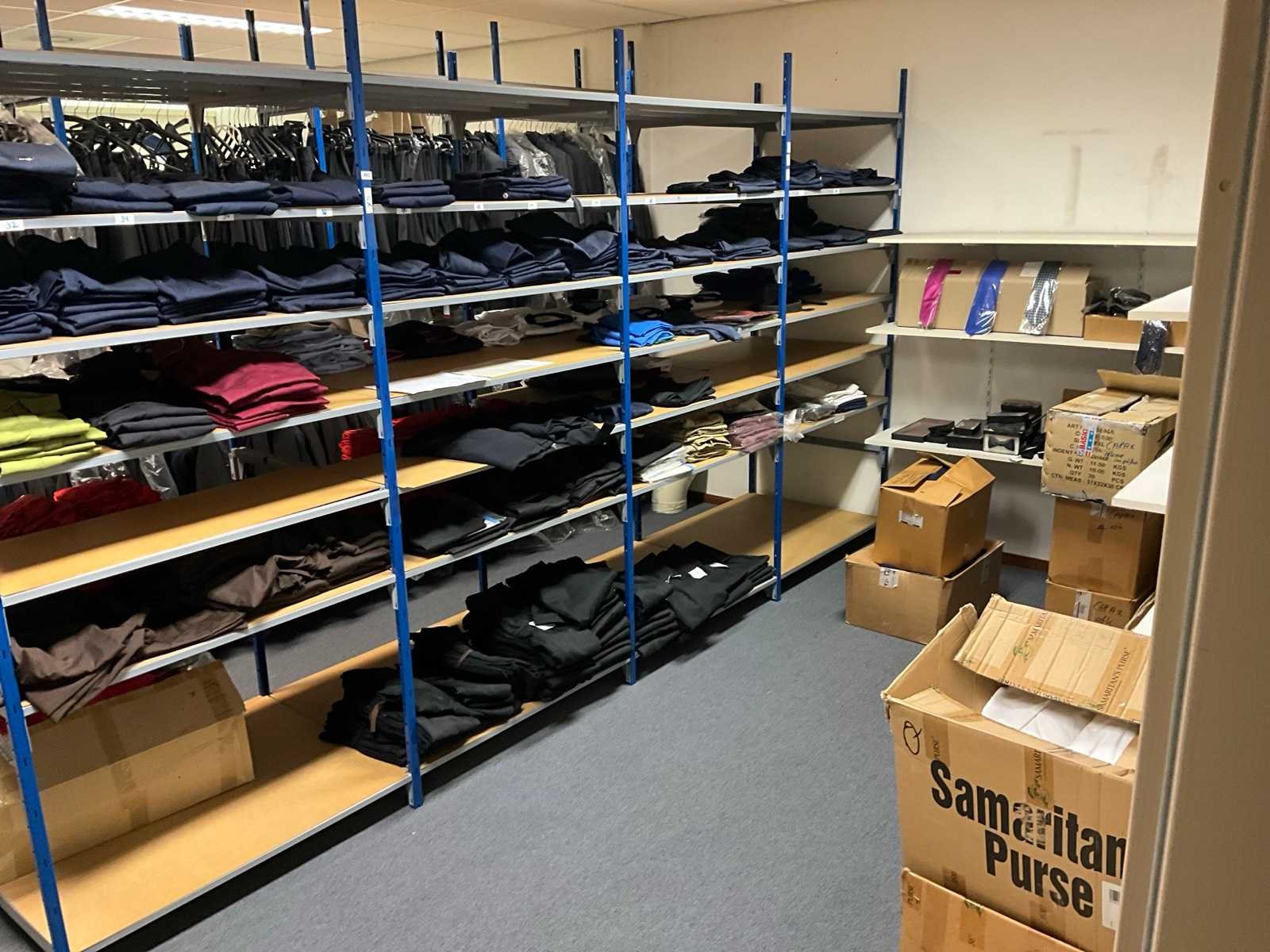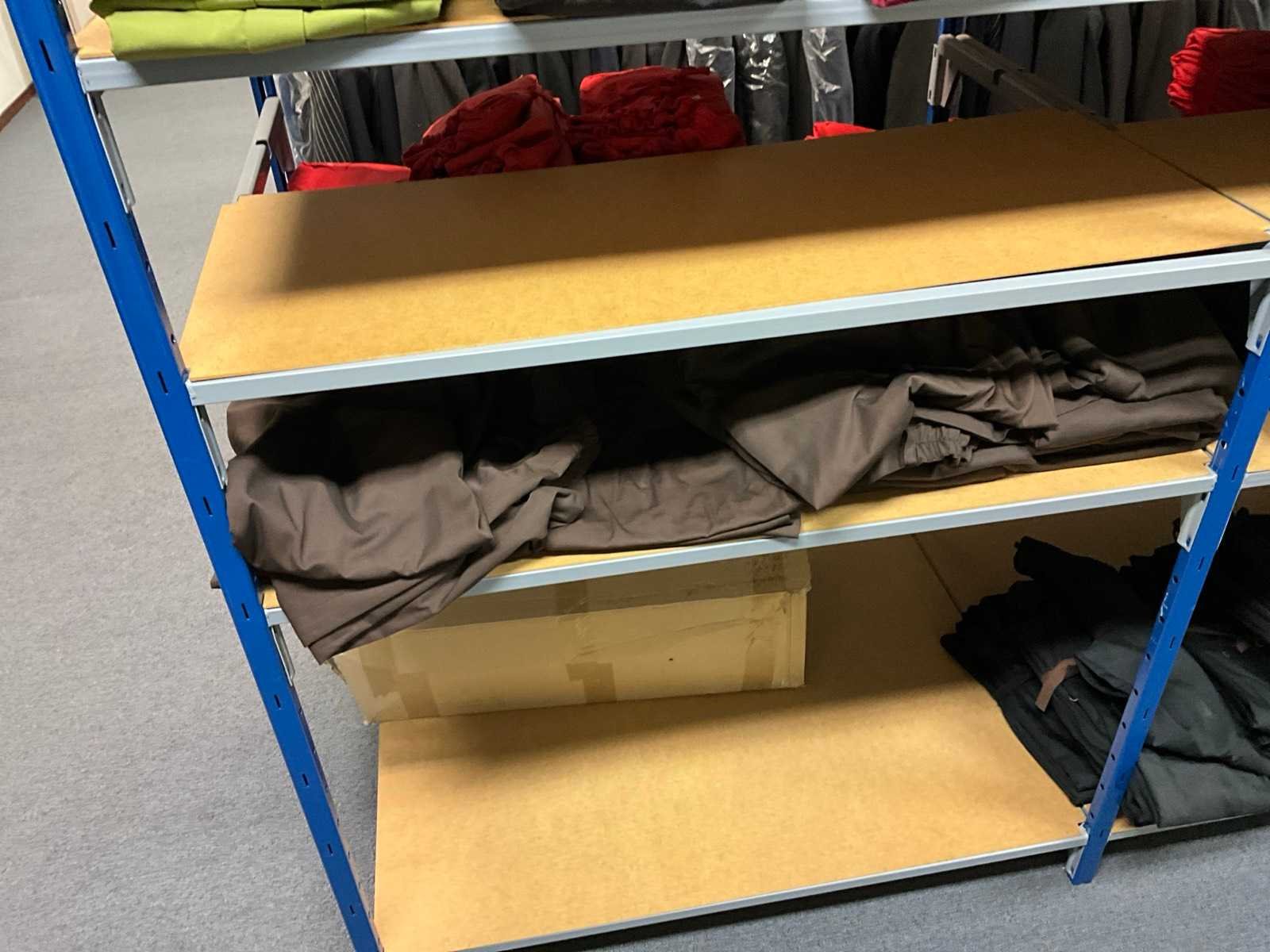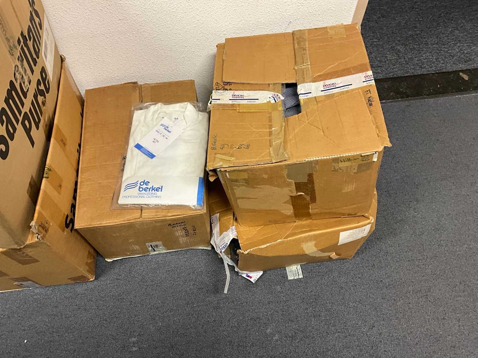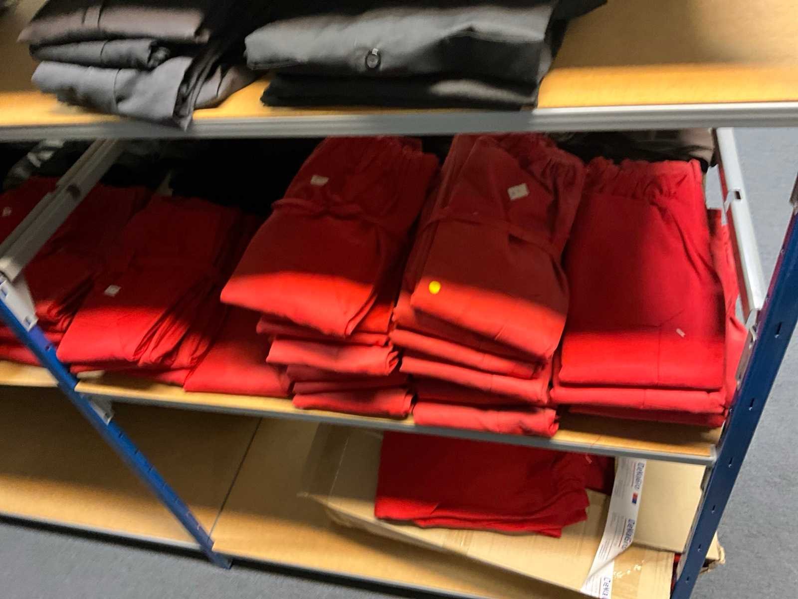 Bestaande uit circa: 65x bakkersbroek, 36x koksjas, 20x hilton, 110x foodjas, 336x werkbroek, 275x sloof en 150x stropdas/strik. Enkele andere merken, diverse maten en kleuren, exclusief stellingen Merk: Devagro