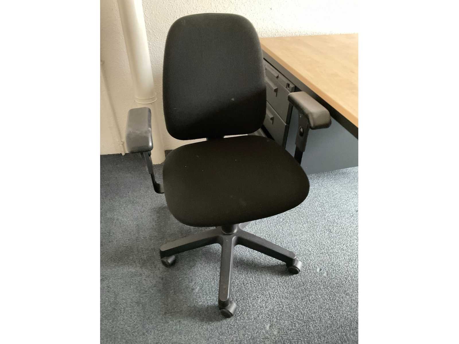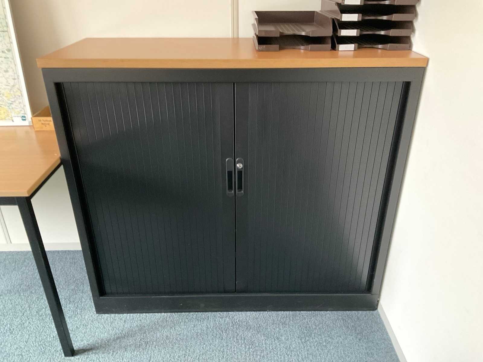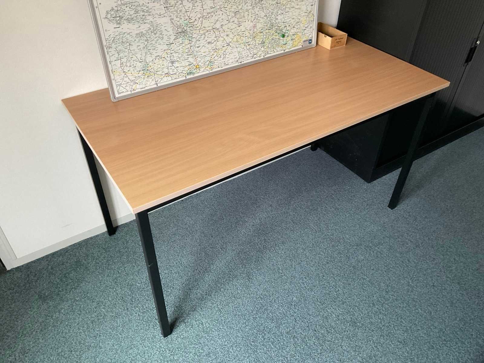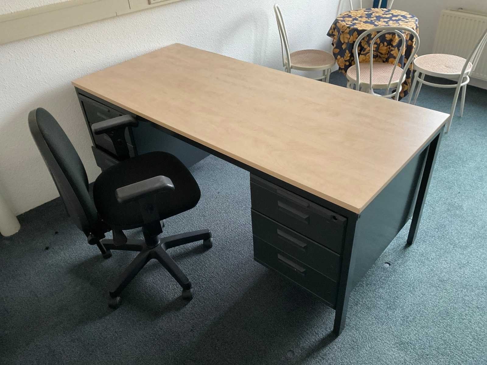Bestaande uit: (1x) bureautafel 1800x800x750mm, (1x) kantoortafel 1400x700x750mm, (1x) kaart van Nederland 1000x1300mm, (1x) roldeurkast 1220x460x1080mm, (1x) zitgroep met ronde tafel Ø 600mm, en 4 stoelen.