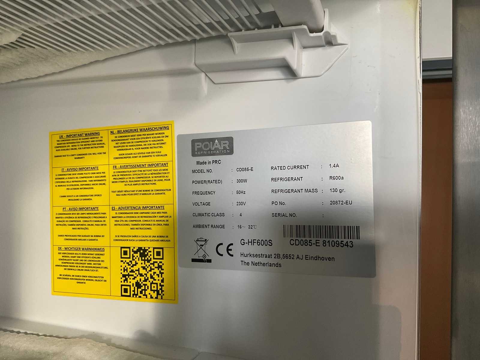 Merk: Polar Type: G-HF600 S Lengte: 70 Hoogte: 180 Breedte: 77 Digitale uitlezing: true Rvs: true Aansluiting: 230V Serienummer: CD085-E 8109543