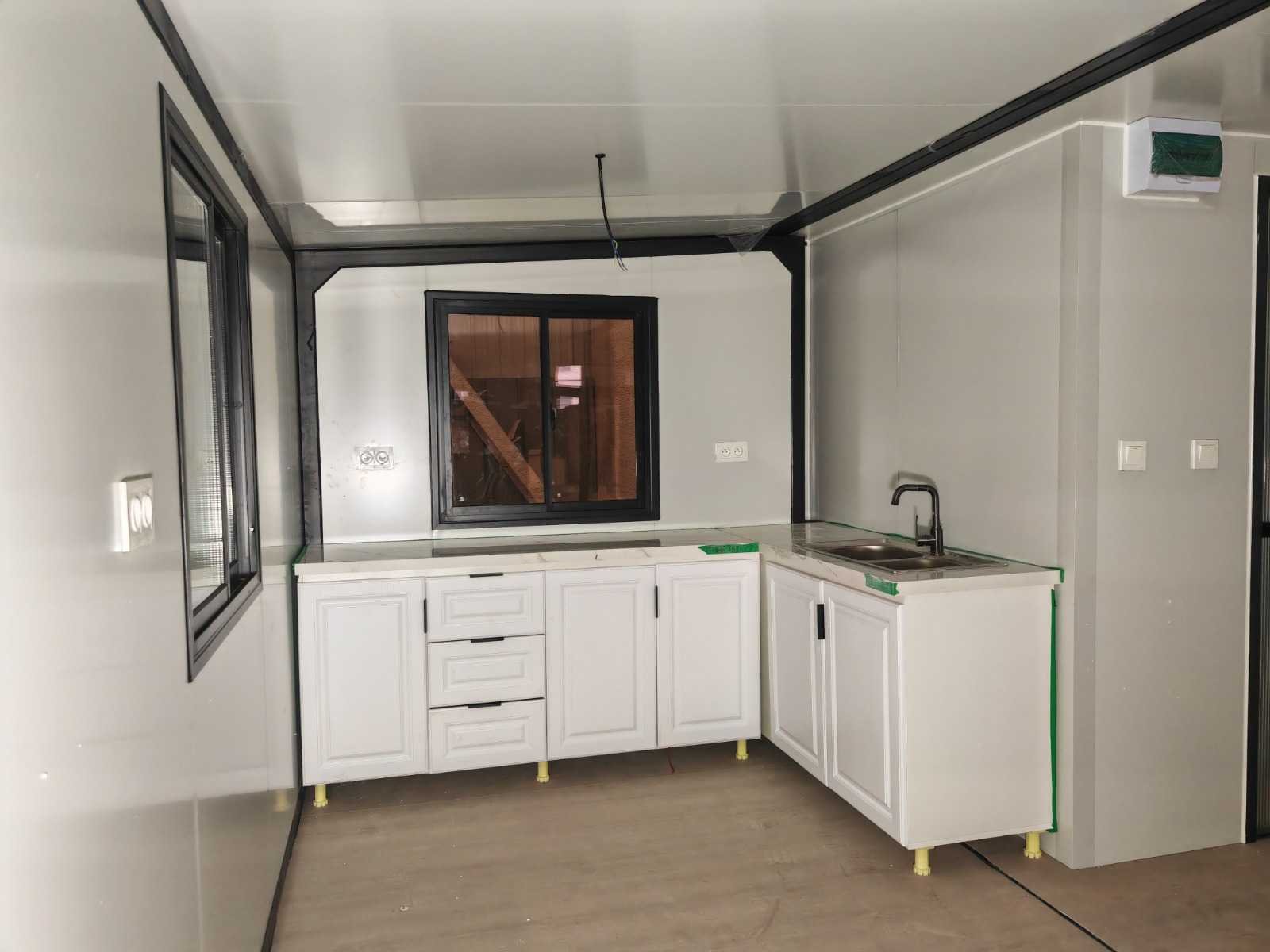 Voorzien van geïsoleerde wanden en dak; 2 slaapkamers; leefruimte met hoekkeuken; badkamer met douche, wc en wastafel; elke ruimte voorzien van verlichting en stopcontacten 230V; meterkast; PVC vloer; aluminium ramen en deuren; afsluitbaar; water, stroom en afvoer kan makkelijk aangesloten worden is voorbereid; ongebruikt en staat transport klaar (transport afmetingen 900x220x248 cm, gewicht 4500 kg) Merk: Rhino Houses Model: 54 m2 Product type: 2 slaapkamers, badkamer en keuken Gewicht: 3500 Lengte: 5900 Breedte: 6200 Hoogte: 2480