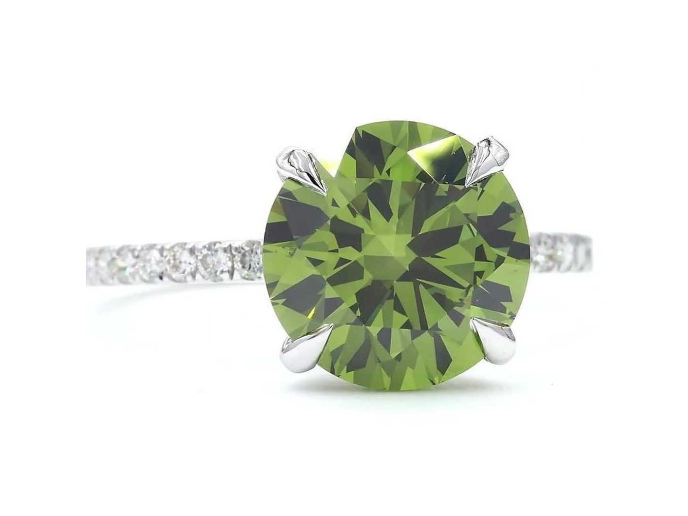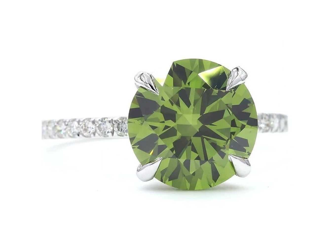 Exclusieve 18K witgouden ring Ringmaat - 54 EU / 14 IT / 6,75 US Rapportnummer IGI: LG706518578 Vorm: Rond Caraatgewicht van de hoofdsteen: 3,07. Kleur: Chique Levendig Groen Helderheid: VS1 Symmetrie: uitstekend Omringende stenen - 0,30 caraat (30 stuks) Bezichtiging op afspraak Materiaal: Witgoud Ringmaat : 54 Certificaat: Ja Lage schatting: 6800€