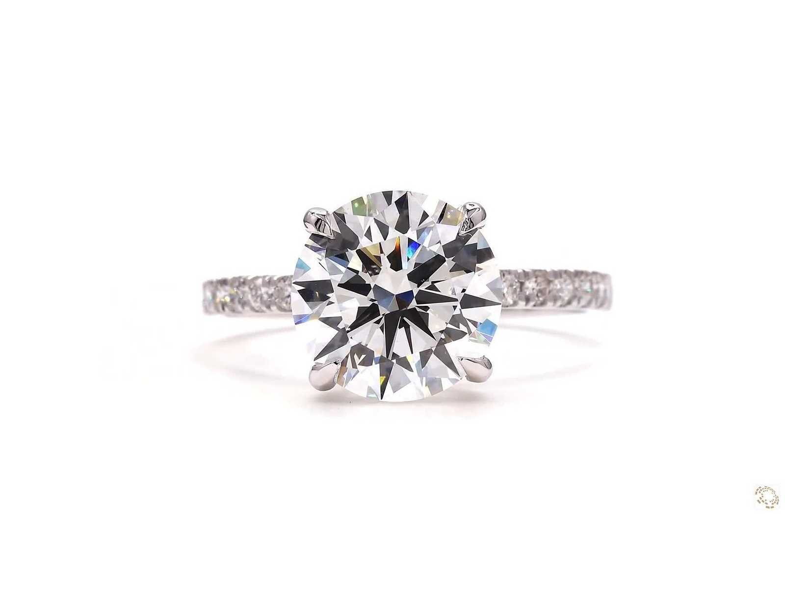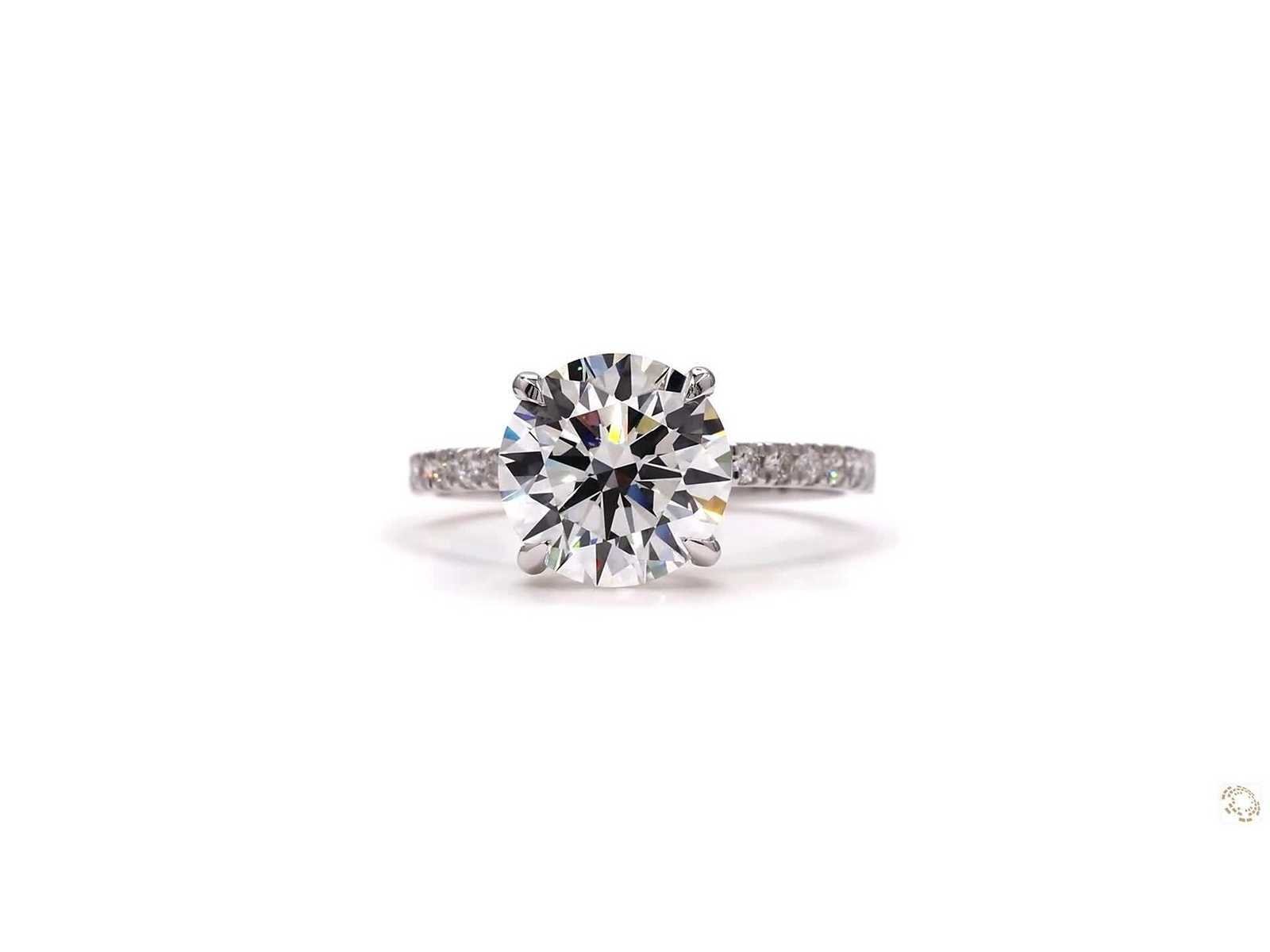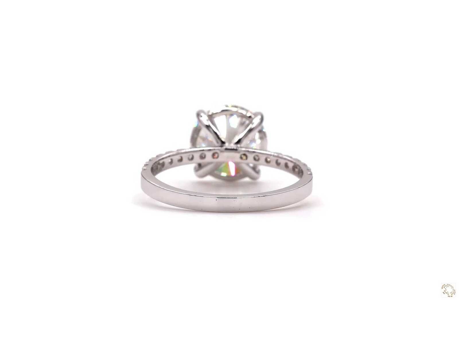 Exclusive 18K White gold ring Ring Size - 54 EU / 14 IT / 6.75 US Report Number IGI: LG733504886 Total Carat Weight - 3.34 Shape: Round Brilliant Cut Weight of main stone : 3.08 CT Color: E Clarity: VS1 Cut: Excellent Polish: Excellent Symmetry: Excellent Fluorescence: None Surrounding stones - 0.26 Bezichtiging op afspraak Materiaal: Witgoud Ringmaat : 54 Certificaat: Ja Lage schatting: 5700€