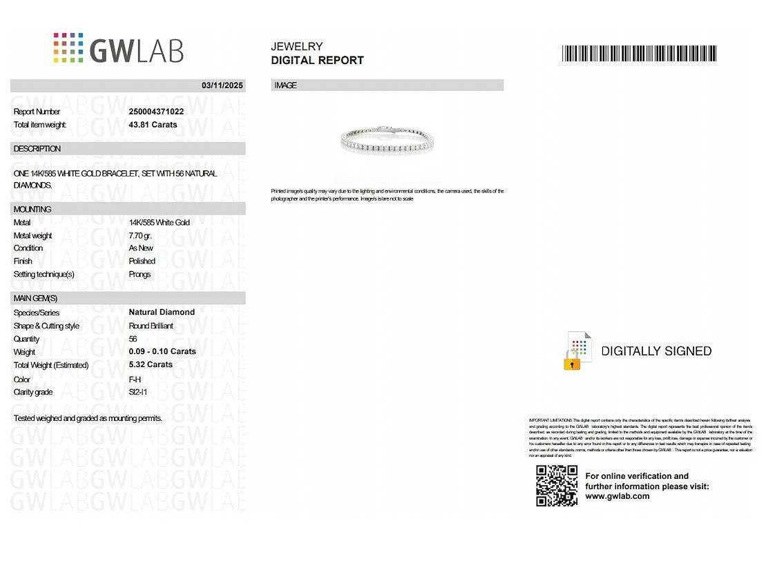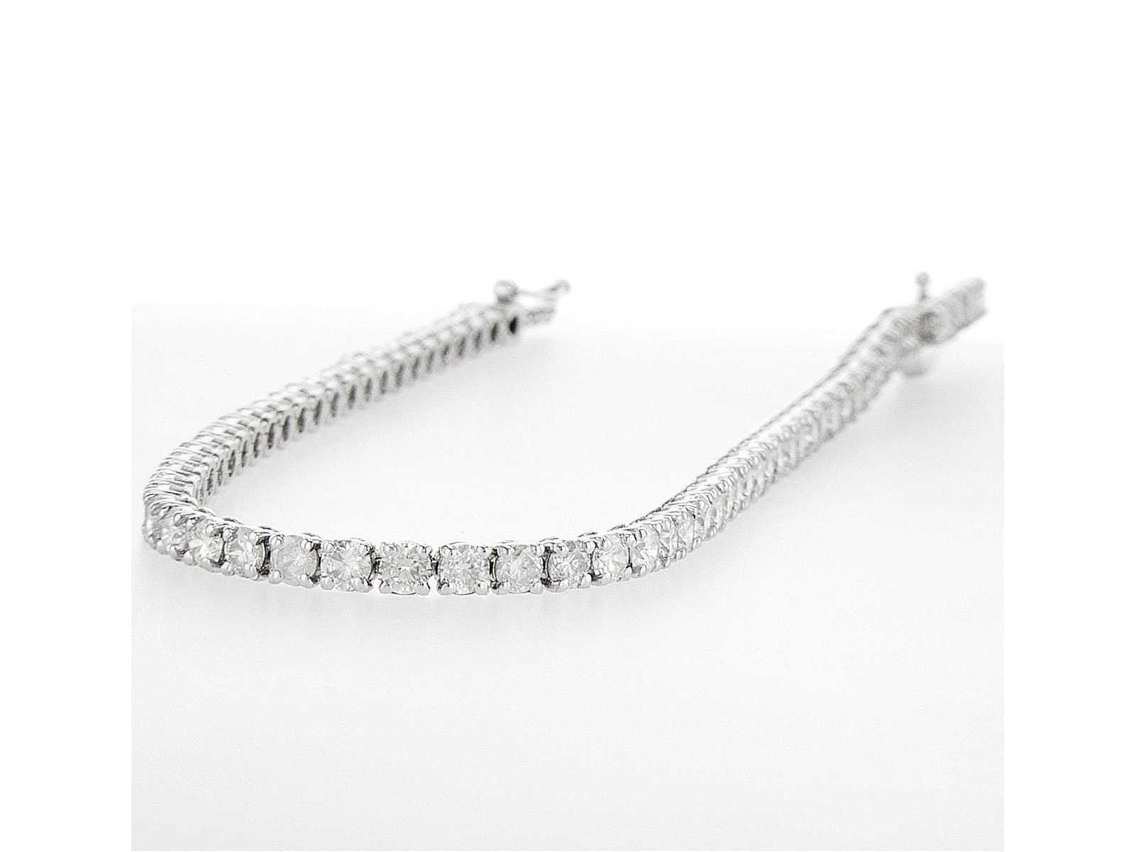 Natural Diamonds Cut: Round Brilliant Carat: 5.32cttw/ 56 stones Color: F-H Clarity: SI2-I1 Total weight: 8.76 grams Bezichtiging op afspraak Materiaal: Witgoud Lengte: 18-18,5cm Certificaat: Ja Lage schatting: 14100€