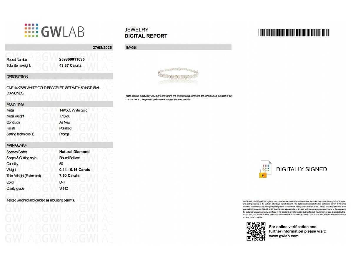 Natuurlijke diamanten Geslepen: Rond Brilliant Karaat: 7,50cttw / 50 stenen Kleur: D-H Clarity: SI1-I2 Totaalgewicht: 8,7 gram Lengte - 7 Inch / 18 cm Bezichtiging op afspraak Materiaal: Witgoud Maten: 18 cm Certificaat: Ja Lage schatting: 13900€