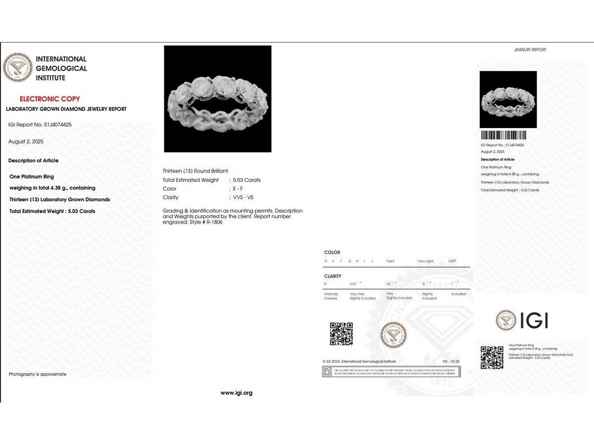 Platinum950 eeuwigheidsring Karaat- 5.03 Kleur - E, F Helderheid - VVS-VS Gewicht - 4,38 gram Aantal door de mens gemaakte diamanten - 13 51J4074425 Ringmaat - 54 EU / 14 IT / 6.75 US Bezichtiging op afspraak Materiaal: Platina Ringmaat : 54 Certificaat: Ja Lage schatting: 7300€