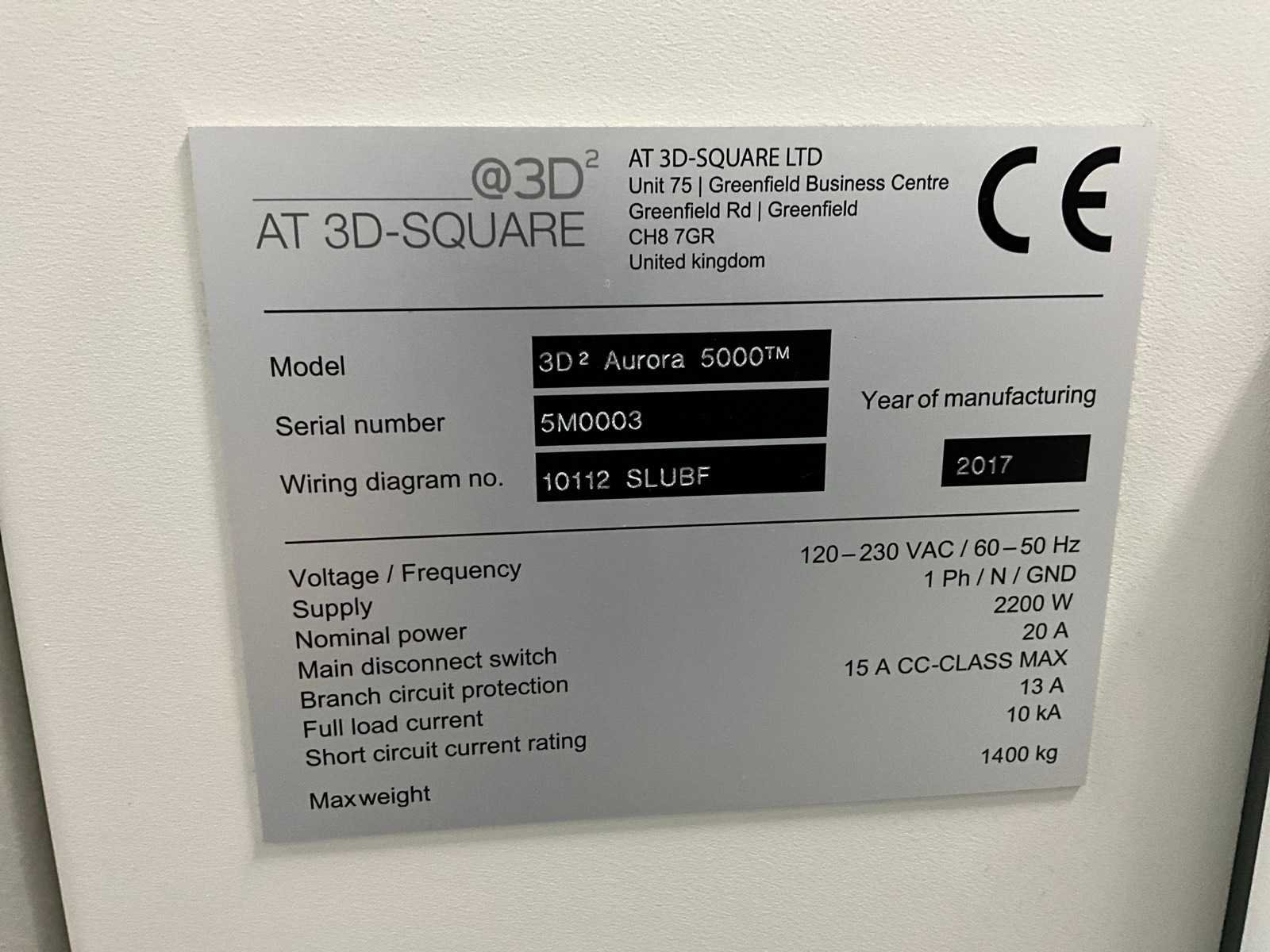 S/n 5M0003, Beckhoff scherm tbv bediening, 2200W, netwerk aansluiting, inclusief toebehoren Merk: At 3D-square Model: Aurora 5000 Printtechniek: SLA Printoppervlak hoogte: 584mm Printoppervlak breedte: 508mm Printoppervlak diepte: 508mm Gewicht: 1400kg Lengte: 145cm Breedte: 197cm Hoogte: 230cm