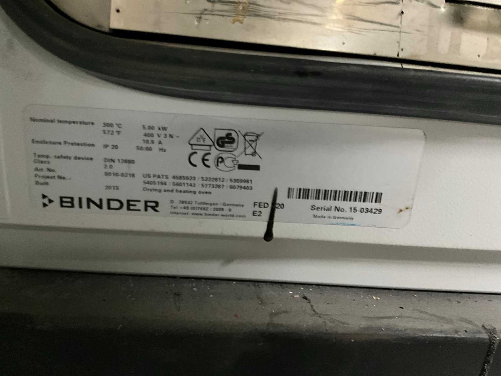 Vermogen: 5,0kW. Merk: Binder Type: FED720 Bouwjaar: 2015 Serienummer: 15-03429 Kamer afmeting l: 1000mm Kamer afmeting b: 580mm Kamer afmeting h: 1200mm Temperatuurbereik min.: 5°c Temperatuurbereik max.: 300°c Aansluiting: 400V Totale afmeting L: 1230mm Totale afmeting Breedte: 880mm Totale afmeting Hoogte: 1860mm