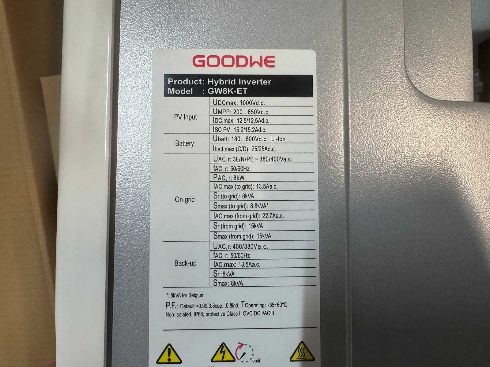 Batterijen: 4x GoodWe Lynx LX F3.3-H: 102,4V 3,27kWh BMS: Goodwe Lynx Home F PCU zonnepanelen: 20 x Jinko JKM440N-54HL4R-B (440 wp) Full Black omvormer: Goodwe Hybrid Inverter 8K ET (3 phase) totaal vermogen: 8800 Wp vermogen: 440 Wp per zonnepaneel conditie: nieuw Merk: Jinko Solar Type: JKM440N-54HL4R-B Max. dc power: 440W Eigen gewicht: 22kg Totale afmeting L: 1762mm Totale afmeting Breedte: 1143mm Totale afmeting Hoogte: 30mm