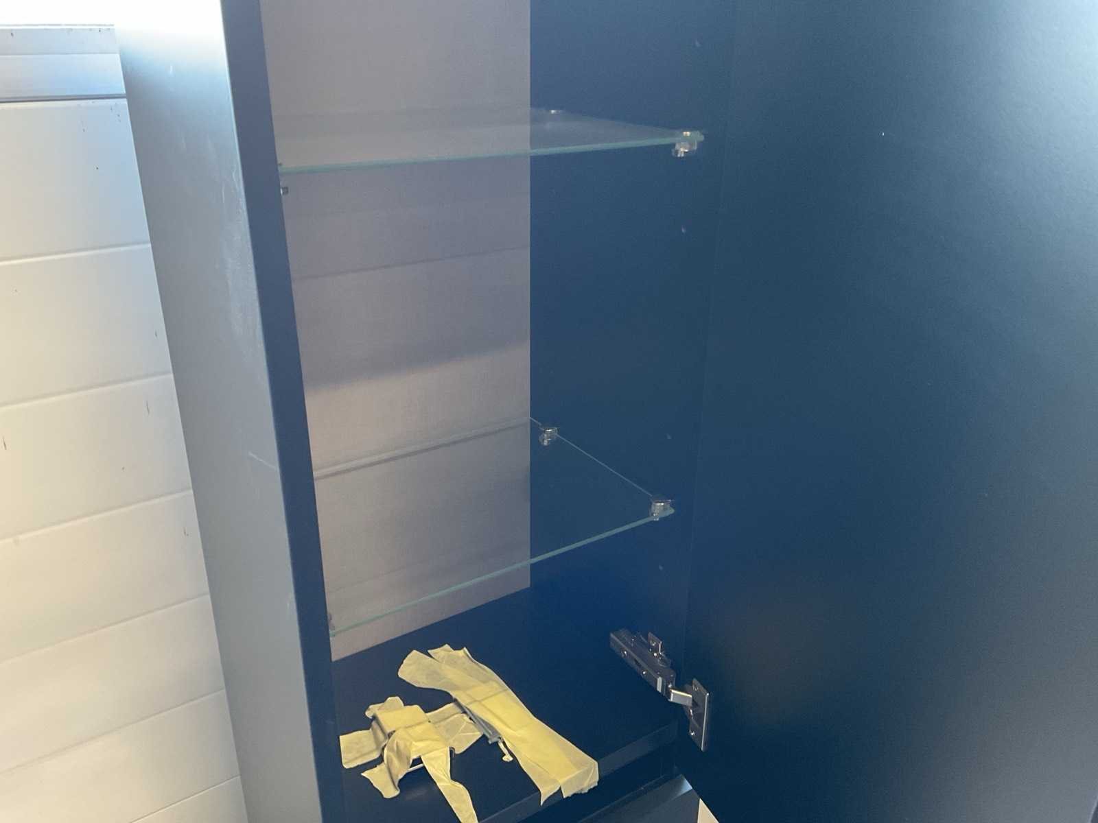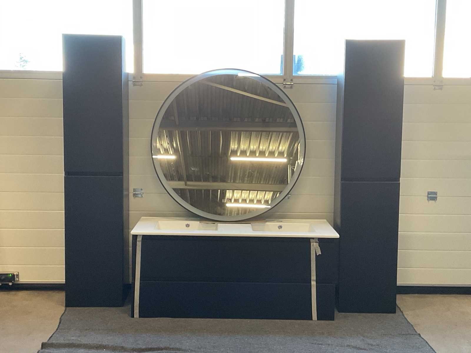 Bestaande uit: 1x dubbele wastafel met kraangat en overloop, wit, L121.5xB46.5cm, 1x spiegel met verlichting + verwarming, D=100cm, 1x onderkast met 2x soft-close lade, 2x hoge hangkast met 2x deur en glazen schappen, H165xB35xD30cm en 2x Viega sifon, type 108 694. Model: 120cm Hoogte: 52cm Lengte: 122cm Breedte: 47cm Spiegel met verlichting: Ja Onderkast: Ja Lades: 2 Softclose: true Zijkast: Ja (2x)
