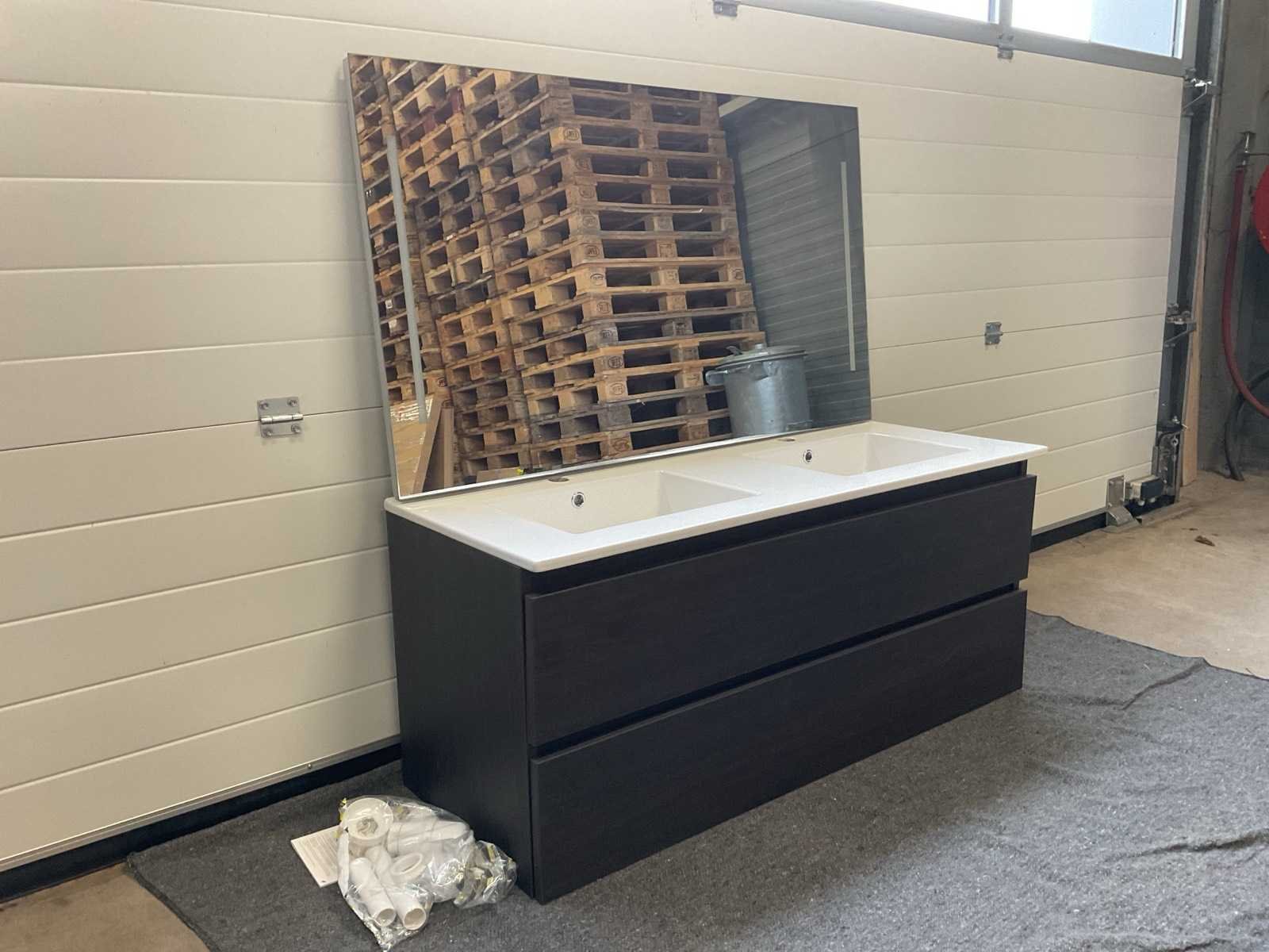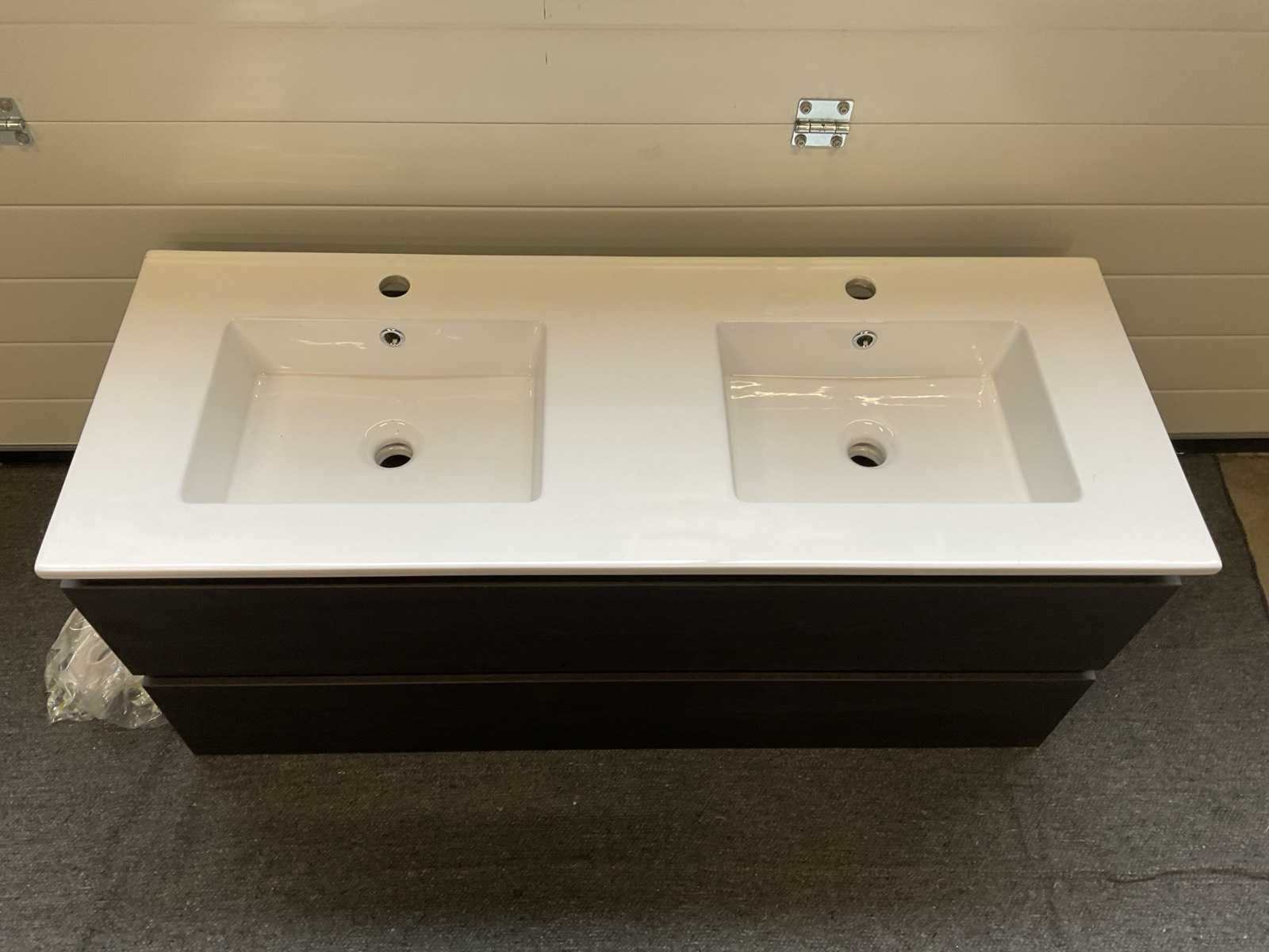 Bestaande uit: 1x dubbele wastafel met 2x kraangat en 2x overloop, wit, L121.5xB46.5cm, 1x onderkast met 2x soft-close lade, 1x spiegel met verlichting, L120xB70xD3.5cm en 1x Viega sifon, type 108 694. Model: 120cm Hoogte: 52cm Lengte: 121cm Breedte: 47cm Spiegel met verlichting: Ja Onderkast: Ja Lades: 2 Softclose: true
