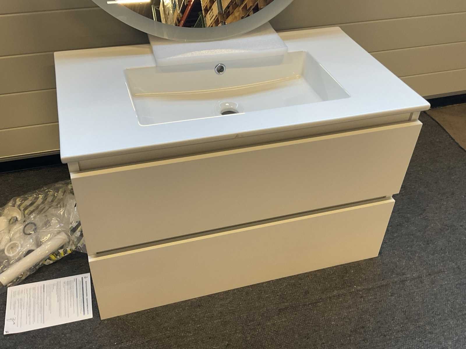 Bestaande uit: 1x wastafel met kraangat en overloop, L81xB46cm, 1x onderkast met 2x soft-close lade, 1x spiegel met verlichting + verwarming, D=80cm en 1x Viega sifon. Model: 80cm Hoogte: 52cm Lengte: 81cm Breedte: 46cm Spiegel met verlichting: Ja Onderkast: Ja Lades: 2 Softclose: true