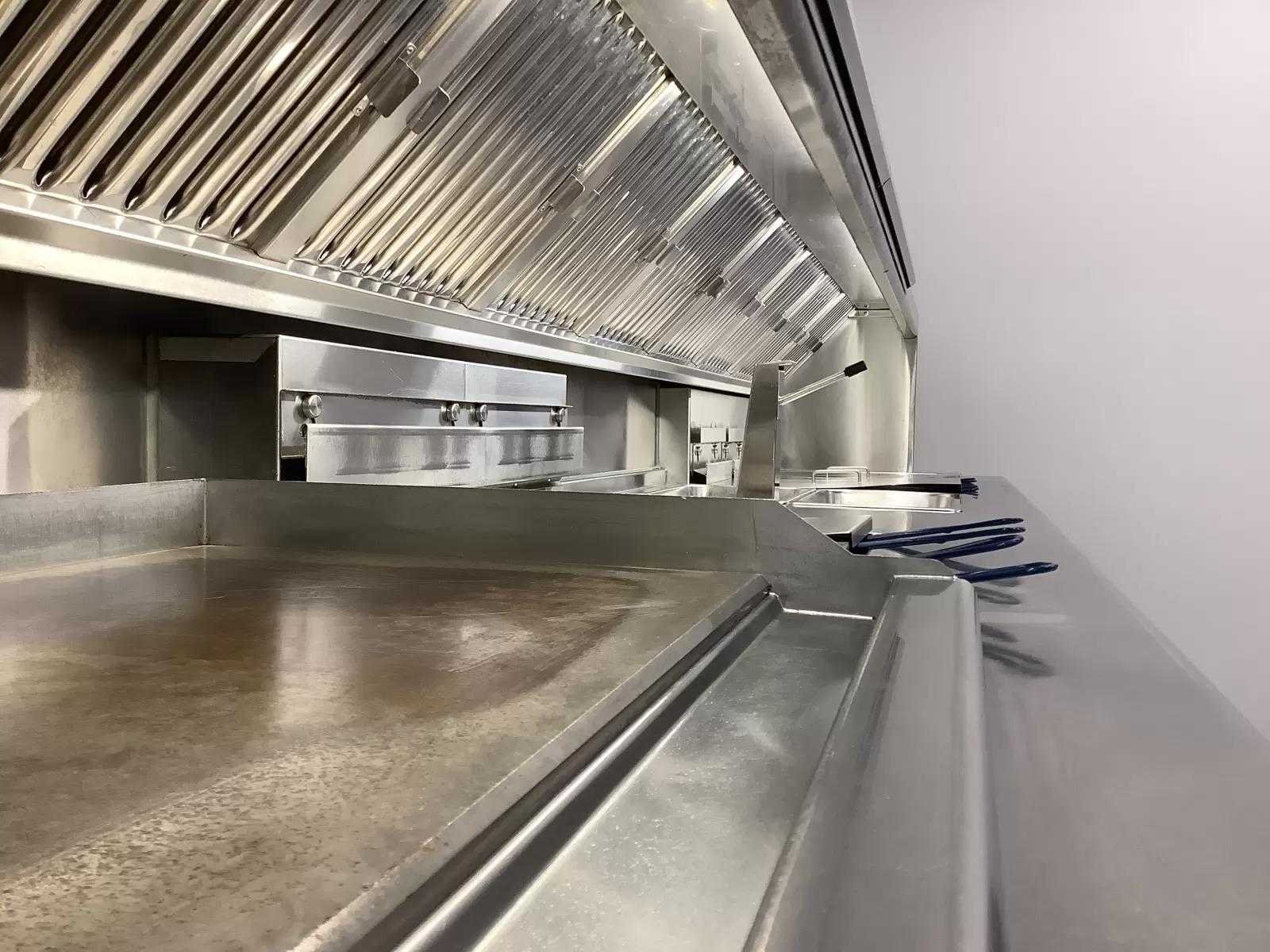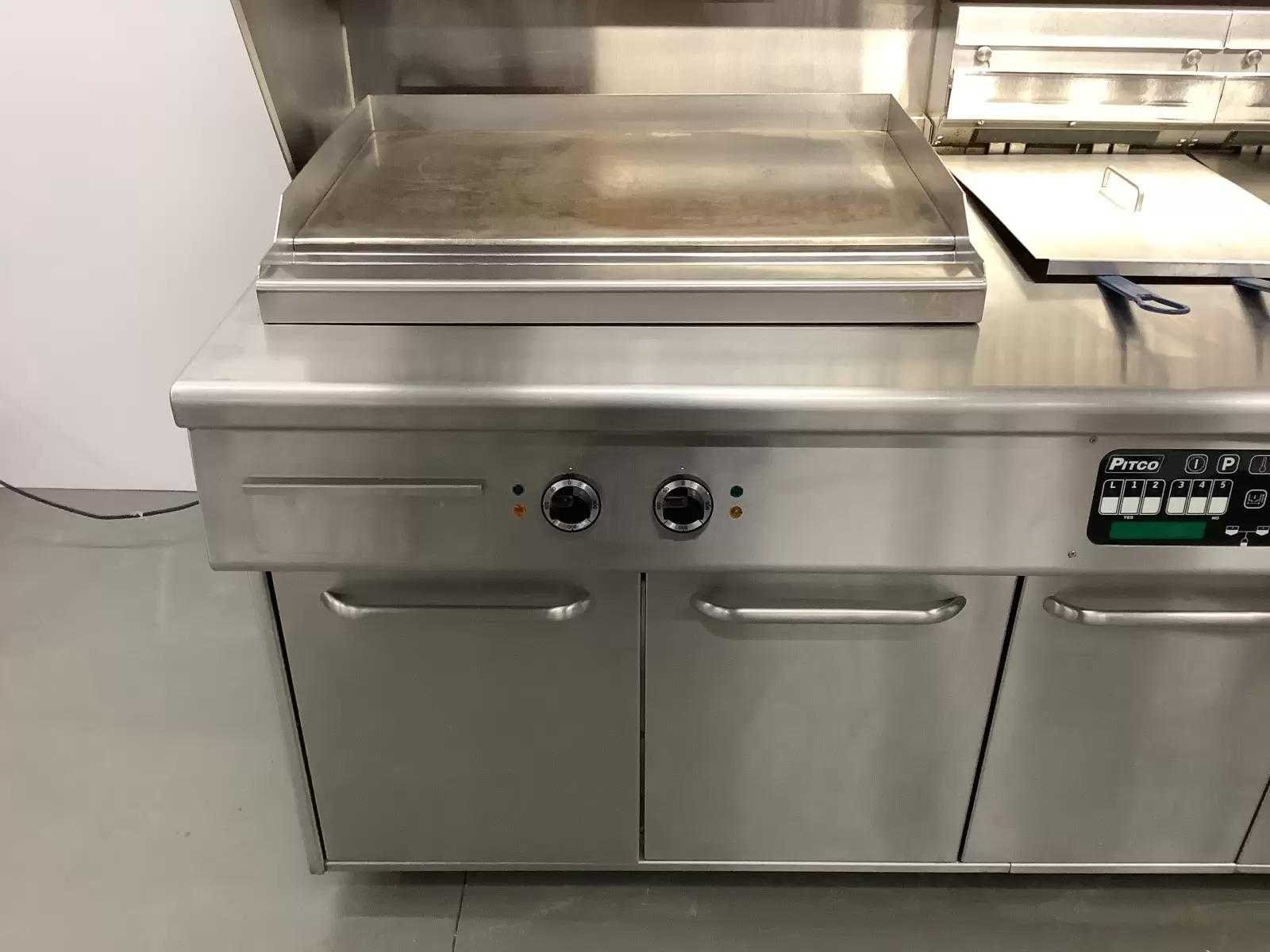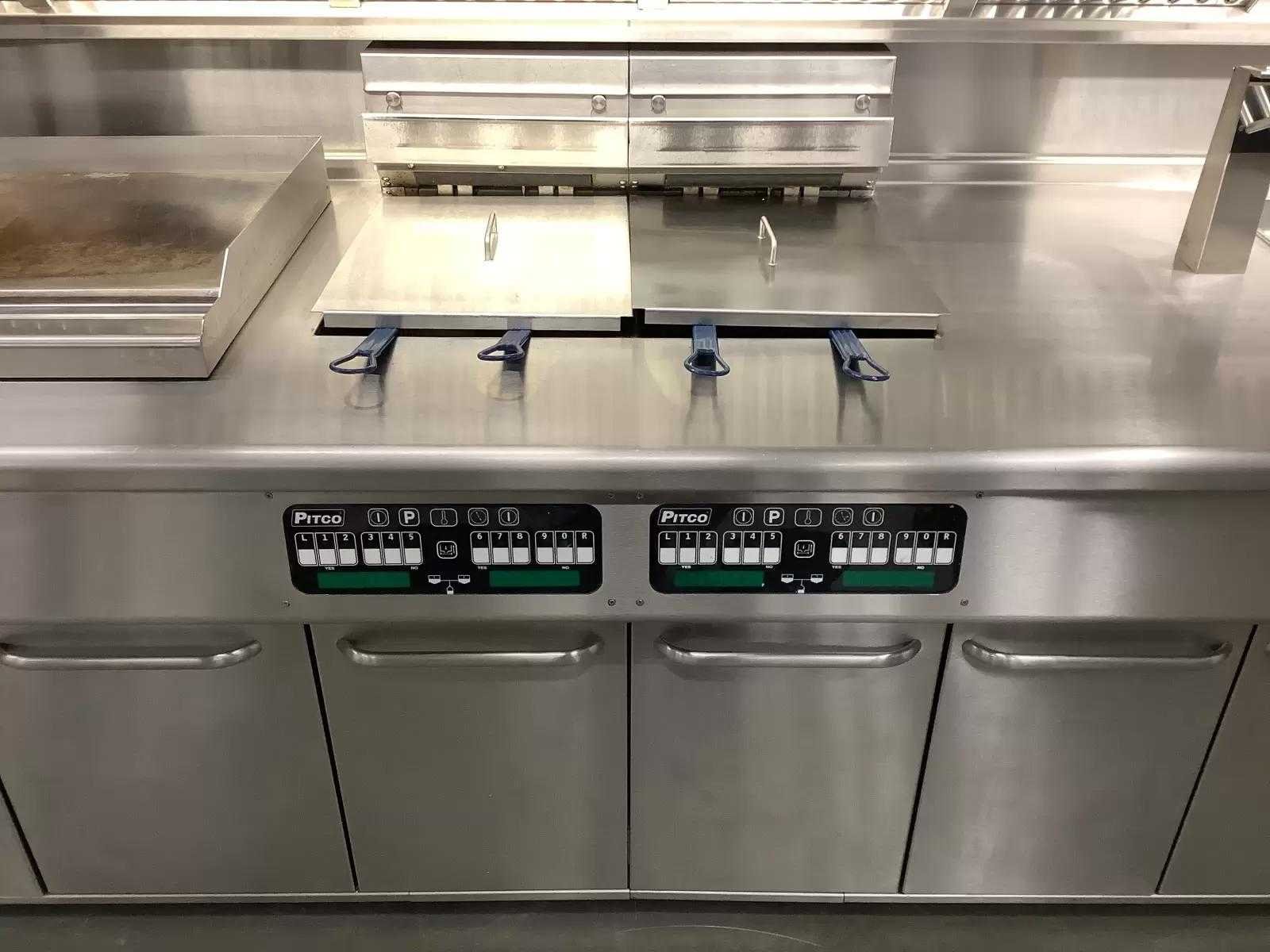 Voorzien van: 2x Pitco SELV14 Friteuse, 2x Pitco SE14S Friteuse, 1x Bakplaat (Bak oppervlakte LxB: 80x50 cm) aansluitwaarde 400V, 1x Bain Marie (Capaciteit 2x 1/1 GN), Elektrische dubbele Sausdispenser, Uitschepbak, Afzuiging (Zonder motor) en verlichting. Extra informatie: Bakcapaciteit 60 kg per uur per pan. Olie capaciteit 18-23 kg per pan. Elektronisch thermostaat, instelbaar van 120 tot 190 graden. Merk: Pitco Model: SELV14 / SE14S Type: SELV14 / SE14S Lengte: 405cm Breedte: 90cm Hoogte: 160cm Vermogen (kW): 81 Spanning: 400
