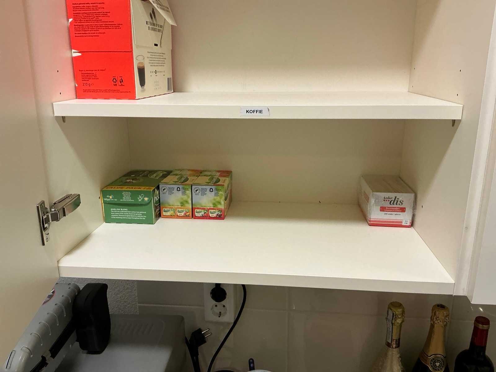 Diverse levensmiddelen, servies, bestek, bedrijfsbenodigdheden, kantoorgerief, dozen, schoonmaakmiddelen etc.