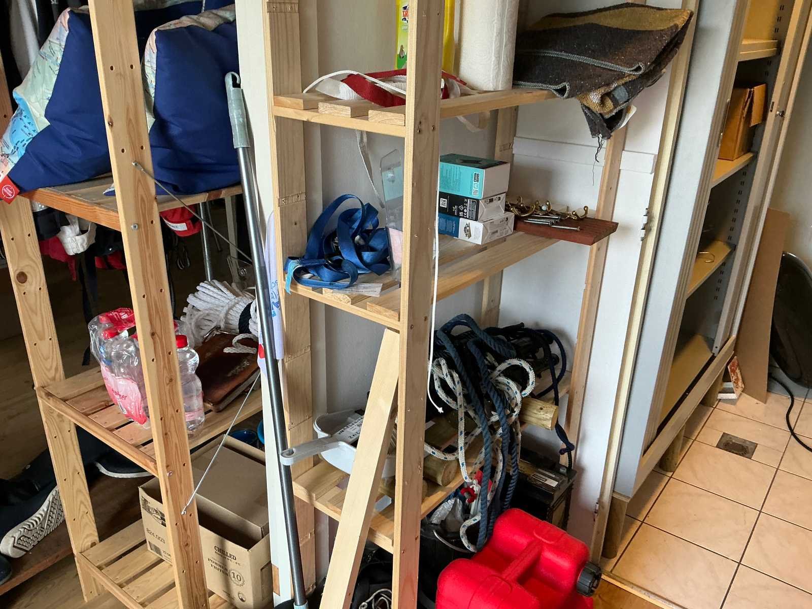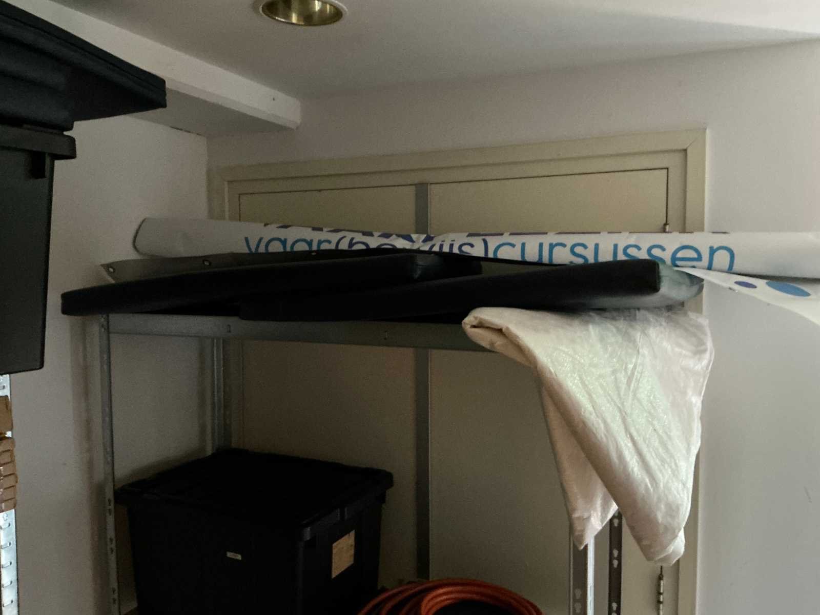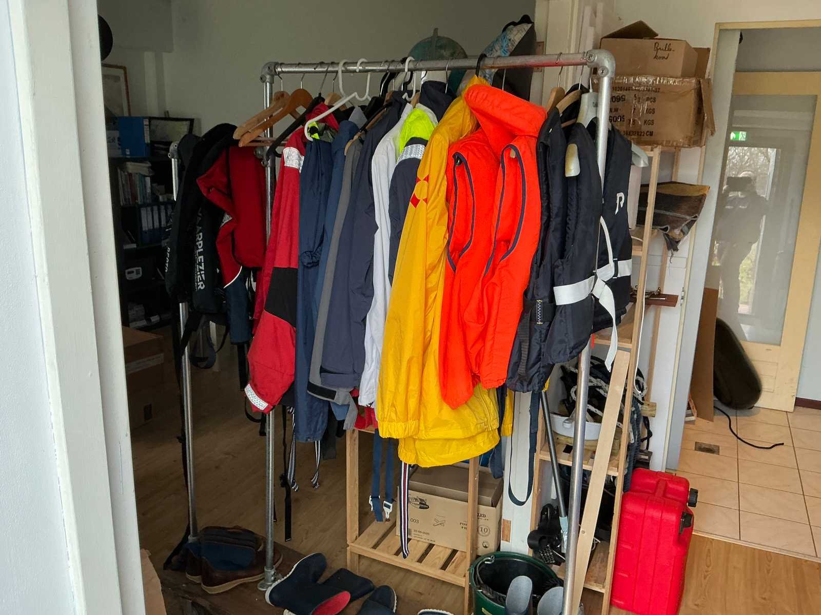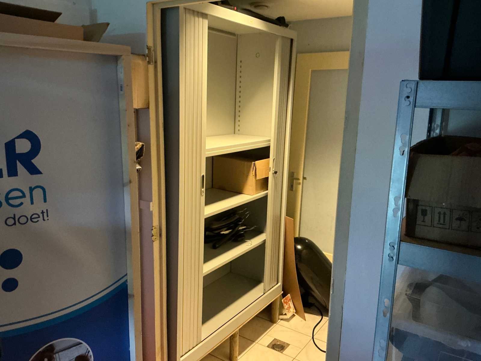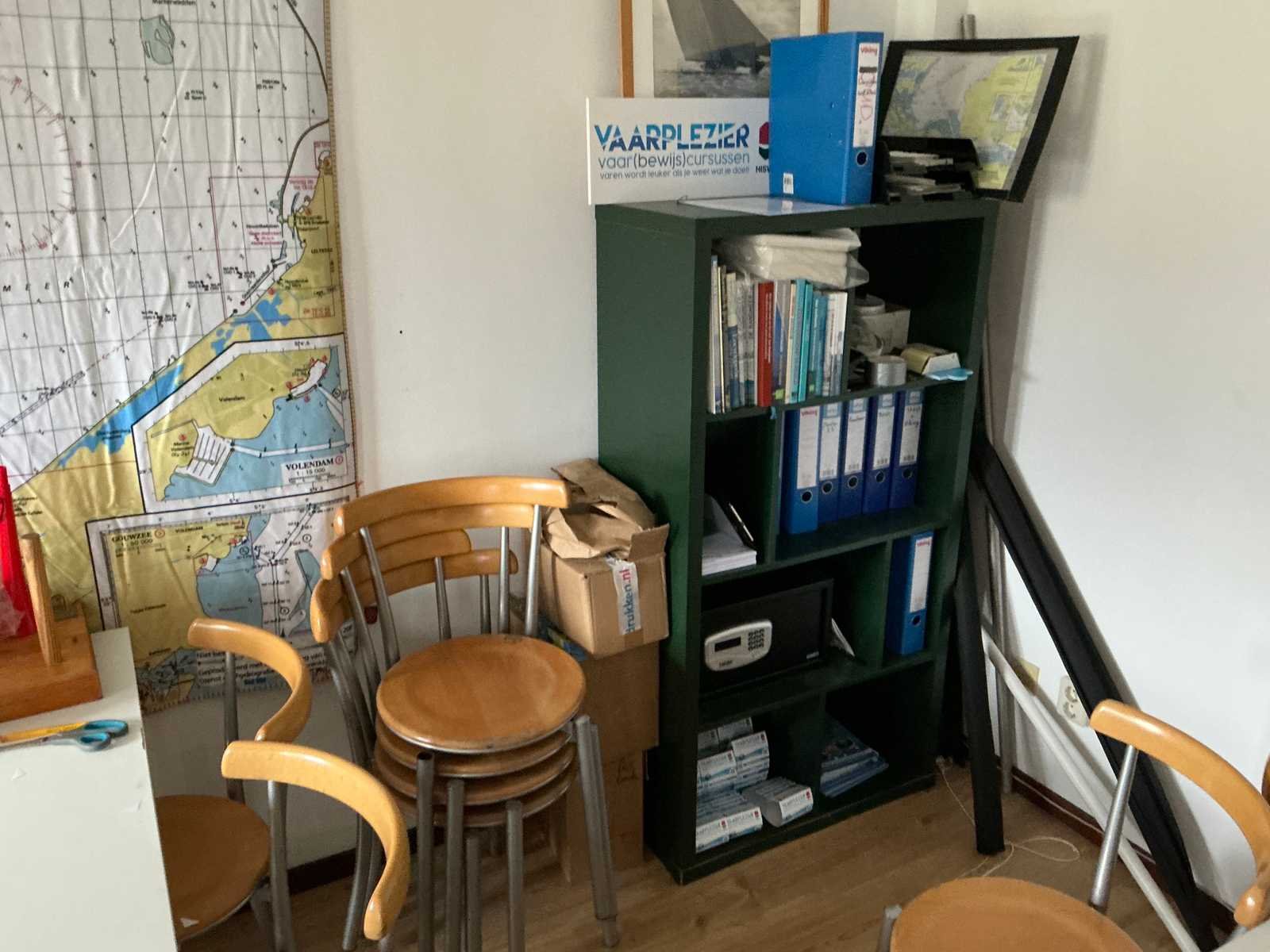 Bestaande uit 3x stellingkast met inhoud (gereedschap, watersport toebehoren, schoonmaak artikelen etc), 1x archiefkast 120x45x195cm, boeien, kantoortafel met stoelen, halfronde archiefkast, console op statief, 1 vergadertafel met stoelen, Etna vaatwasser, diverse keuken inhoud, bergkast met divers kantoorgerief, kledingrek met watersport kleding, printer, etc
