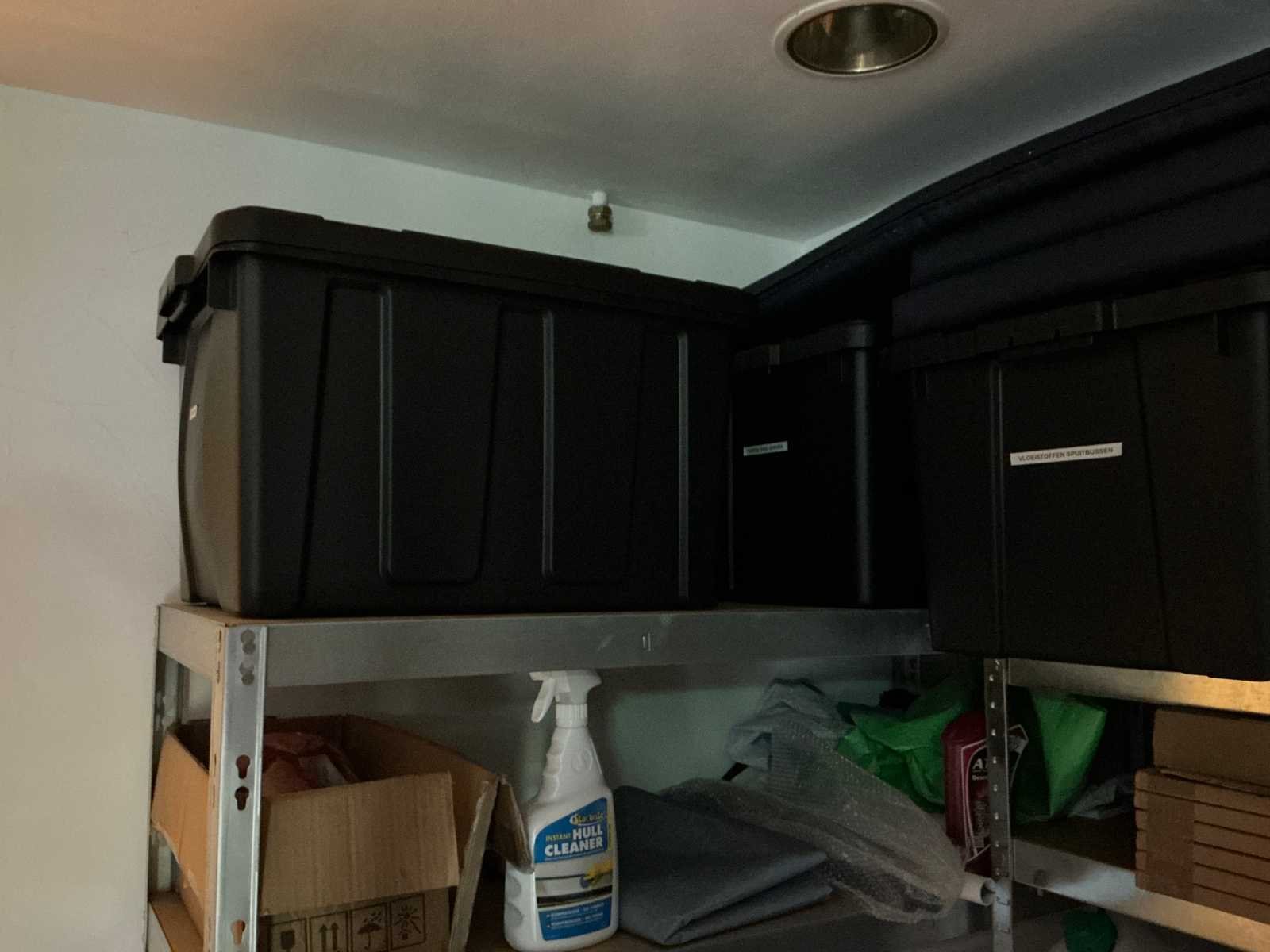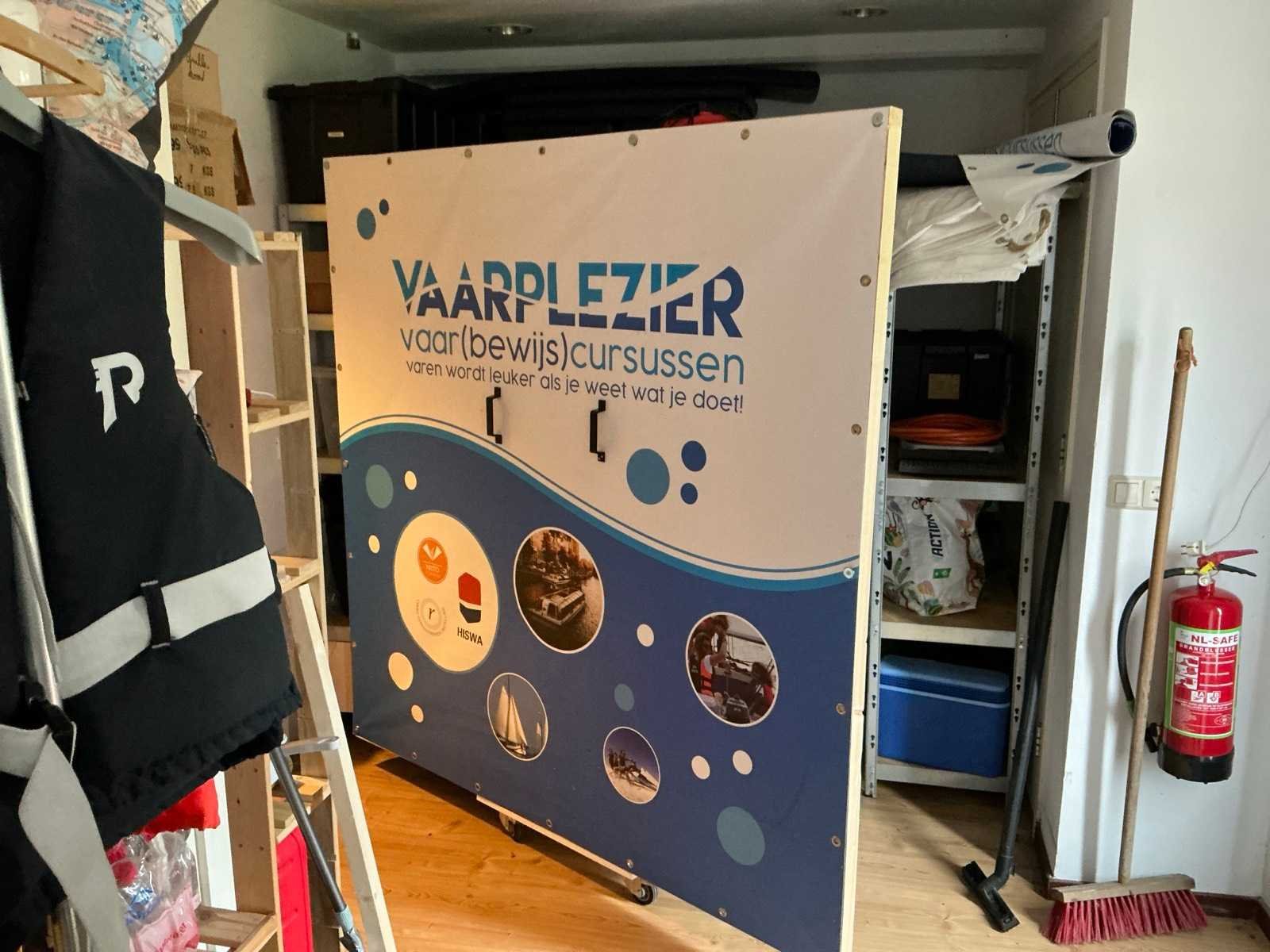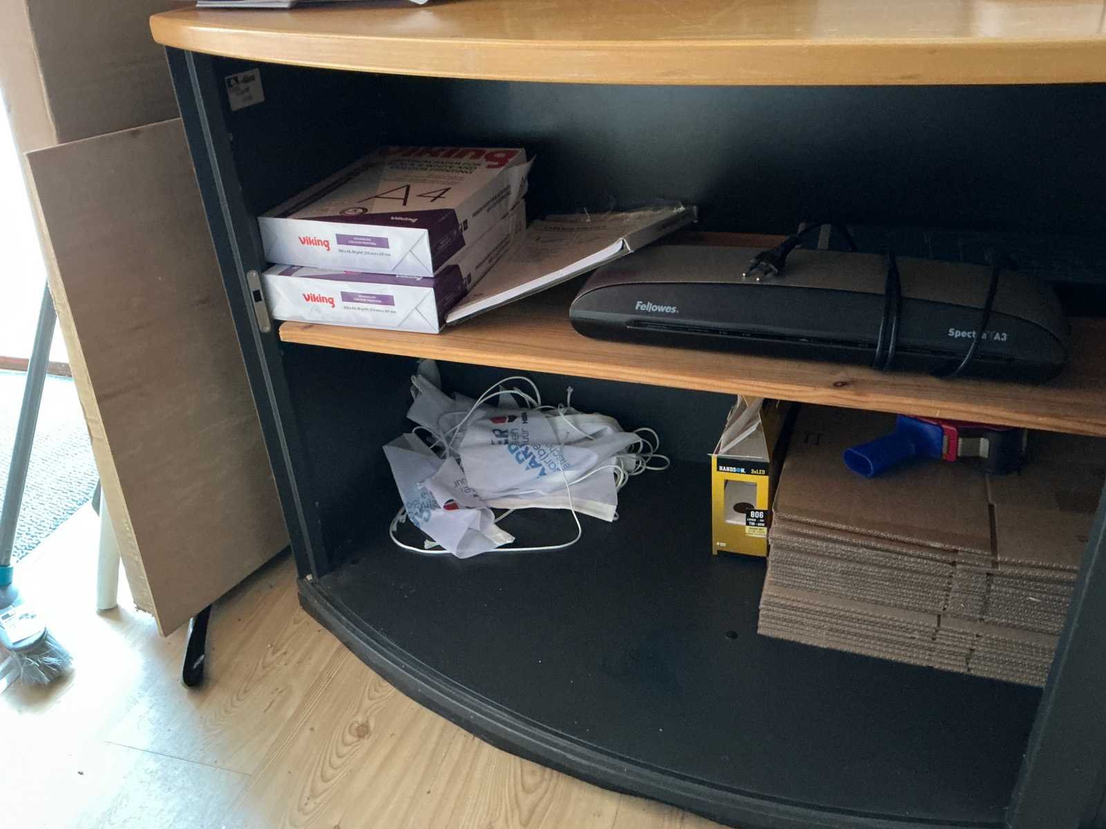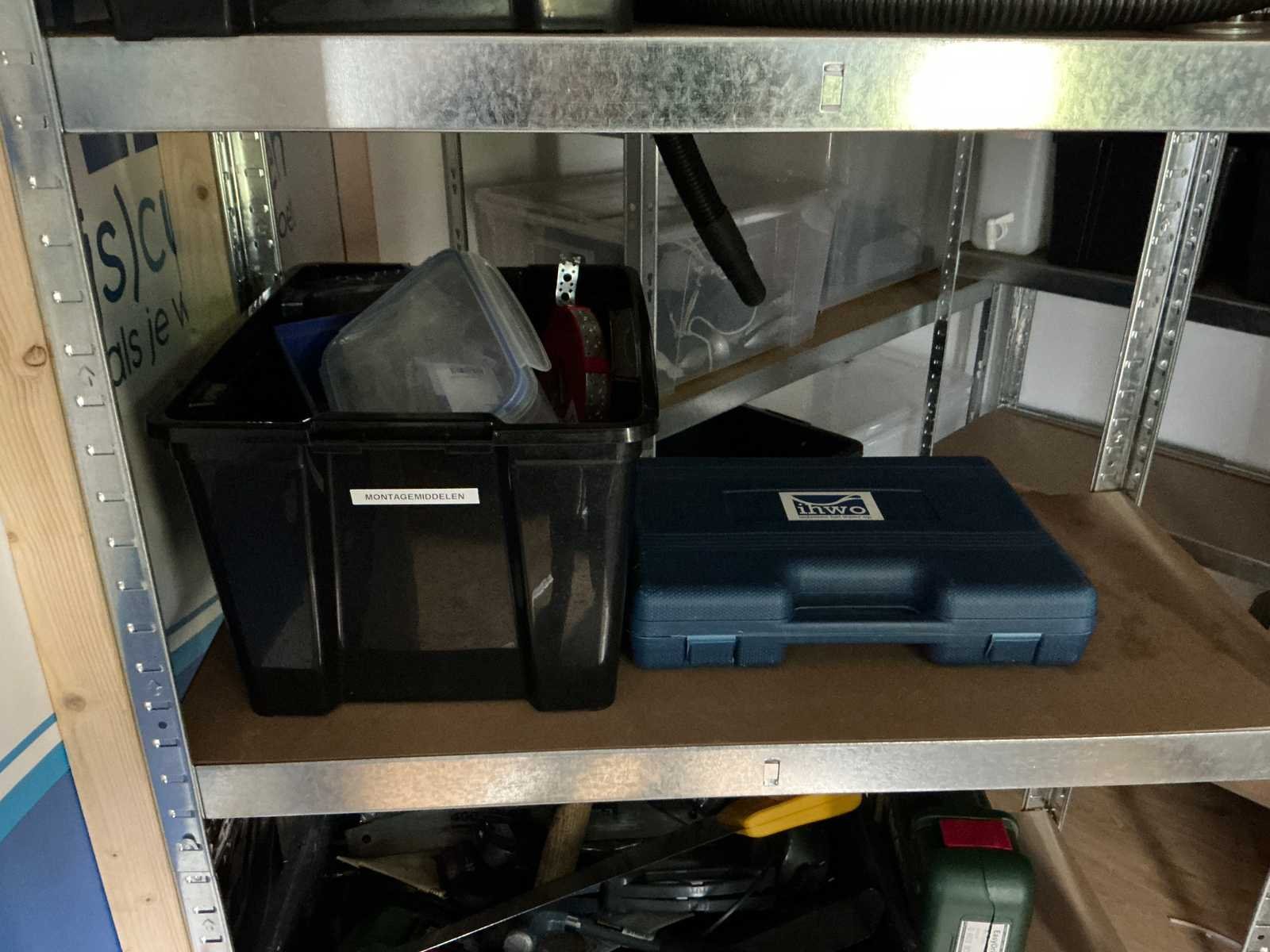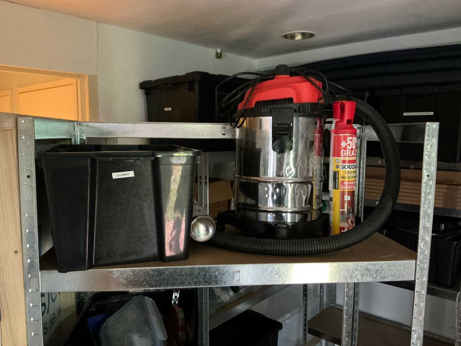 Bestaande uit 3x stellingkast met inhoud (gereedschap, watersport toebehoren, schoonmaak artikelen etc), 1x archiefkast 120x45x195cm, boeien, kantoortafel met stoelen, halfronde archiefkast, console op statief, 1 vergadertafel met stoelen, Etna vaatwasser, diverse keuken inhoud, bergkast met divers kantoorgerief, kledingrek met watersport kleding, printer, etc