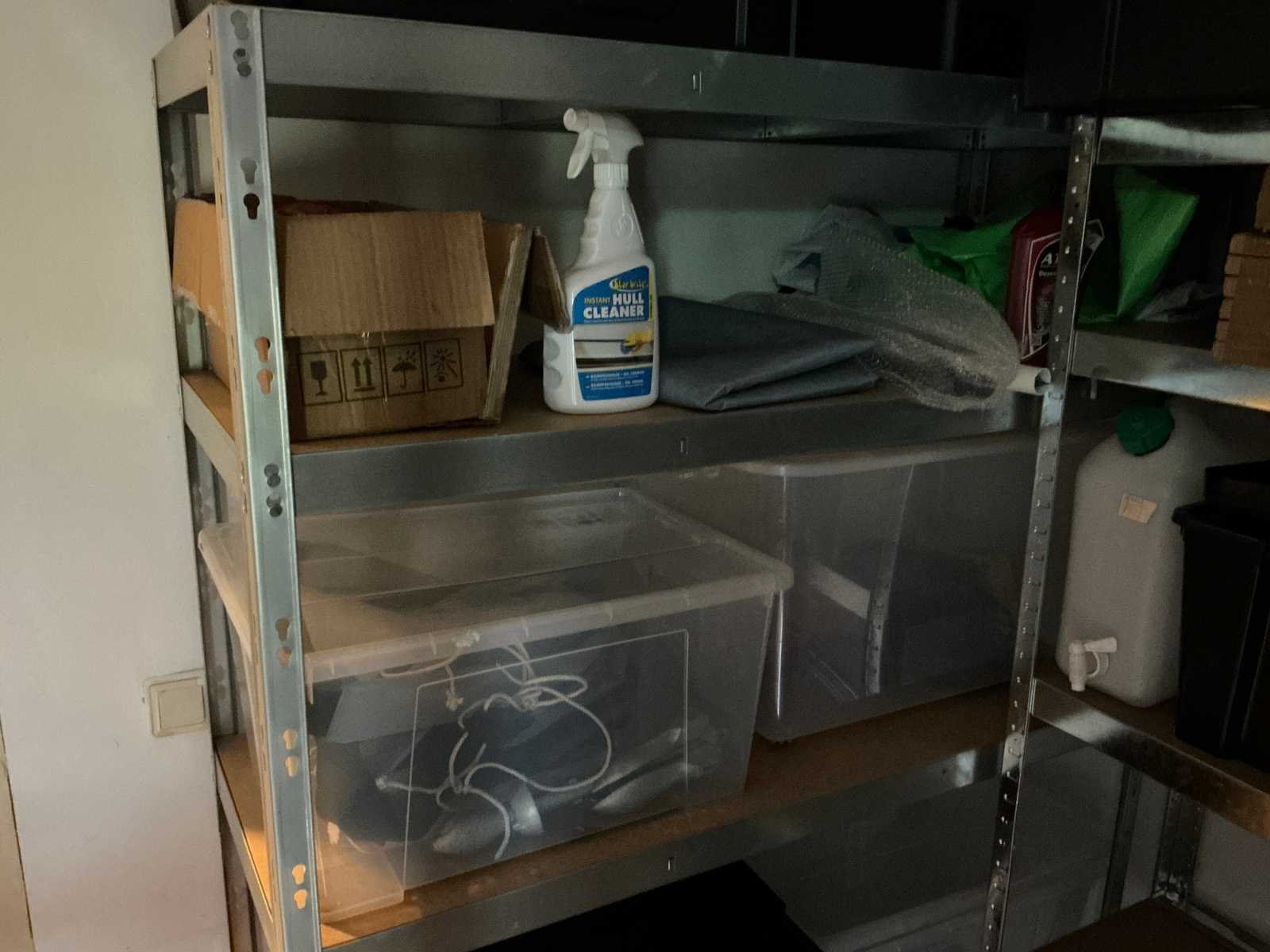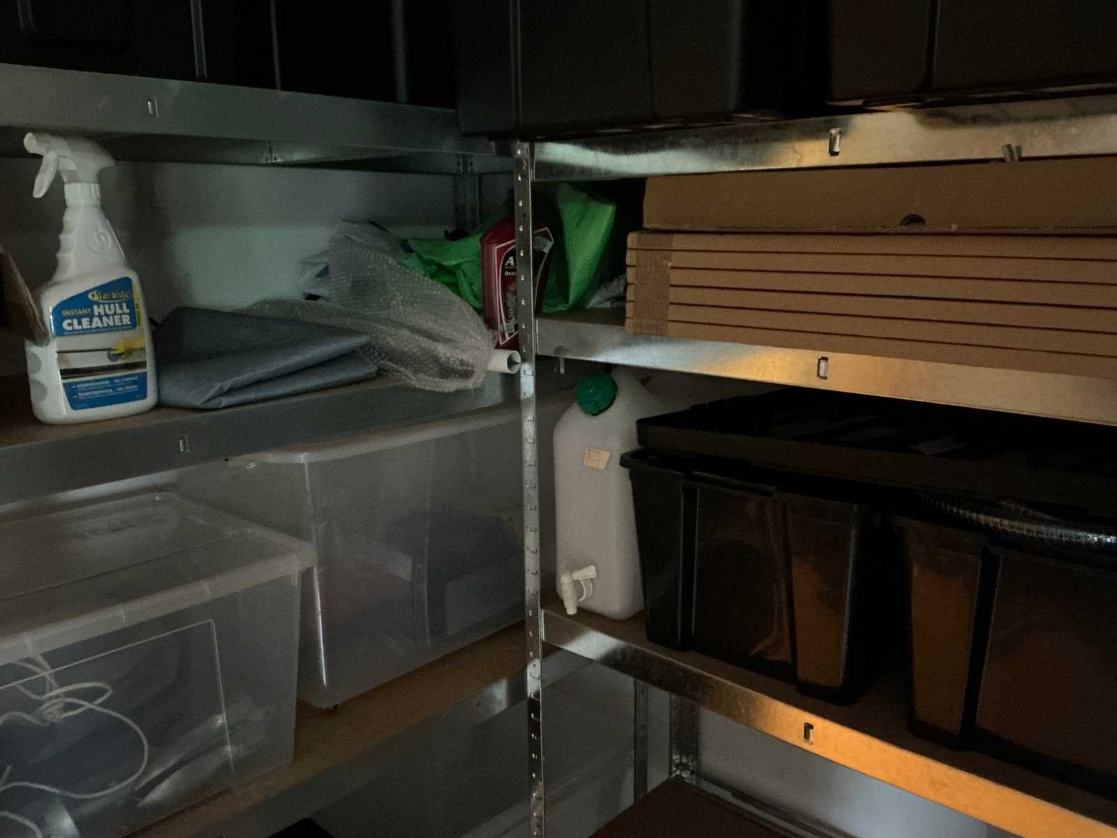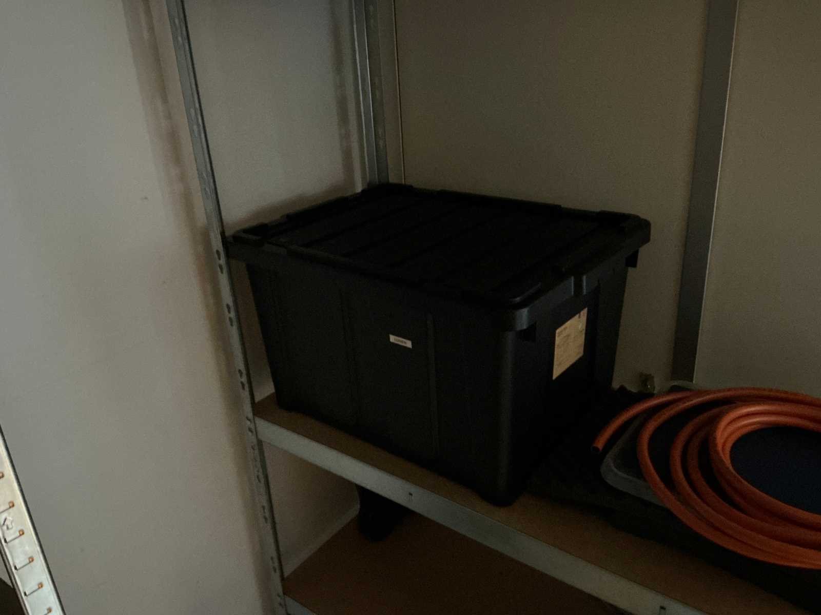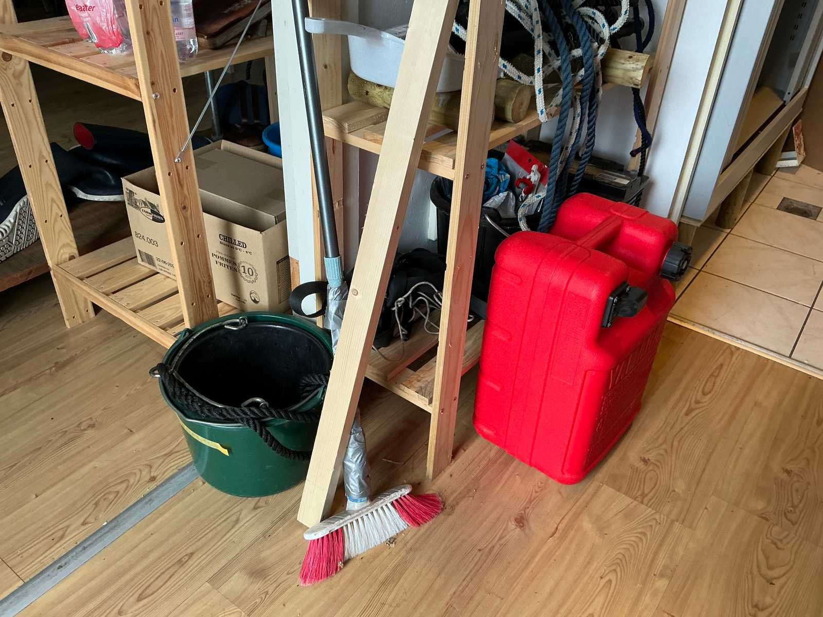 Bestaande uit 3x stellingkast met inhoud (gereedschap, watersport toebehoren, schoonmaak artikelen etc), 1x archiefkast 120x45x195cm, boeien, kantoortafel met stoelen, halfronde archiefkast, console op statief, 1 vergadertafel met stoelen, Etna vaatwasser, diverse keuken inhoud, bergkast met divers kantoorgerief, kledingrek met watersport kleding, printer, etc