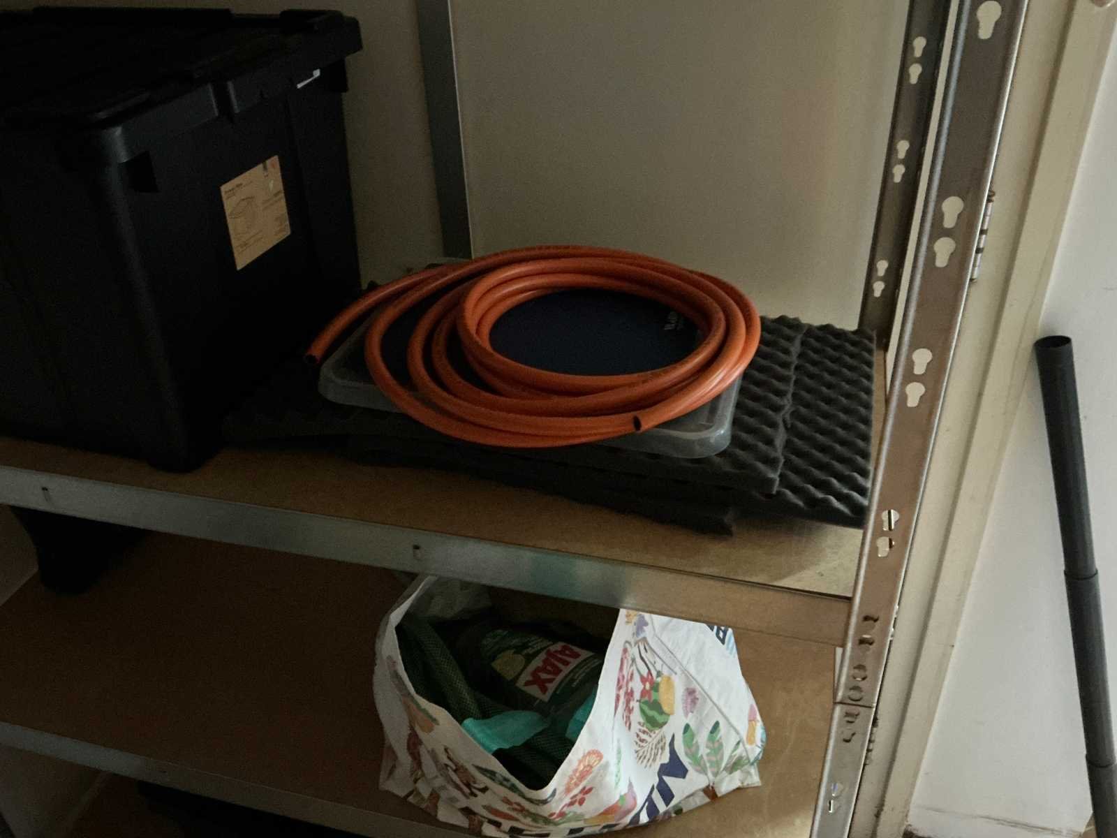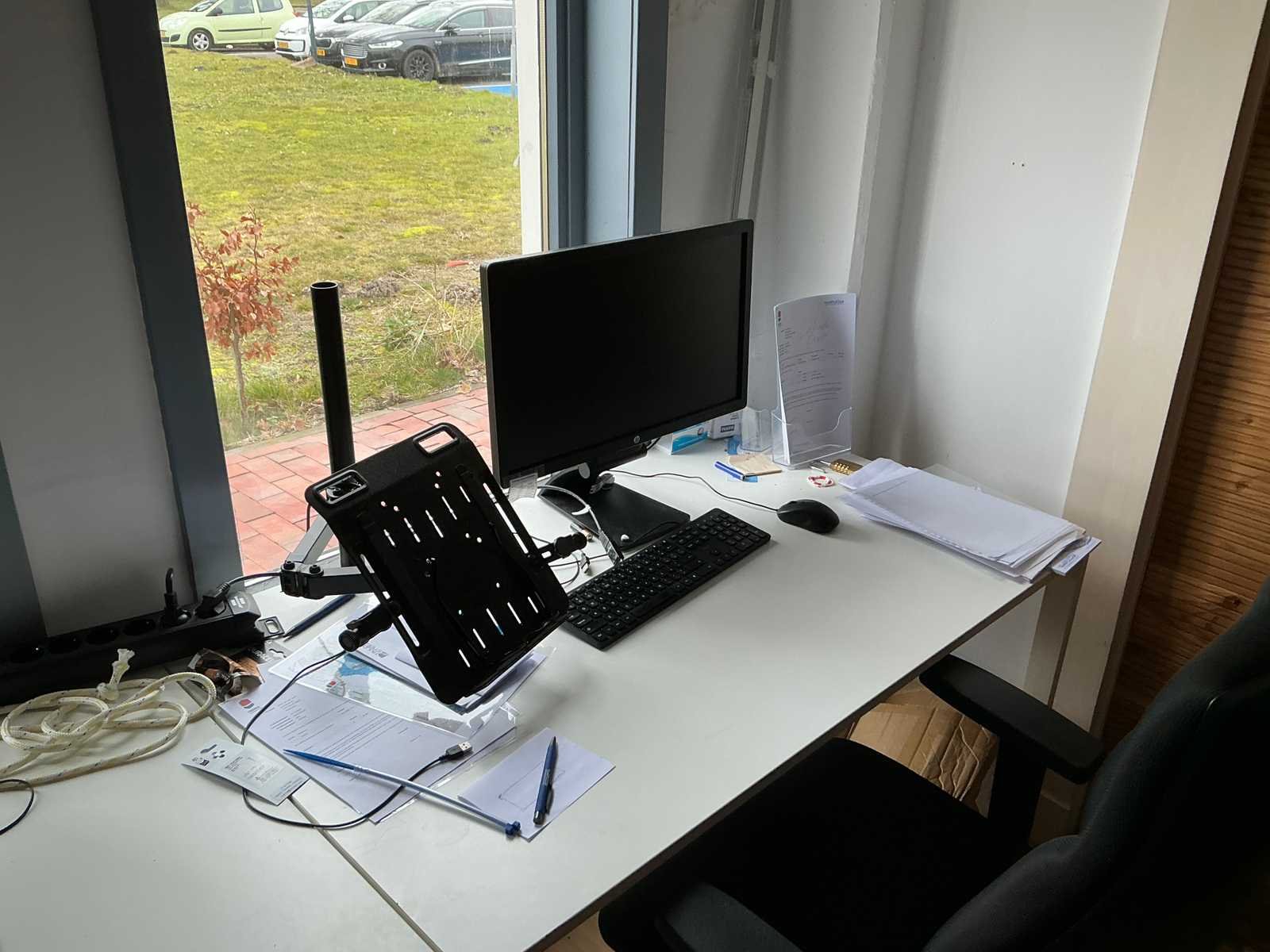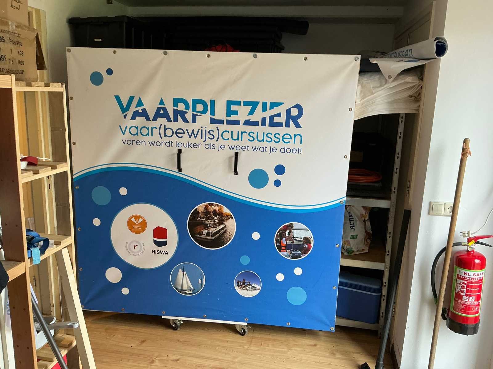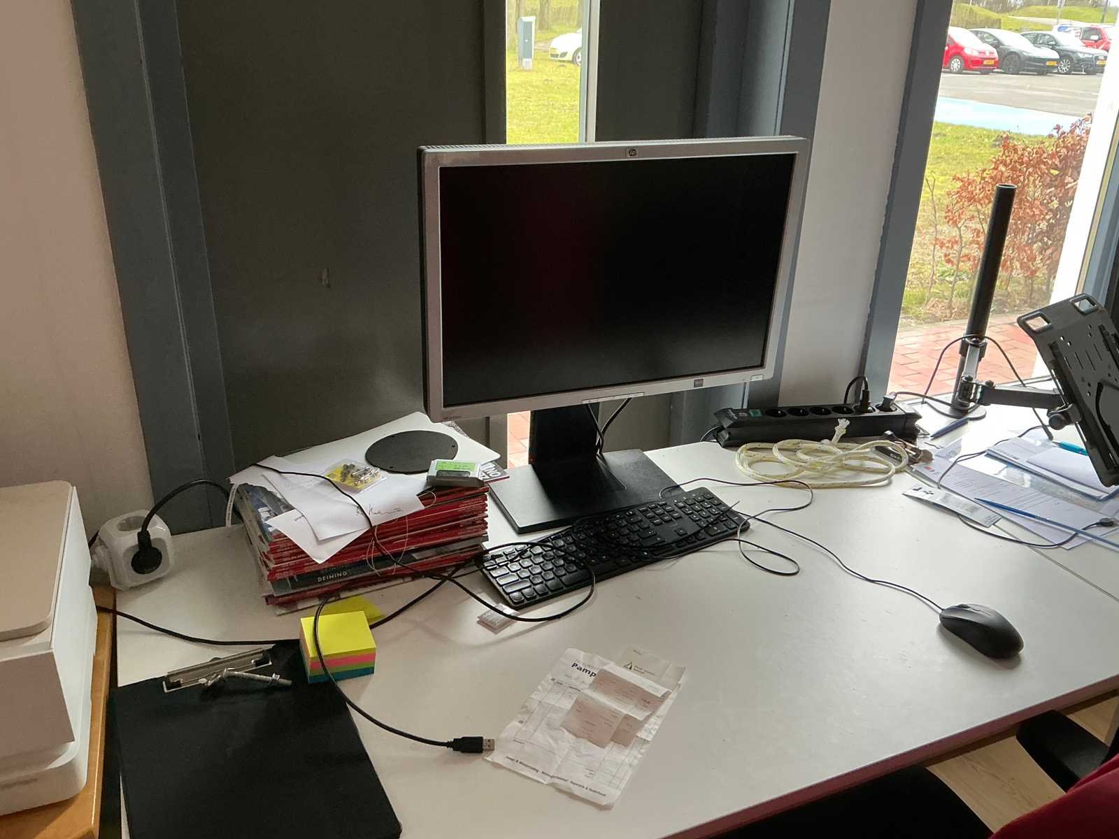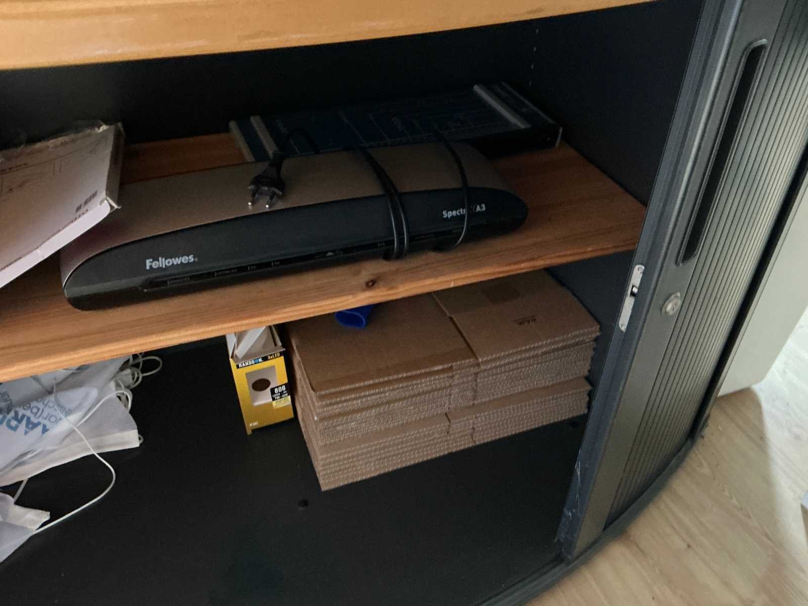 Bestaande uit 3x stellingkast met inhoud (gereedschap, watersport toebehoren, schoonmaak artikelen etc), 1x archiefkast 120x45x195cm, boeien, kantoortafel met stoelen, halfronde archiefkast, console op statief, 1 vergadertafel met stoelen, Etna vaatwasser, diverse keuken inhoud, bergkast met divers kantoorgerief, kledingrek met watersport kleding, printer, etc