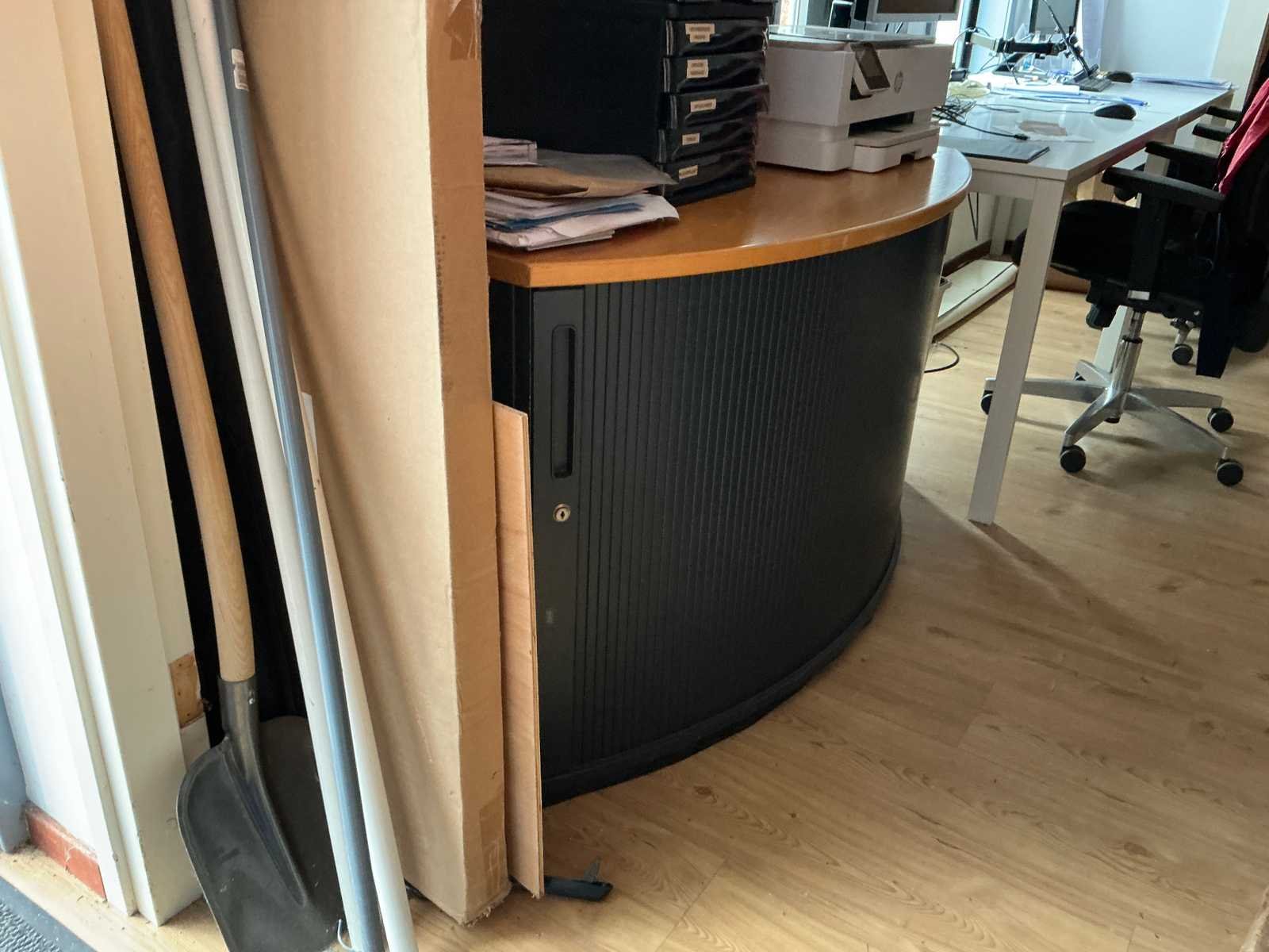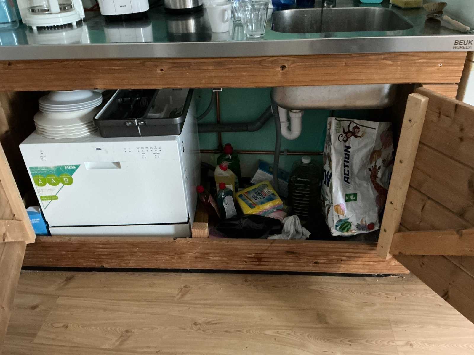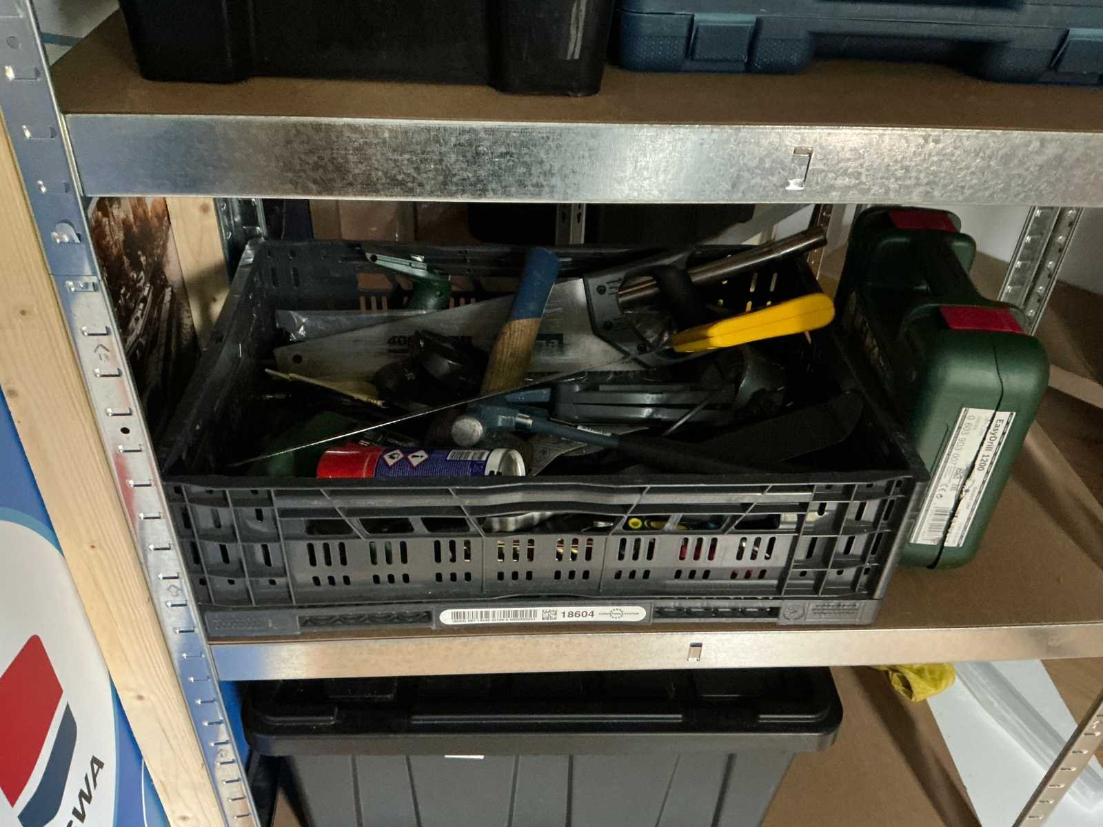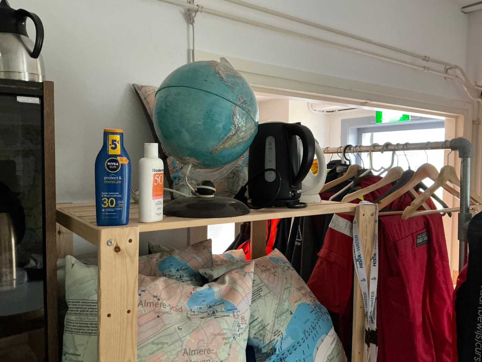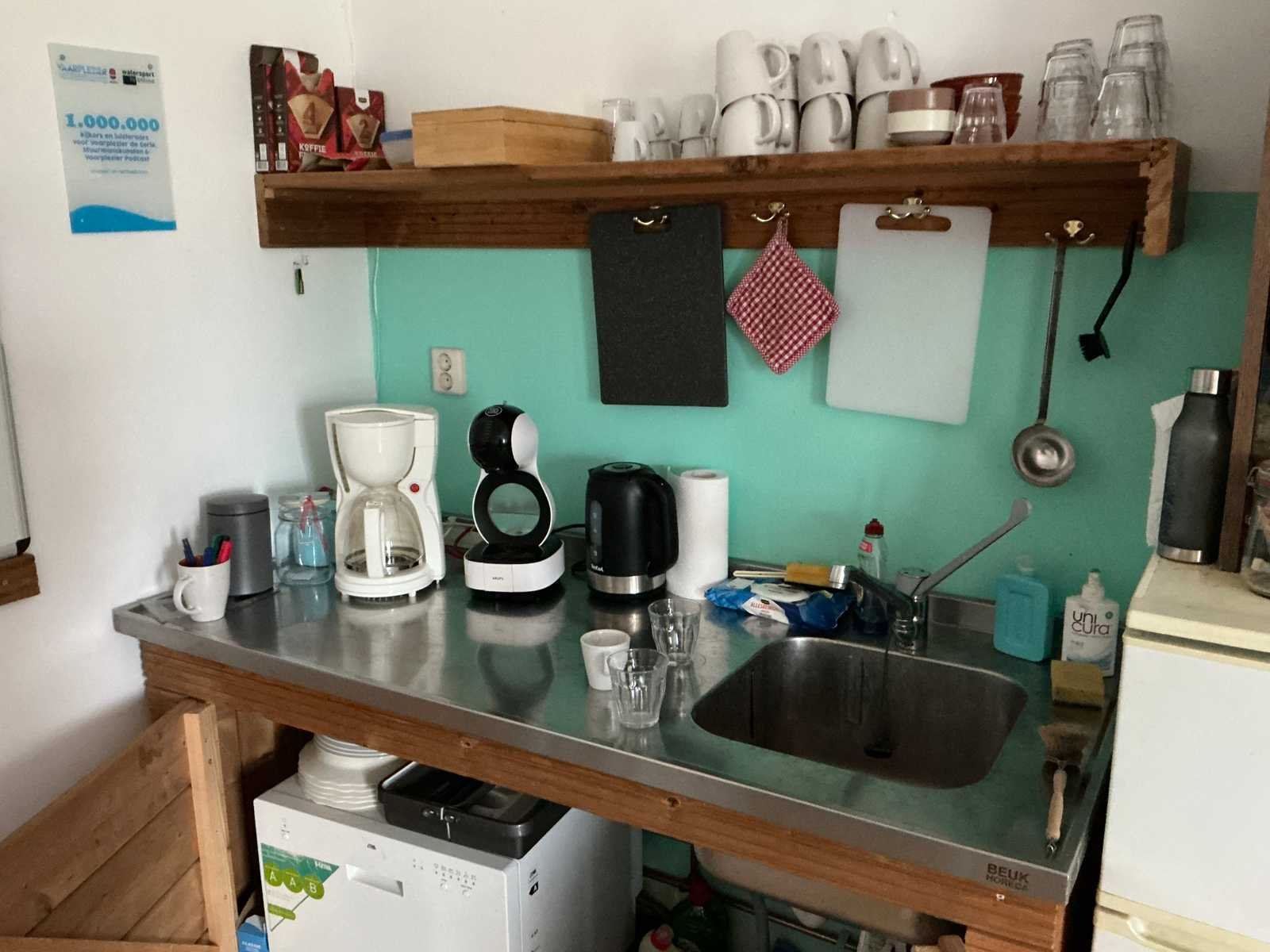 Bestaande uit 3x stellingkast met inhoud (gereedschap, watersport toebehoren, schoonmaak artikelen etc), 1x archiefkast 120x45x195cm, boeien, kantoortafel met stoelen, halfronde archiefkast, console op statief, 1 vergadertafel met stoelen, Etna vaatwasser, diverse keuken inhoud, bergkast met divers kantoorgerief, kledingrek met watersport kleding, printer, etc