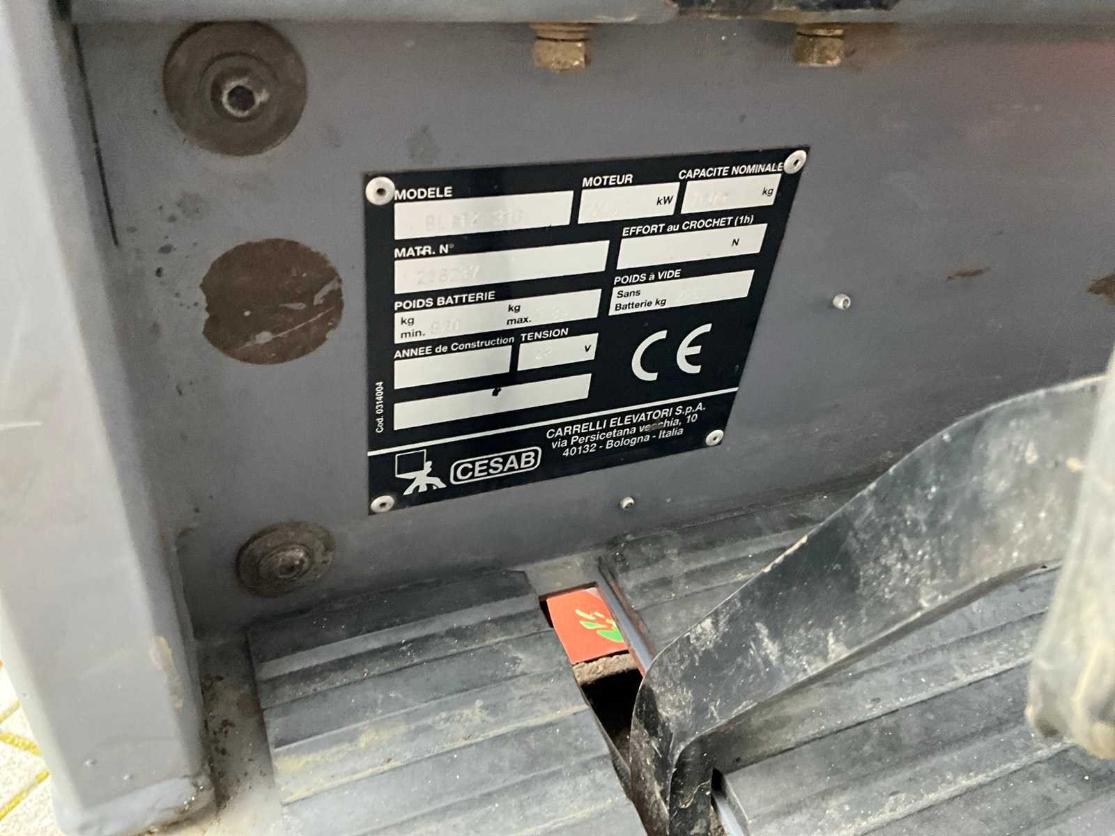 Merk: Cesab Type: BLITZ 316 Serienummer: 216237 Brandstof: Elektrisch Mast: Triple Soort band: Volrubber banden Aantal wielen: 3 Afgelezen urenstand: 2806 Accu lader: true Side-shift: true Hefvermogen: 1600kg Lepellengte: 1200mm Hefhoogte: 5000mm Vol rubber banden: true Minimale doorrijhoogte: 2260mm Totale afmeting L: 3300mm Totale afmeting Breedte: 1100mm