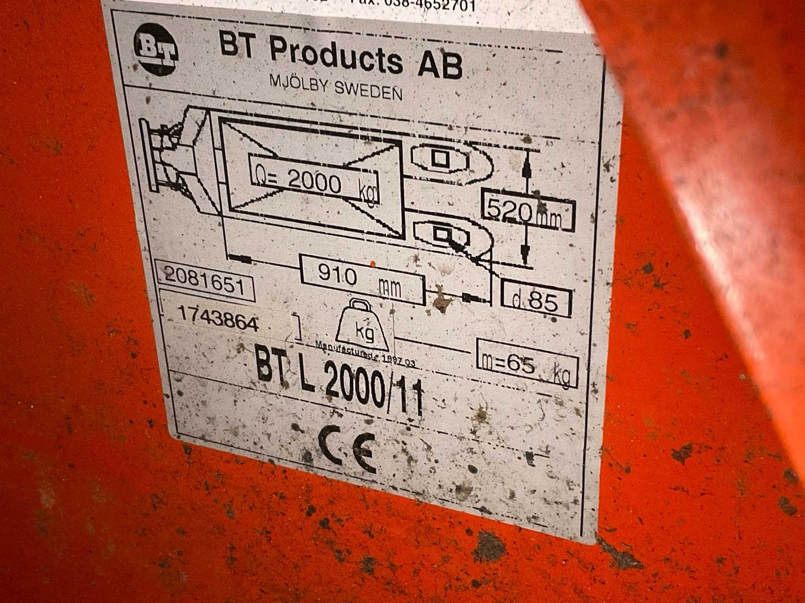 Spoorbreedte 520mm. Let op! Hefboom krom, heft niet. Merk: BT Type: L 2000/11 Bouwjaar: 1997 Serienummer: 1743864 Hefvermogen: 2000kg Hefhoogte: 200mm Lepellengte: 910mm Eigen gewicht: 65kg Totale afmeting L: 1300mm Totale afmeting Breedte: 520mm Totale afmeting Hoogte: 1250mm