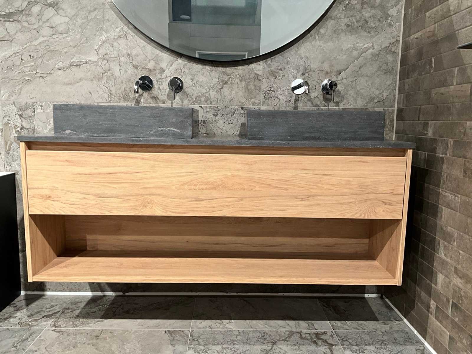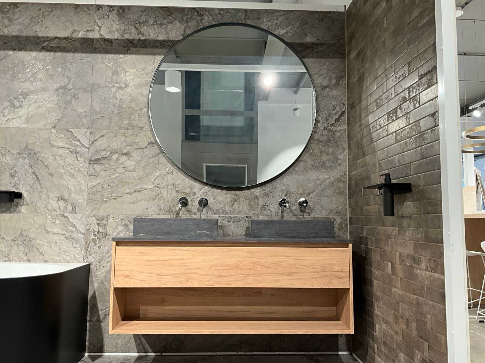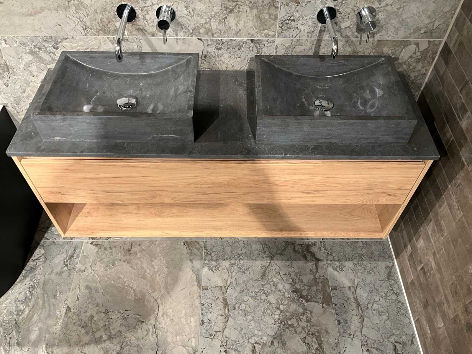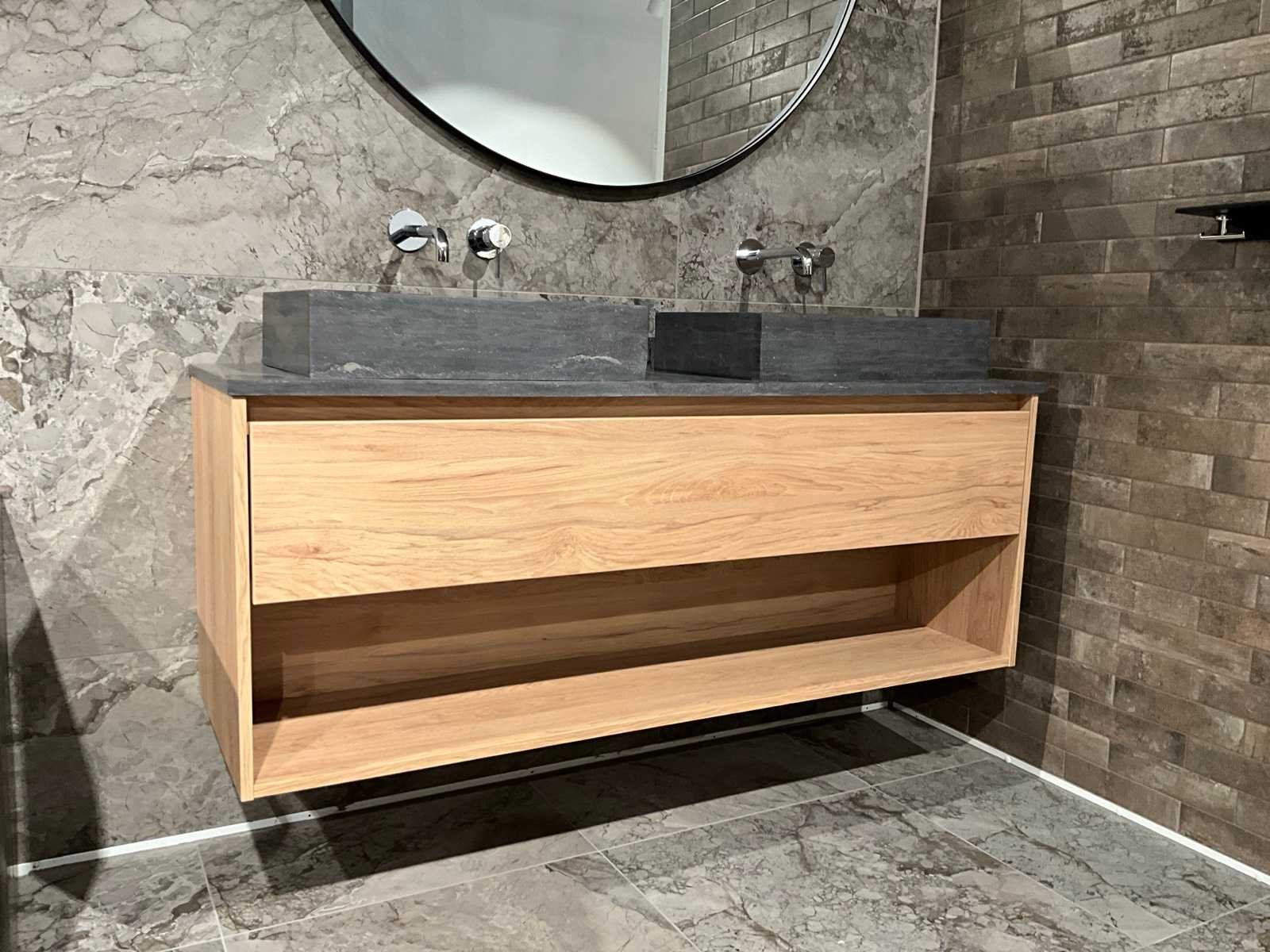 Merk: Sanibell Model: PROLINE Breedte: 140cm Kleur: Ideal Oak Kraan: Saibel GRADA Waskom: Sanibell PROLINE Blue stone Spiegel: Sanibell INK SP15 Afmeting spiegel: 120