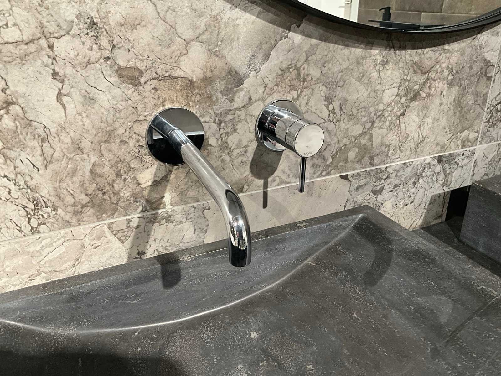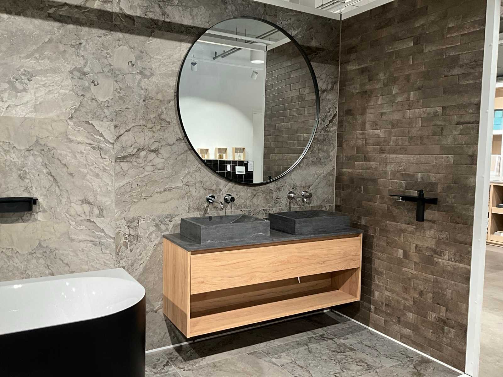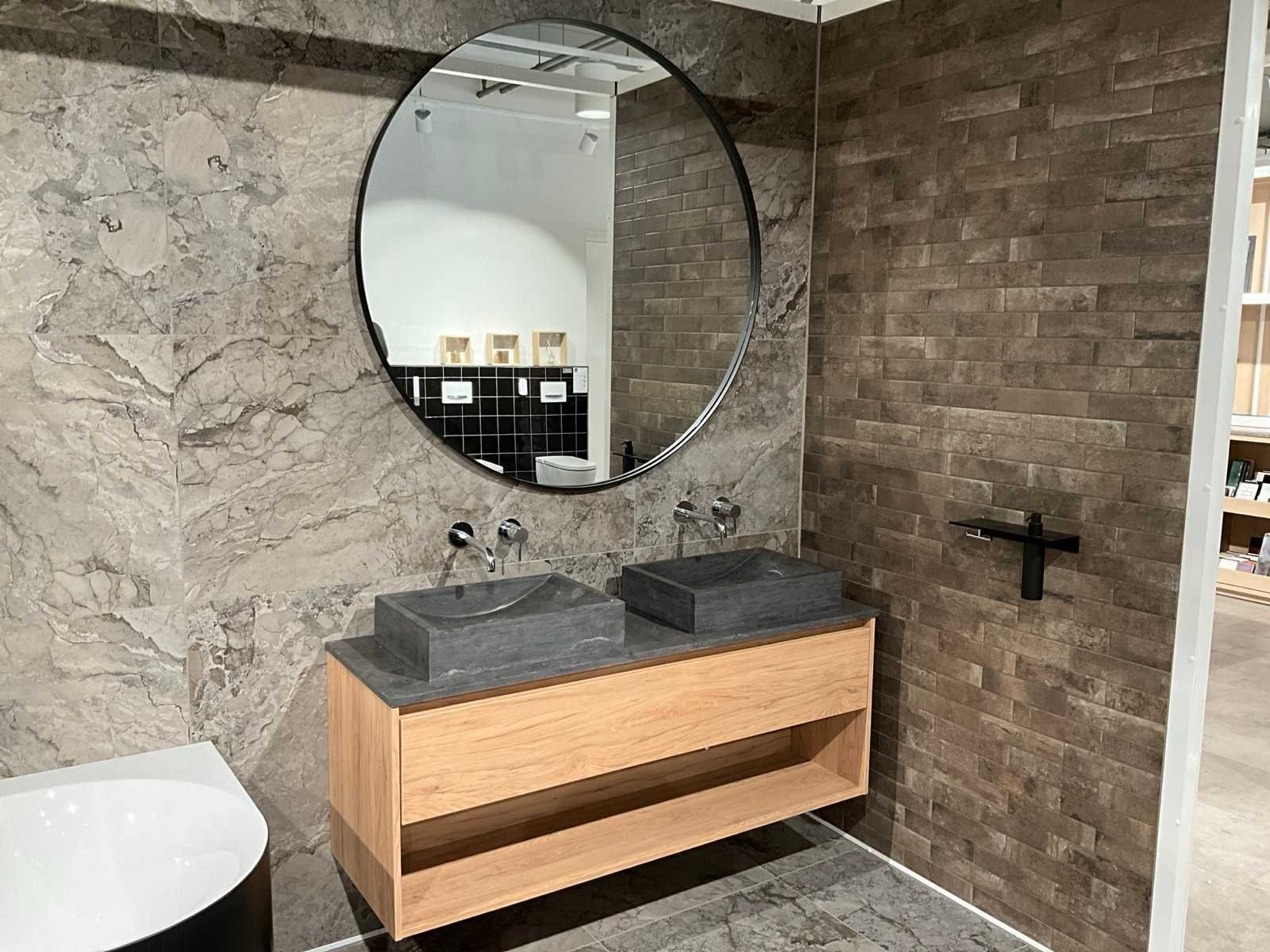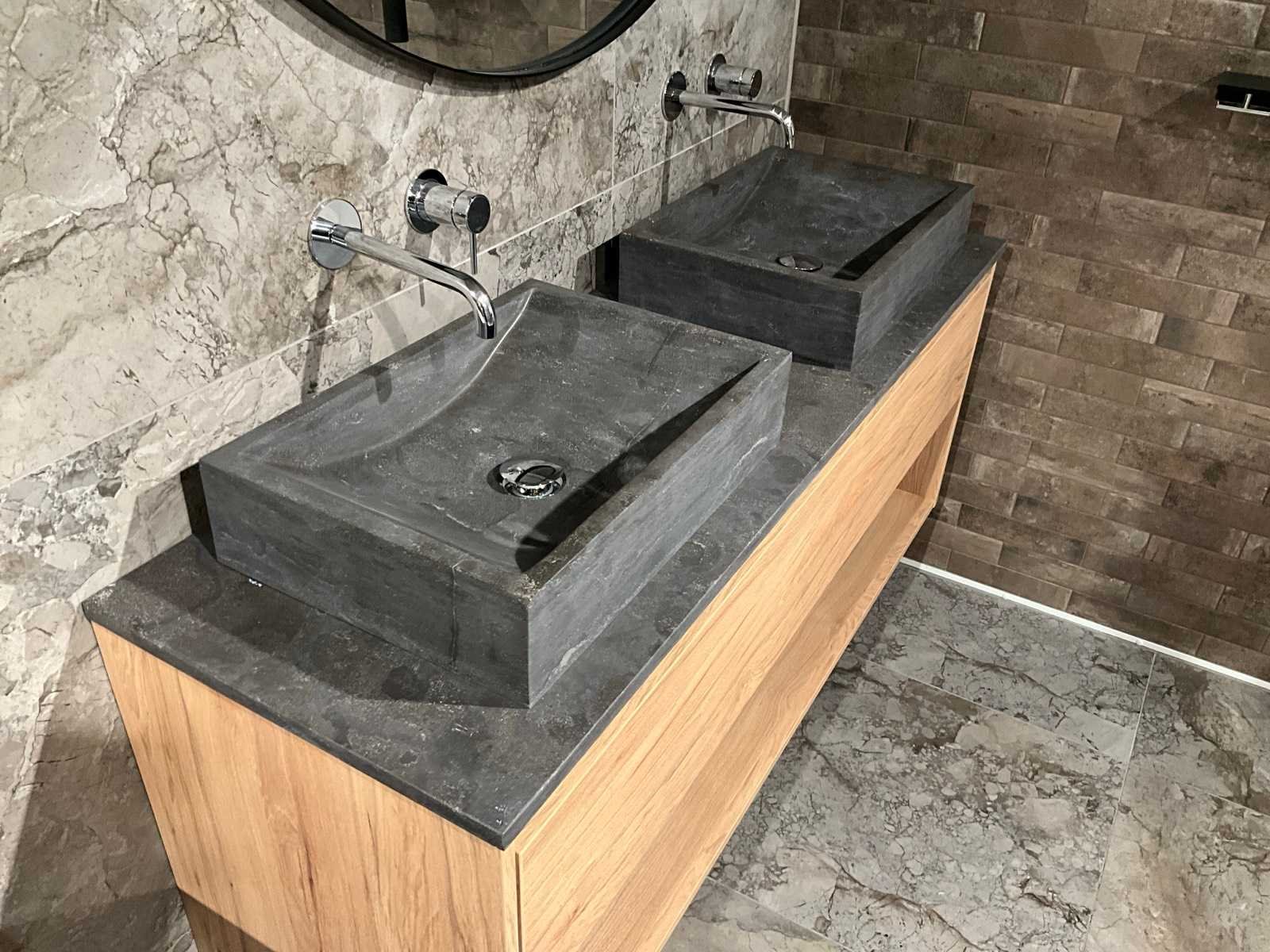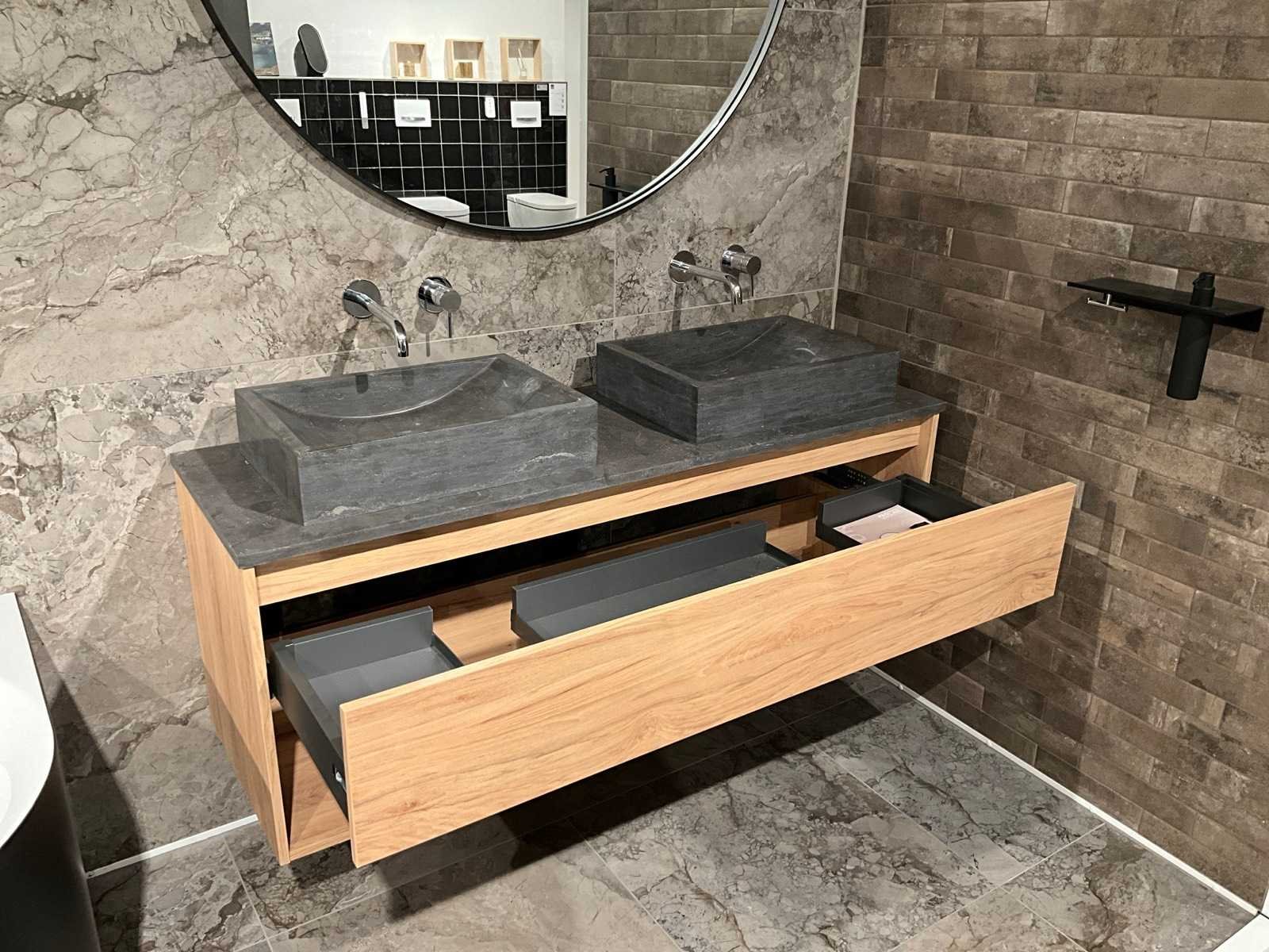 Merk: Sanibell Model: PROLINE Breedte: 140cm Kleur: Ideal Oak Kraan: Saibel GRADA Waskom: Sanibell PROLINE Blue stone Spiegel: Sanibell INK SP15 Afmeting spiegel: 120