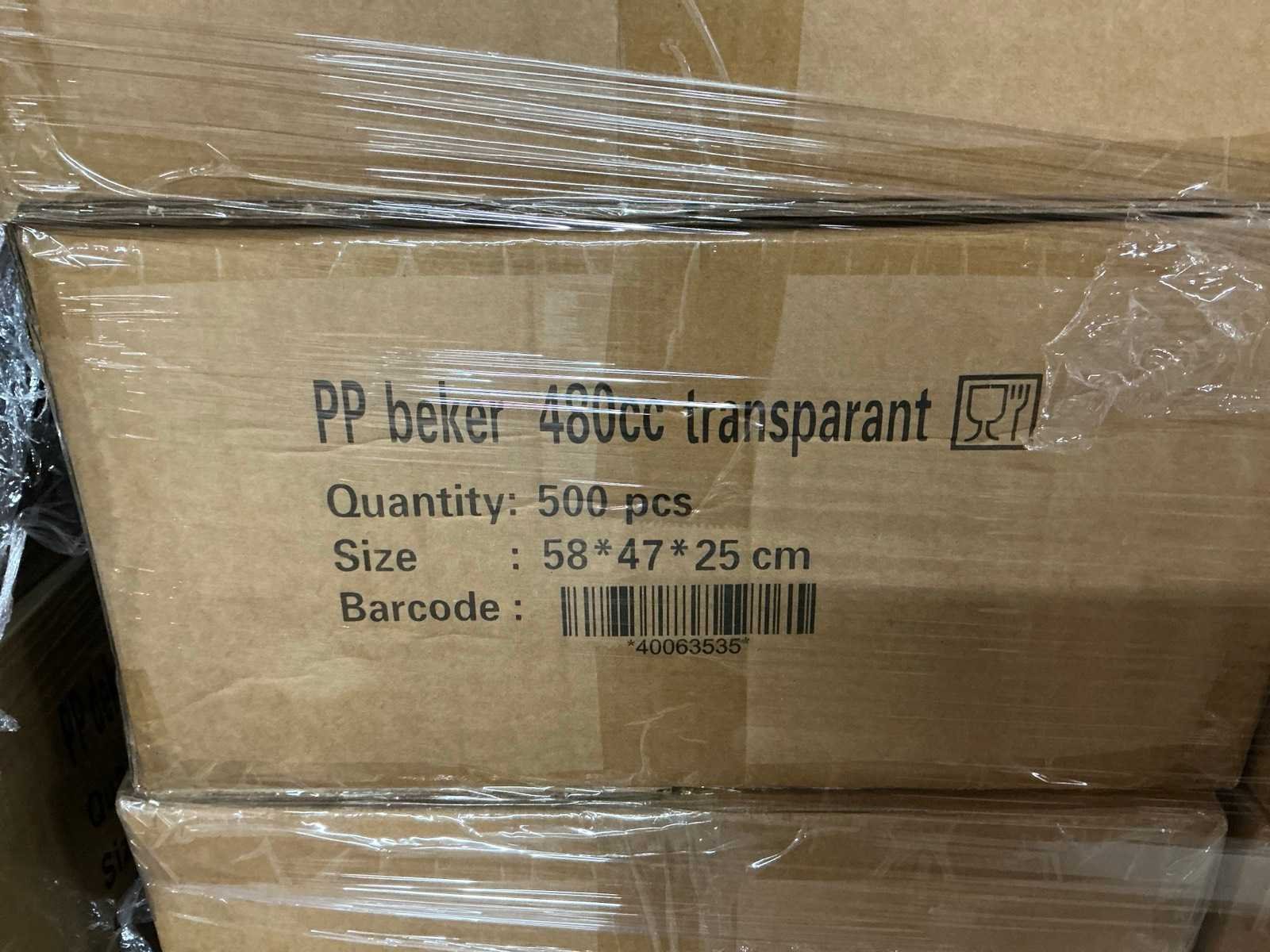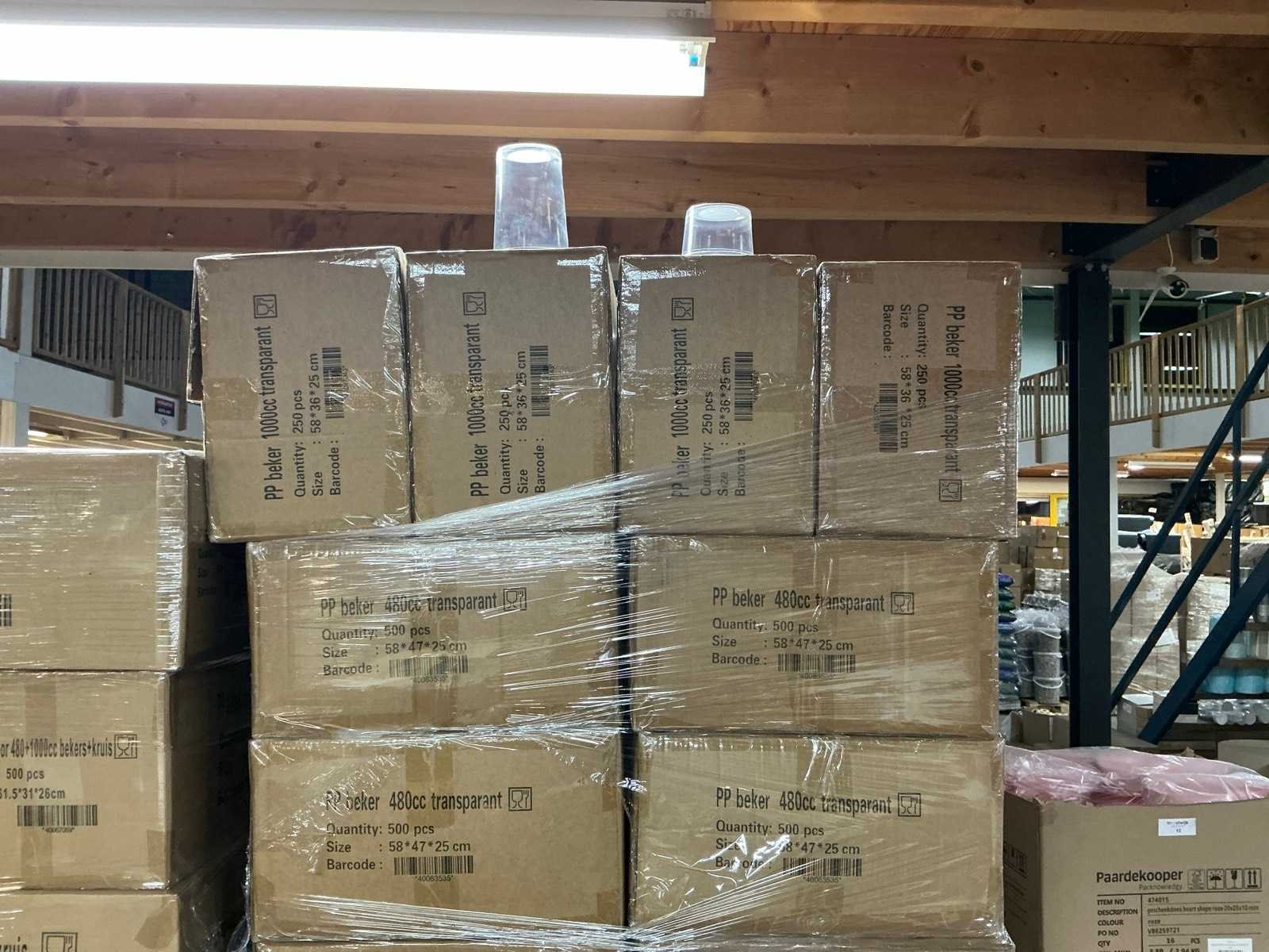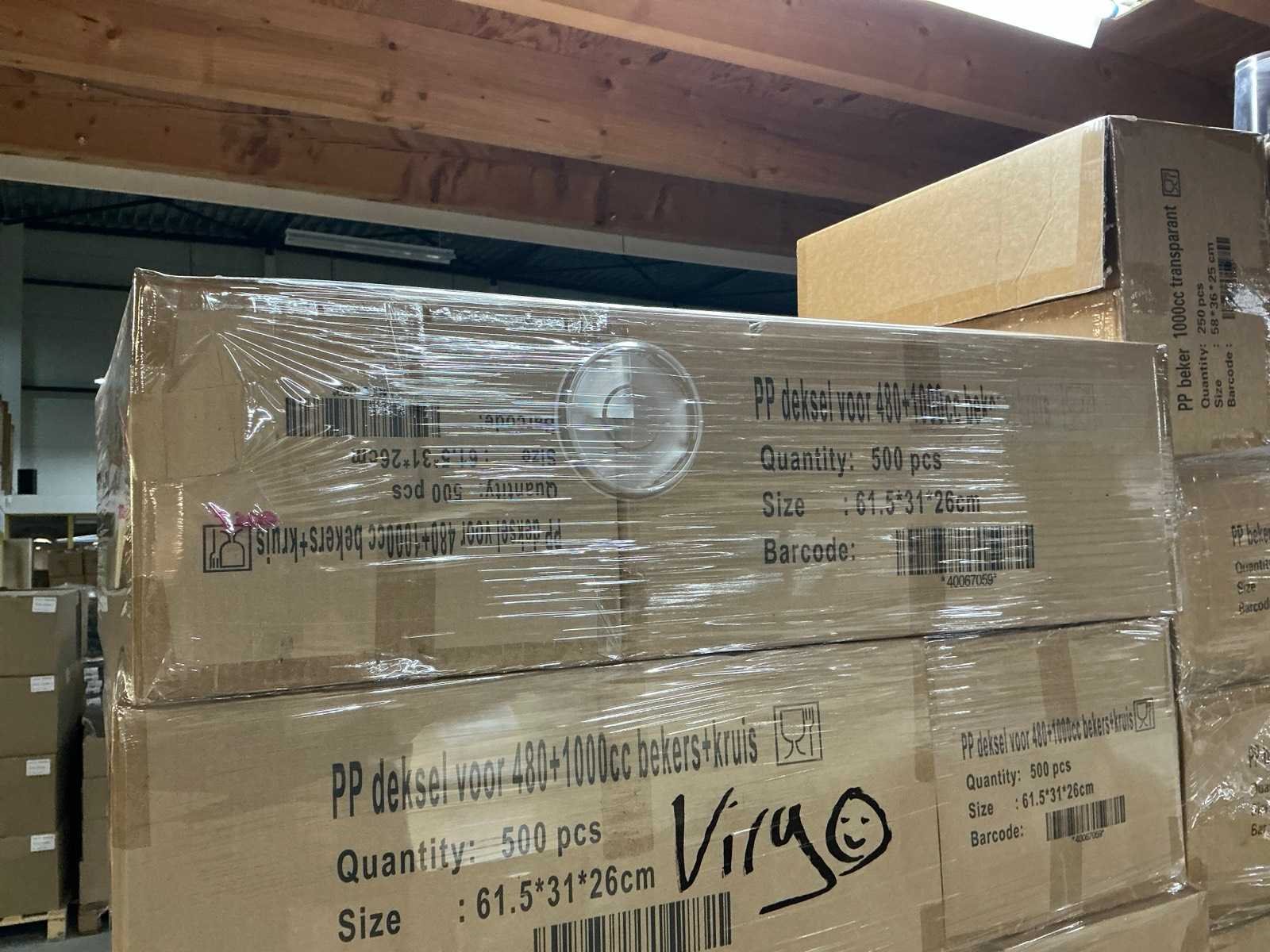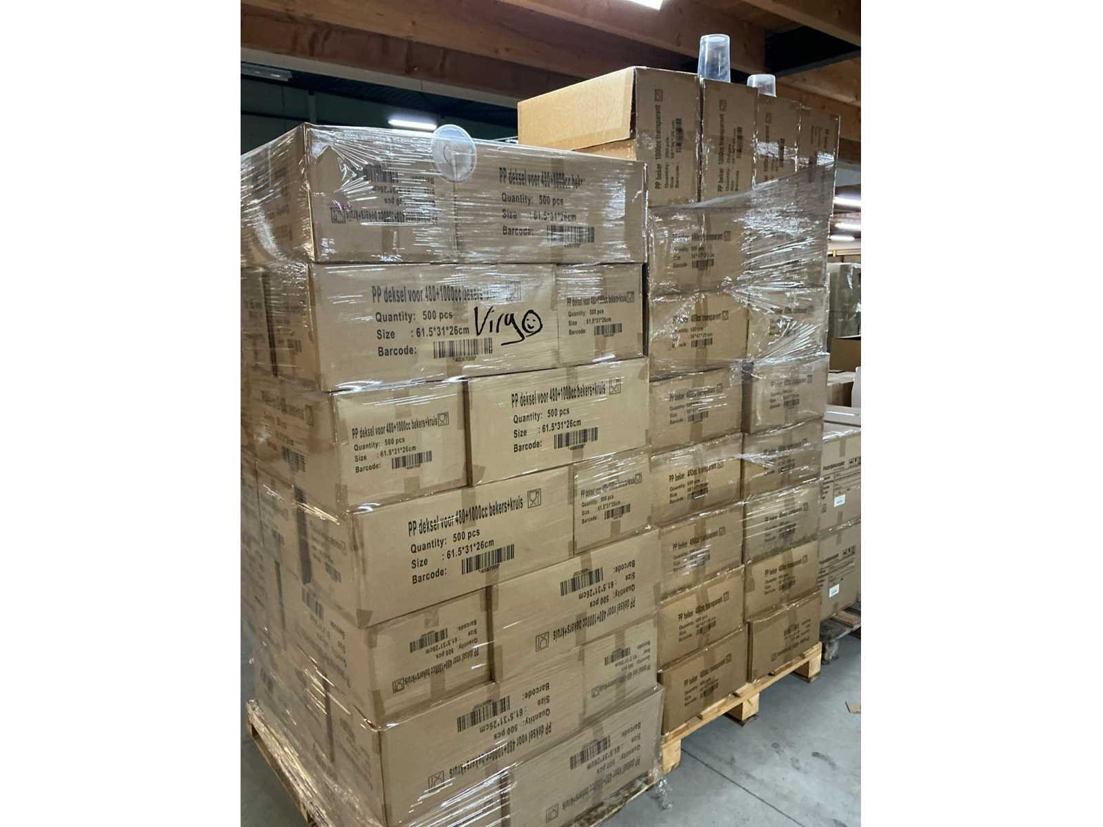 1000x PP bekers 1000cc. 15000x PP bekers 480cc. = totaal 16000 bekers. 21000x deksels.