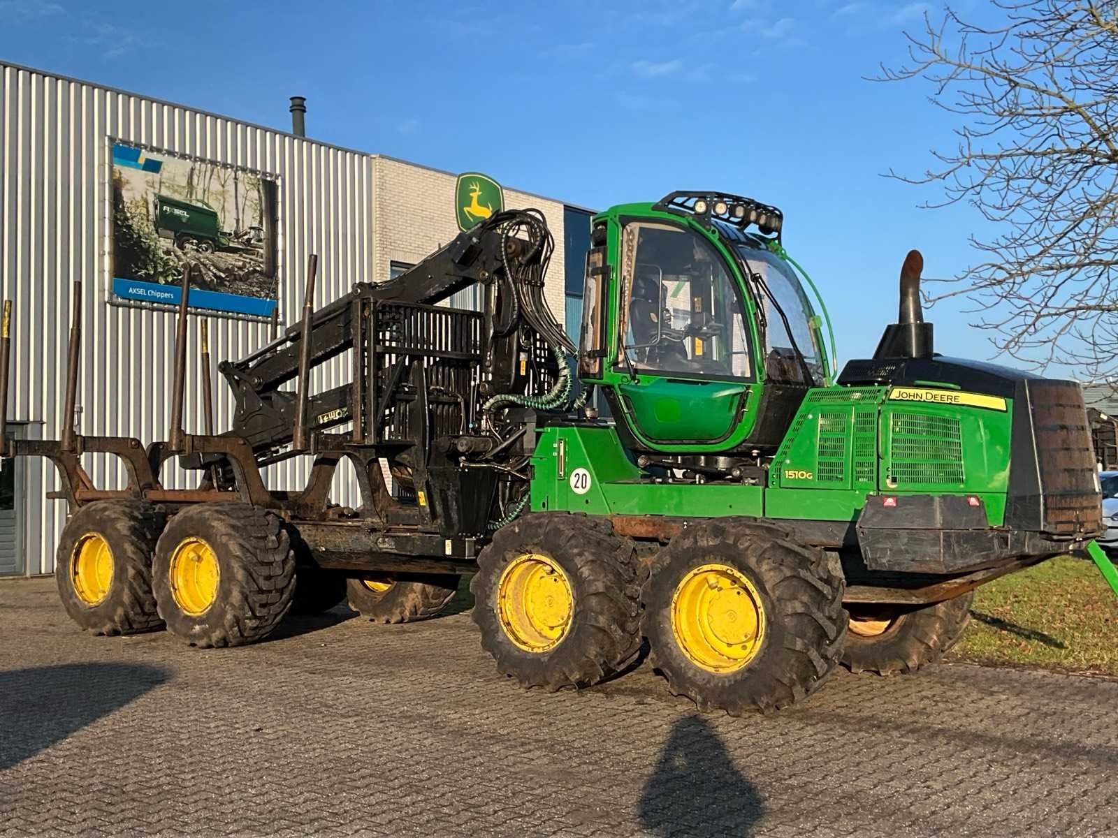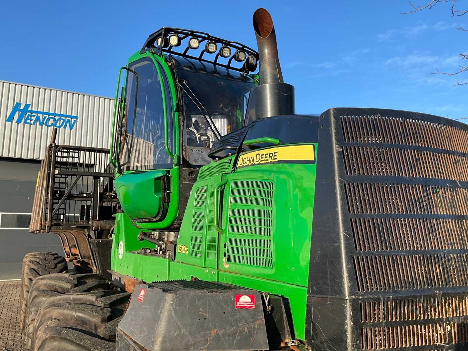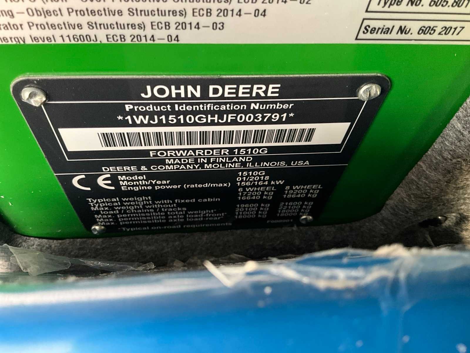 Voorzien van 8x8, hydrostaat aandrijving (2-traps), draai- en nivelleer cabine met centrale smering, CF7S-10mtr laadkraan met binnen liggende slangen, IBC boom control, Hultdins SG360S stammen grijper, kopschot hydraulisch verstelbaar (horizontaal + verticaal), hydraulisch verstelbare laadruimte verbreders, laadruimte lengte 5300 mm, led werkverlichting, hydrauliek- en brandstof vulpomp, centraal smeer systeem, hydraulisch opklapbare trap, standkachel, hydraulische klembank functie, luxe bestuurdersstoel (verwarmd, luchtverstelling verstelbaar, geventileerd), XL4 besturingssysteem, 4G MTG kit, Timbermatic Maps, documentatie, biologische hydraulische olie, Sun blinds, Merk: John Deere Type: 1510G Tier IV Bouwjaar: 2018 Serienummer: 1WJ1510GHJF003791 Motorvermogen (kW): 156kW Afgelezen urenstand: 13100 Versnellingsbaktype: Hydrostaat Bandenmaat voor: Alliance 710/45-26.5 A344 Bandenmaat achter: Nokian 710/45-26.5 Forest King F2 Cabine: true Luchtgeveerde stoel: true Totale afmeting L: 11000mm Totale afmeting Breedte: 2965mm Totale afmeting Hoogte: 3850mm