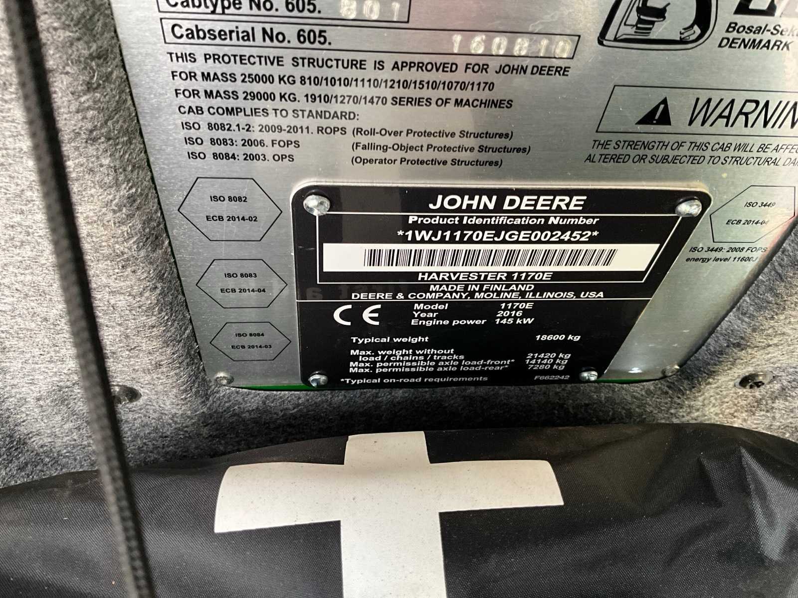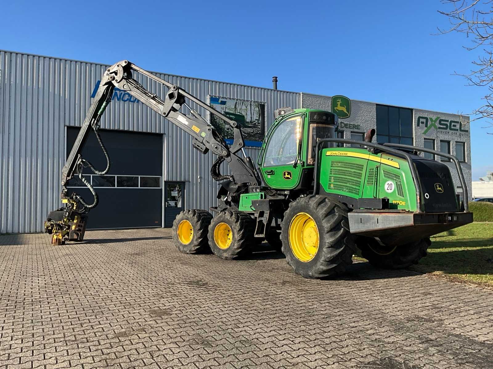 Voorzien van 6x6, hydrostaat (2-traps), werkverlichting (met bescherming), CH6-10 mtr kraan (nieuwe hefcilinder) met harvester kop , draai- en nivelleer cabine, centrale smering op cabine lager, automatisch smeersysteem, elektrisch te openen motorkap, Olie- en brandstof vulpomp, luxe bestuurdersstoel (luchtverstelling, geventileerde en verwarmd), vacuümpomp voor hydraulisch systeem, achteruitrijcamera, schuifmaat ten behoeve calibratie van harvester kop (60 cm), PC + 3G MTG kit, documentatie, sun blinds, droger op hydraulische systeem, hydraulisch Offline filter, aanbouwdeel: Harvester kop H414 (serienummer 1EJH414XCG0000775), 4 walsen kop, V-TEC walsen, kleur markering, Hultdins zaagsysteem, wals motoren 400 + 600 cc, Merk: John Deere Type: 1170E Bouwjaar: 2016 Serienummer: 1WJ1170EJGE002452 Motorvermogen (kW): 145kW Afgelezen urenstand: 13976 Versnellingsbaktype: hydrostaat Bandenmaat voor: Nokian 710/40-24.5 Forest King F2 Bandenmaat achter: Nokian 710/55-34 Forest rider TRS Cabine: true Luchtgeveerde stoel: true Totale afmeting L: 11000mm Totale afmeting Breedte: 2920mm Totale afmeting Hoogte: 3750mm