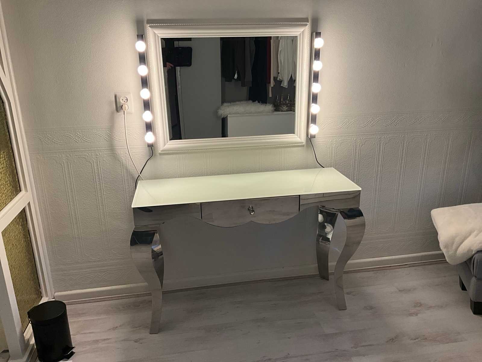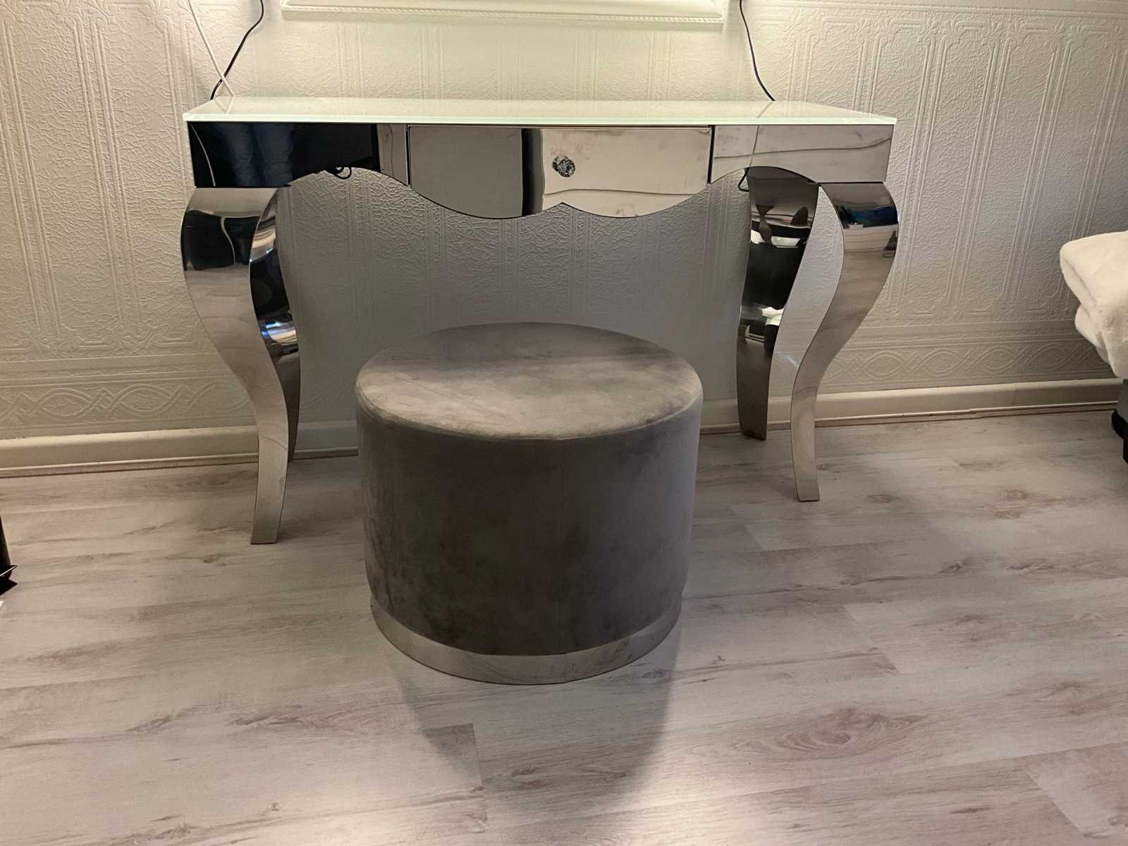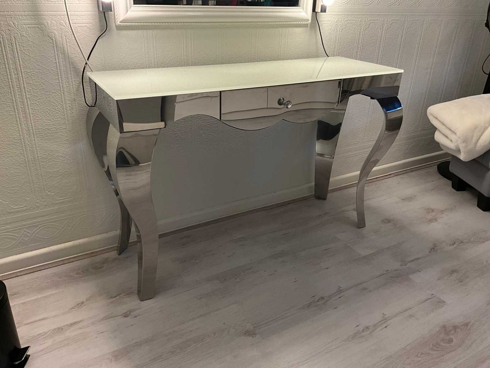 Afmeting tafel 120x41x79 cm voorzien van 1 lade, melkglazen topblad en chroomstalen onderstel, grijze zitpoef , wandspiegel afmeting 90x70 cm, en 2 stuks wandverlichting met elk 5 lichtbronnen