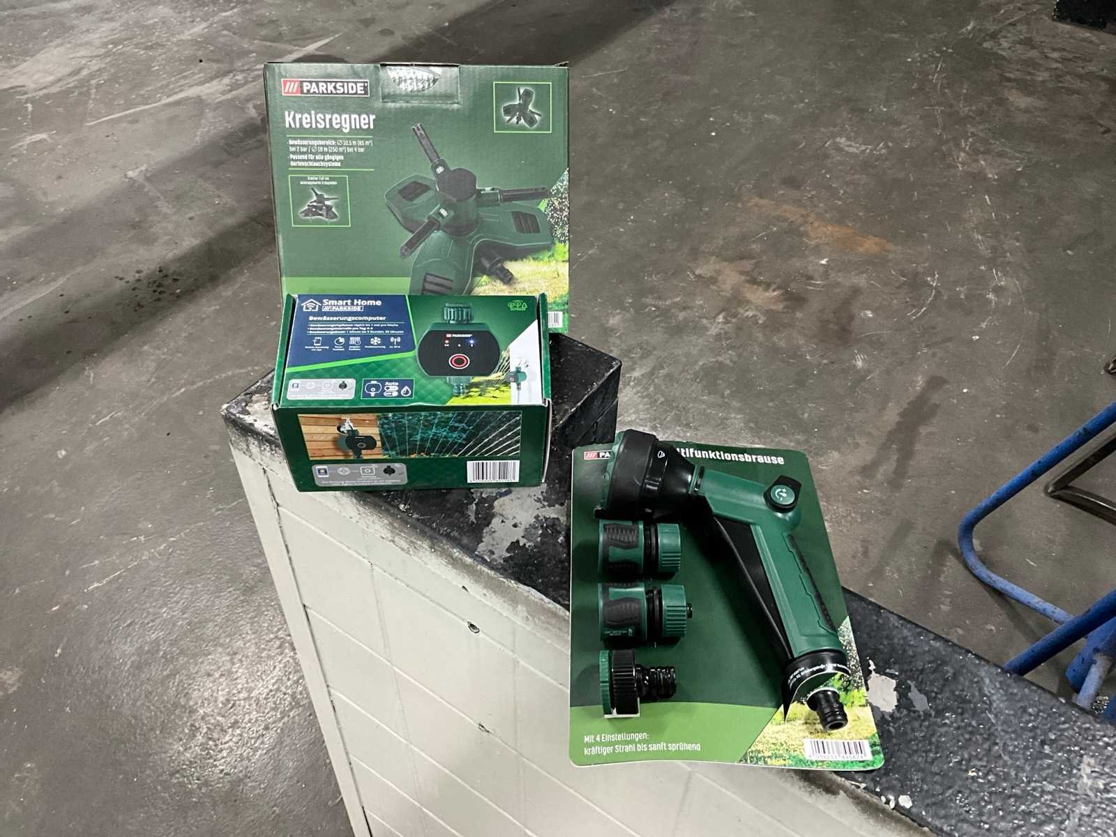 Ongebruikt in verpakking, bestaande uit 1 stuks bewaterings computer, 1 stuks roterende tuinsproeier en 1 stuks waterspuitpistool met diverse koppelingen. Merk: Parkside Type: Smart home