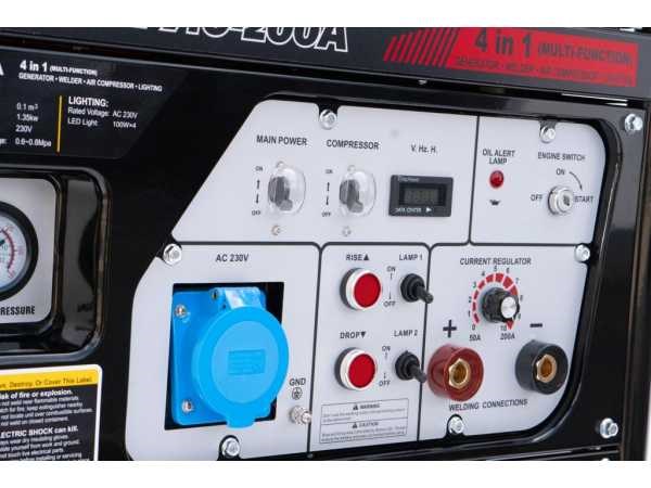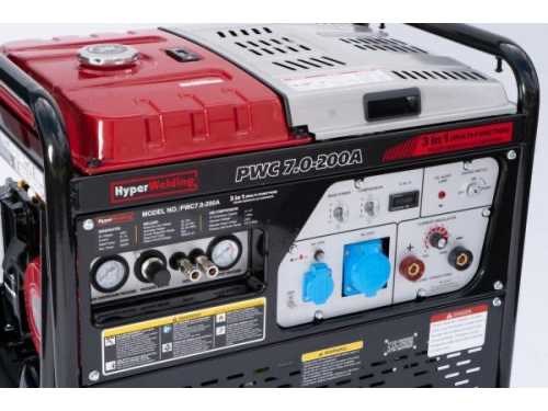Benzine motor; generator, lasapparaat en compressor in 1 Merk: Hyper welding Type: PWC7.00-200A AC/DC: true Ampère belasting: 200A Machinegewicht: 153kg