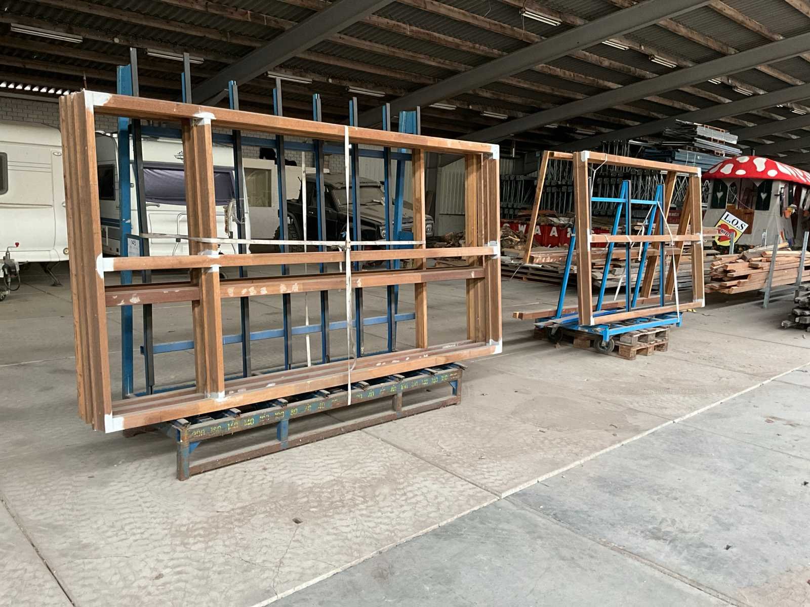 Afmetingen; 1 stuks 1650x2500x110 mm, 4 stuks 1650x3090x110 mm, zonder beglazing, zonder transportjukken Hout: true