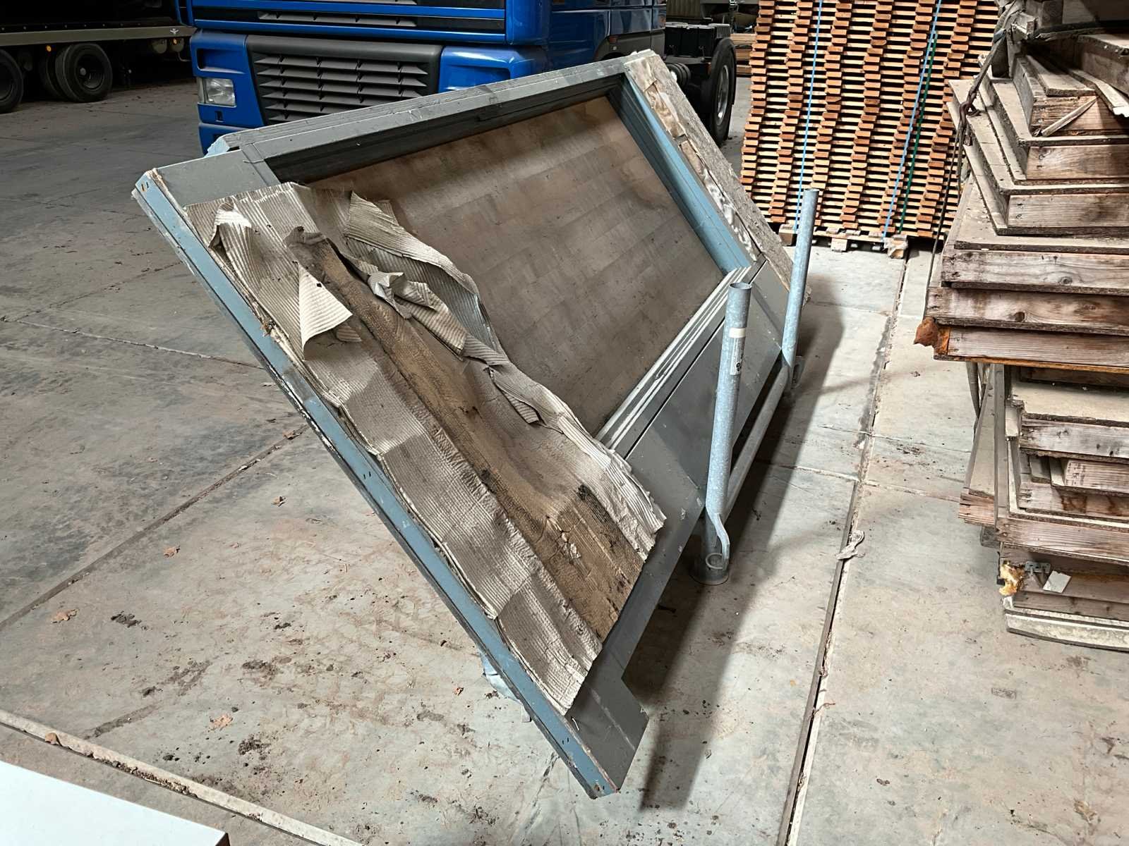 Totaal 1 pallet wanddelen en 1 transportjuk met kozijn