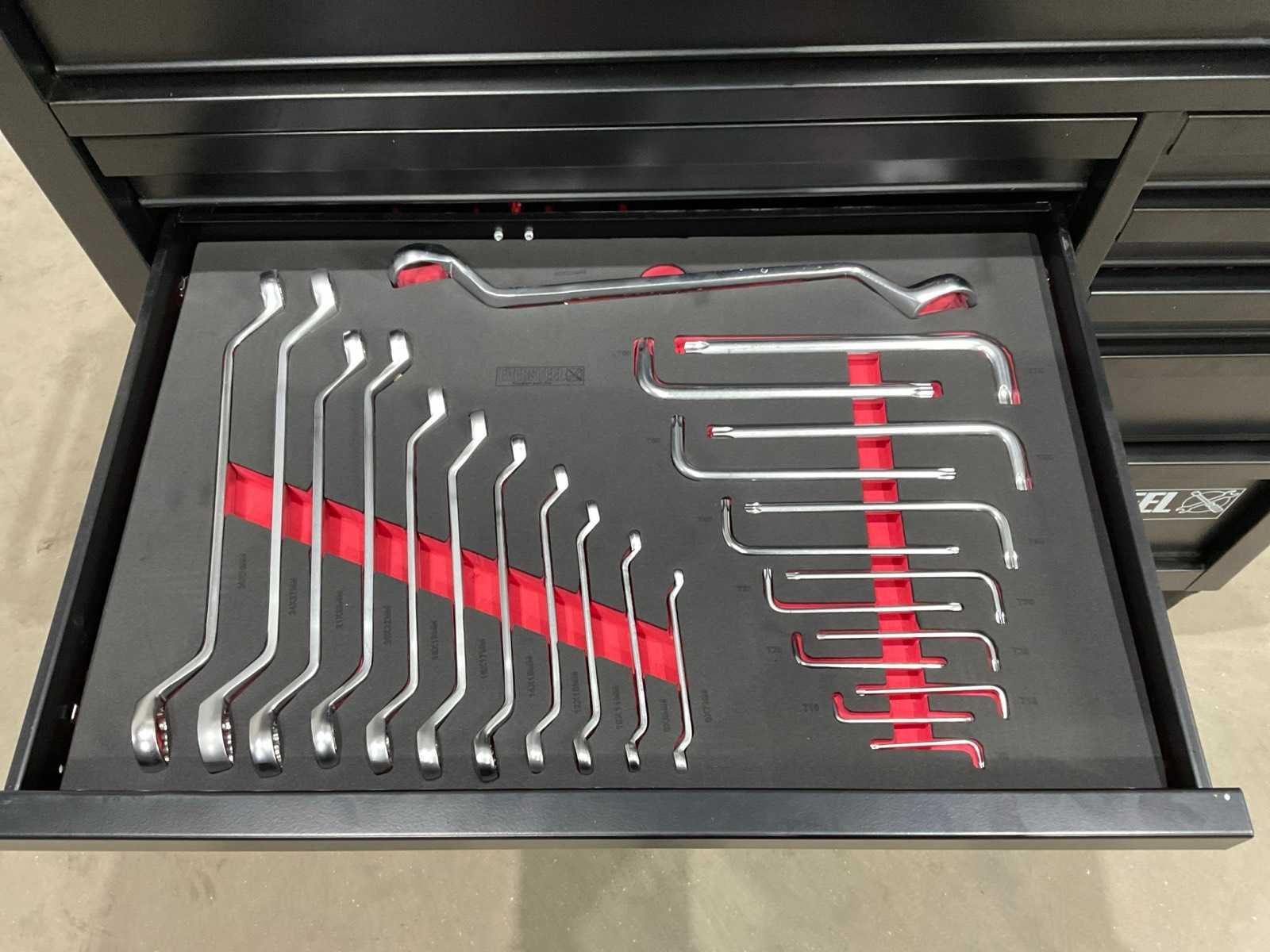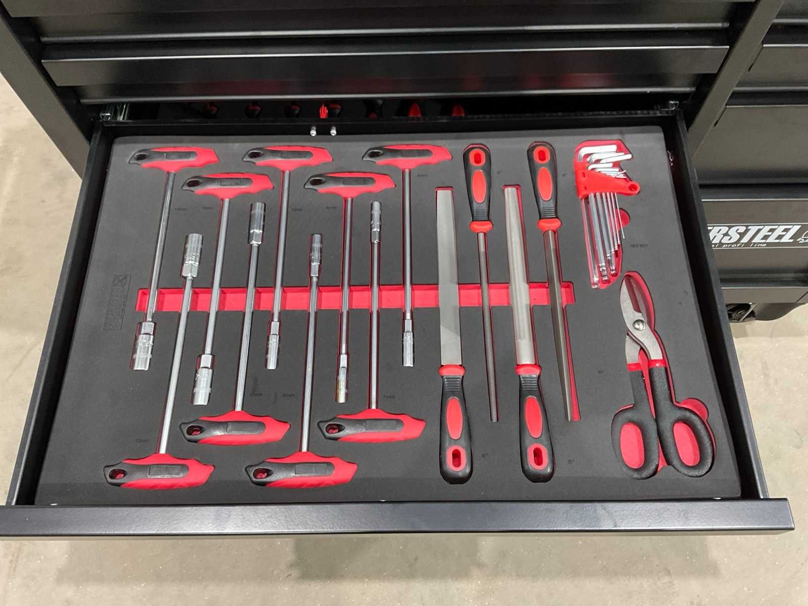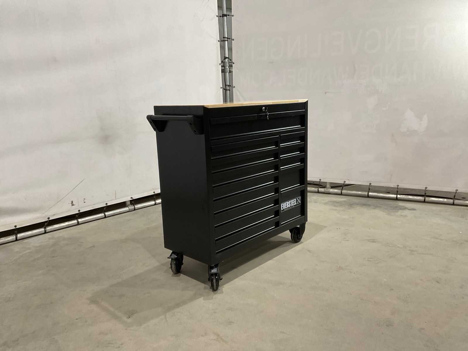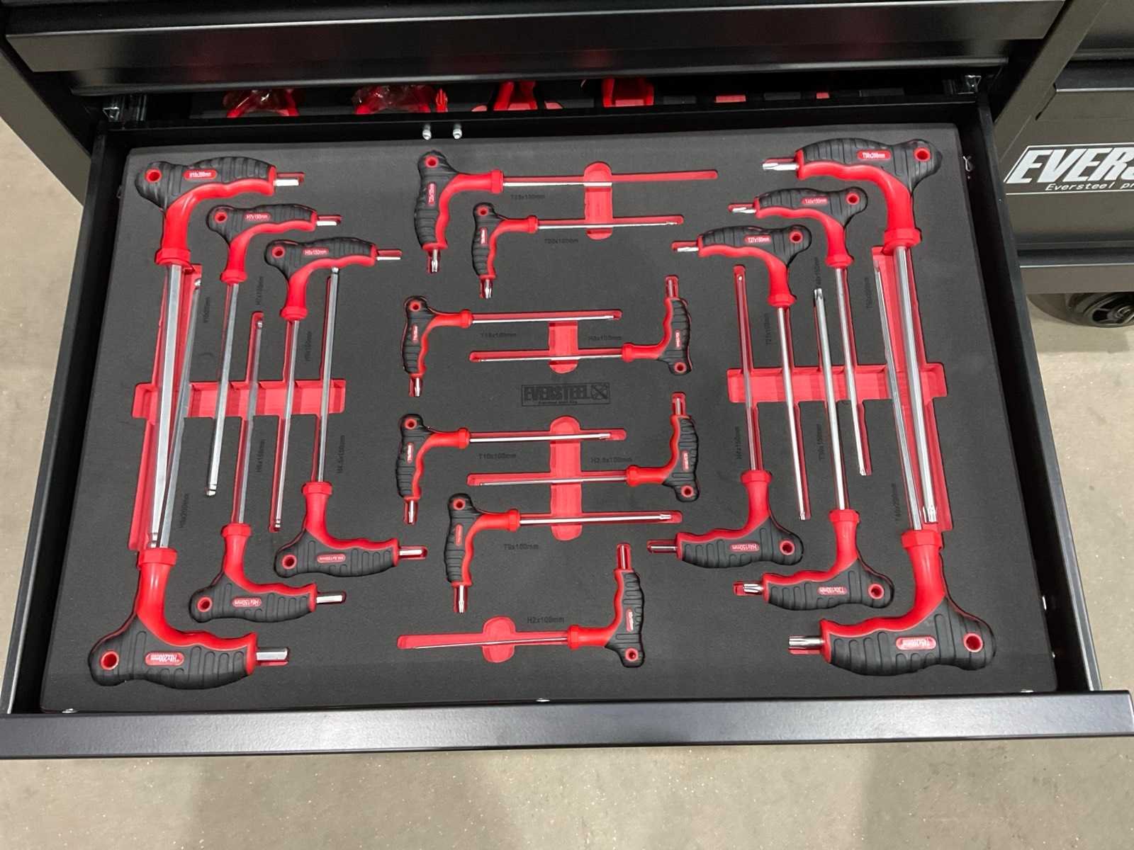 Bestaat uit 14 lades waarvan 11 gevuld met in totaal 355 stuks gereedschap; gereedschap is ingelegd in zwaar foam ; voorzien van houten werkblad; lades en wielen voorzien van kogellagers; ongebruikt in verpakking Merk: Eversteel Model: EV 25 14 Lengte: 112cm Breedte: 46cm Hoogte: 111cm