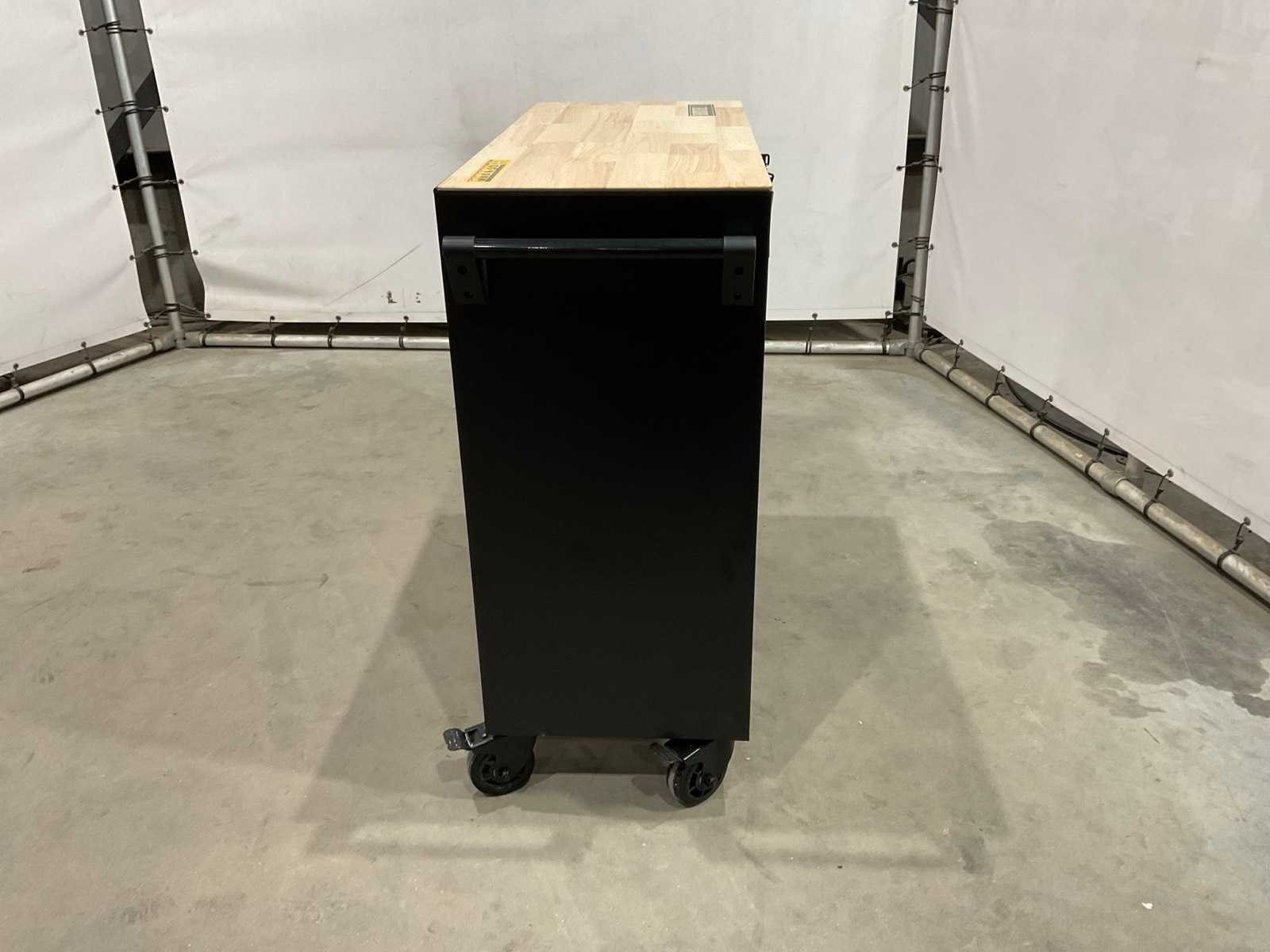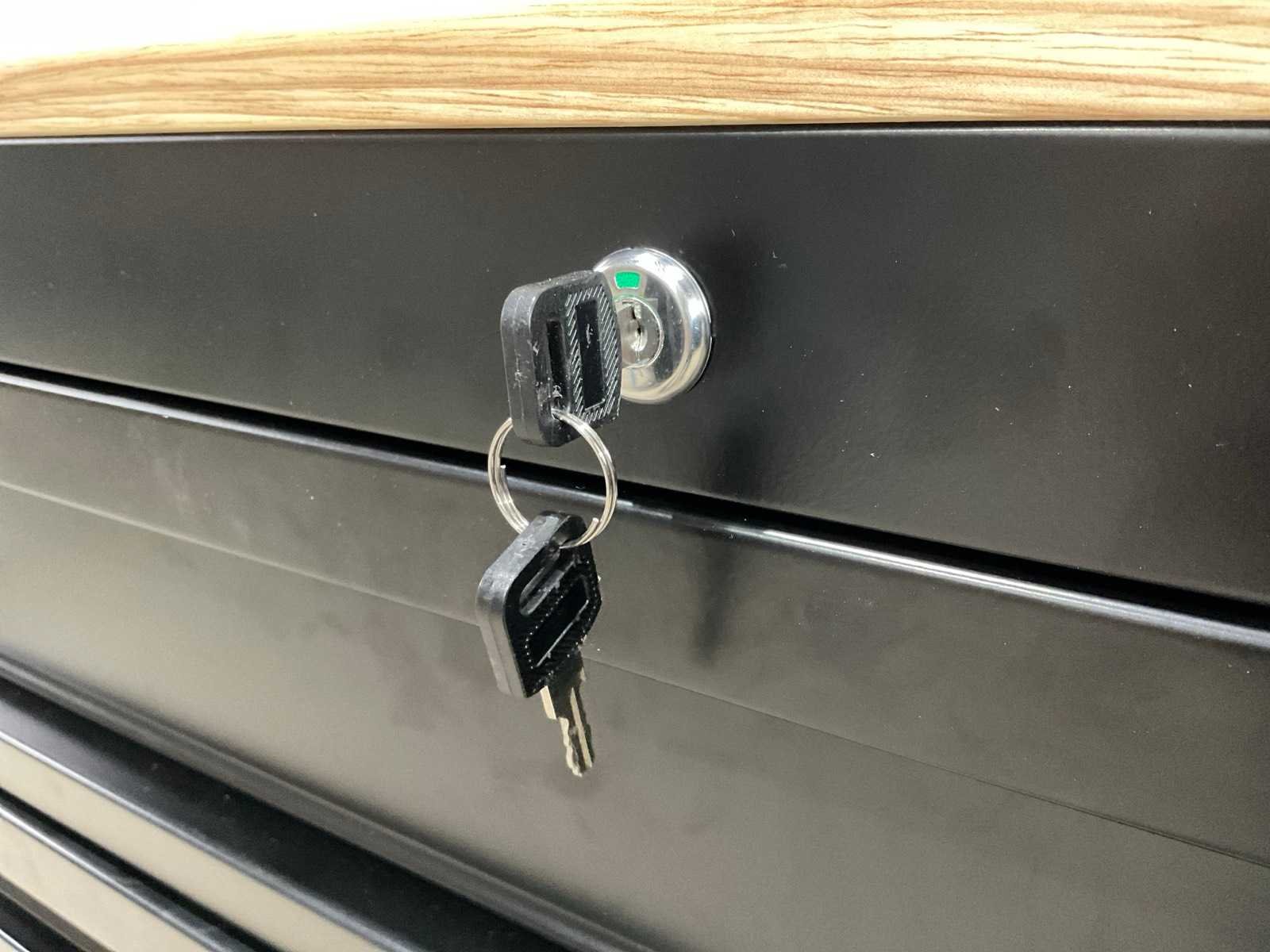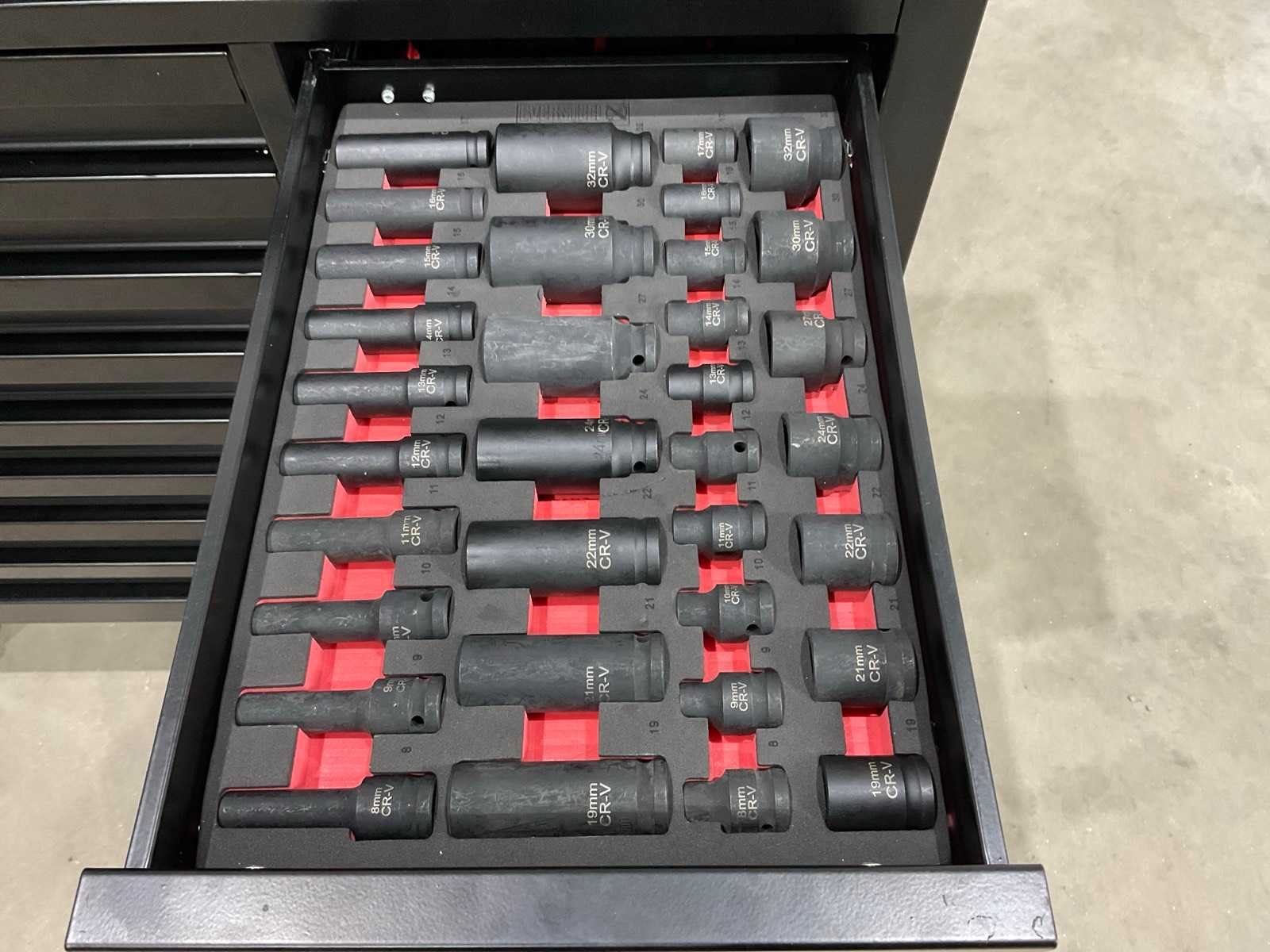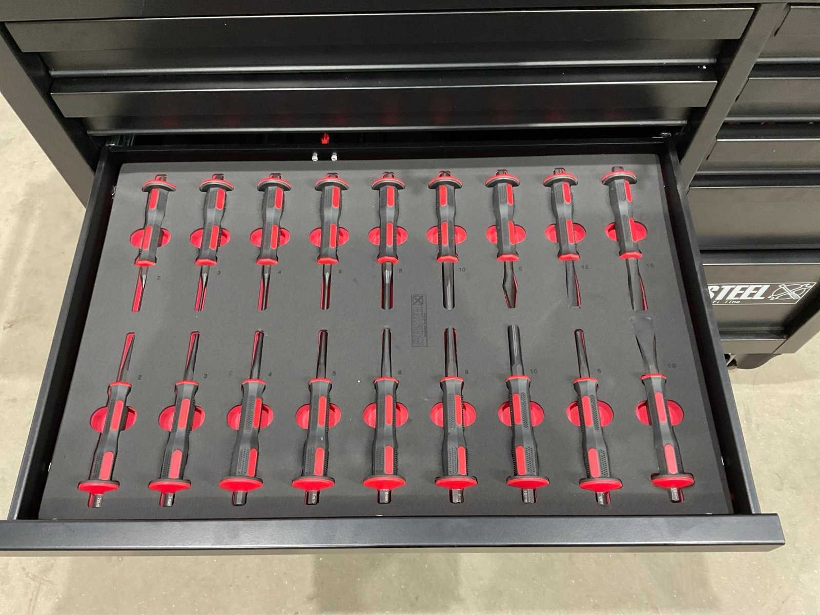 Bestaat uit 14 lades waarvan 11 gevuld met in totaal 355 stuks gereedschap; gereedschap is ingelegd in zwaar foam ; voorzien van houten werkblad; lades en wielen voorzien van kogellagers; ongebruikt in verpakking Merk: Eversteel Model: EV 25 14 Lengte: 112cm Breedte: 46cm Hoogte: 111cm