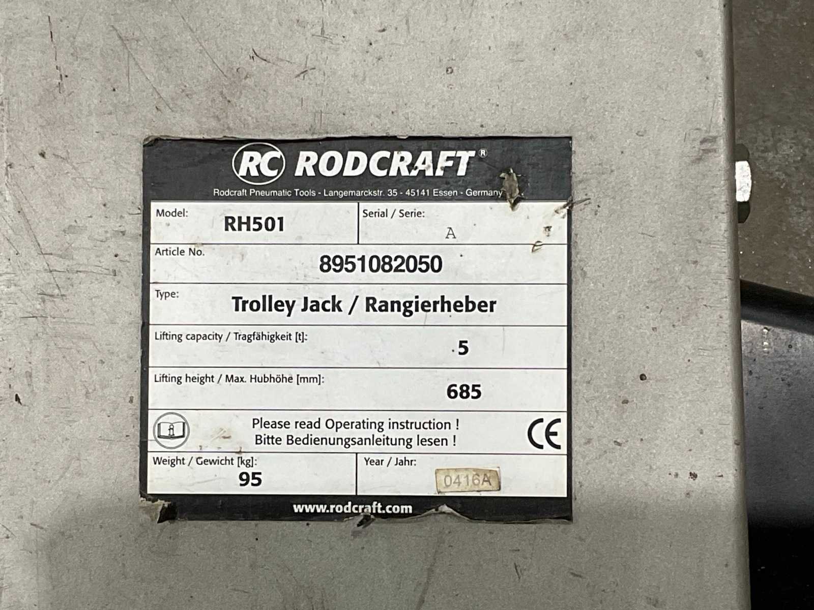 Merk: Rodcraft Type: RH501 Capaciteit.: 5t Eigen gewicht: 95kg Totale afmeting L: 1420mm Totale afmeting Breedte: 380mm Totale afmeting Hoogte: 1370mm