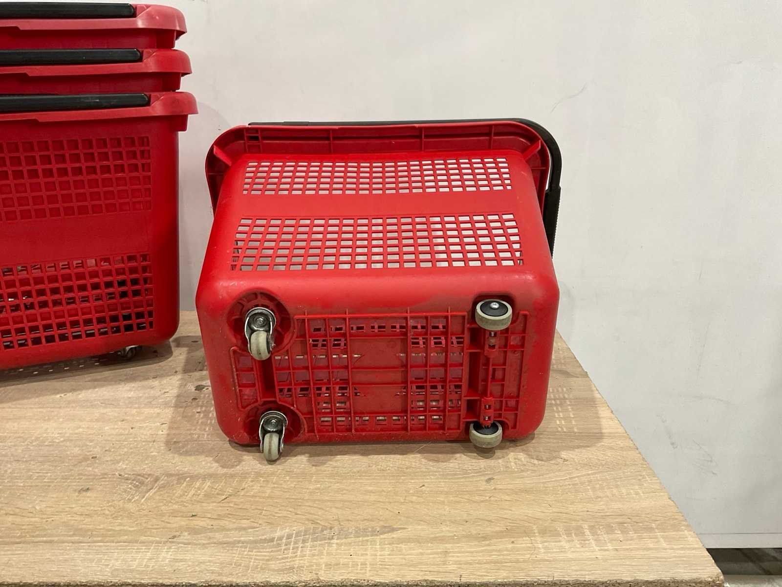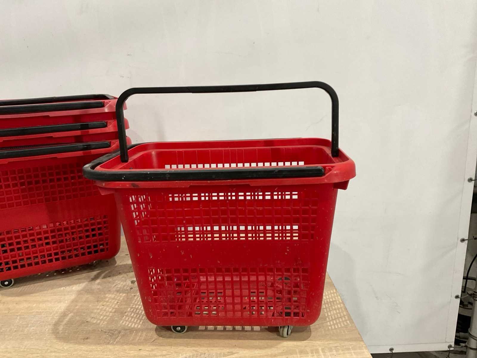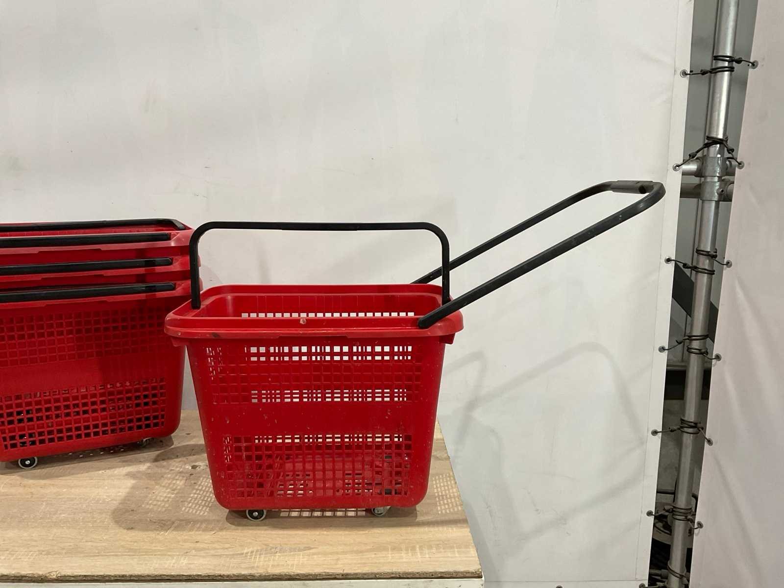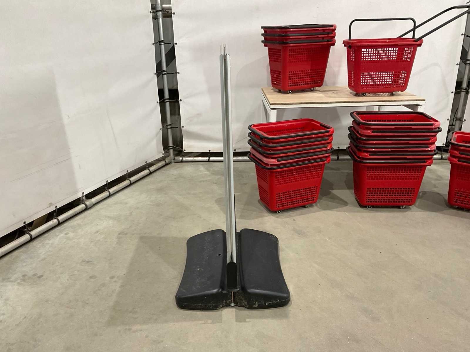 23 mandjes met wieltjes; circa 44 cm hoog; 55 cm lang; 40 breed; reclame bord circa 127 cm hoog; 76 cm breed