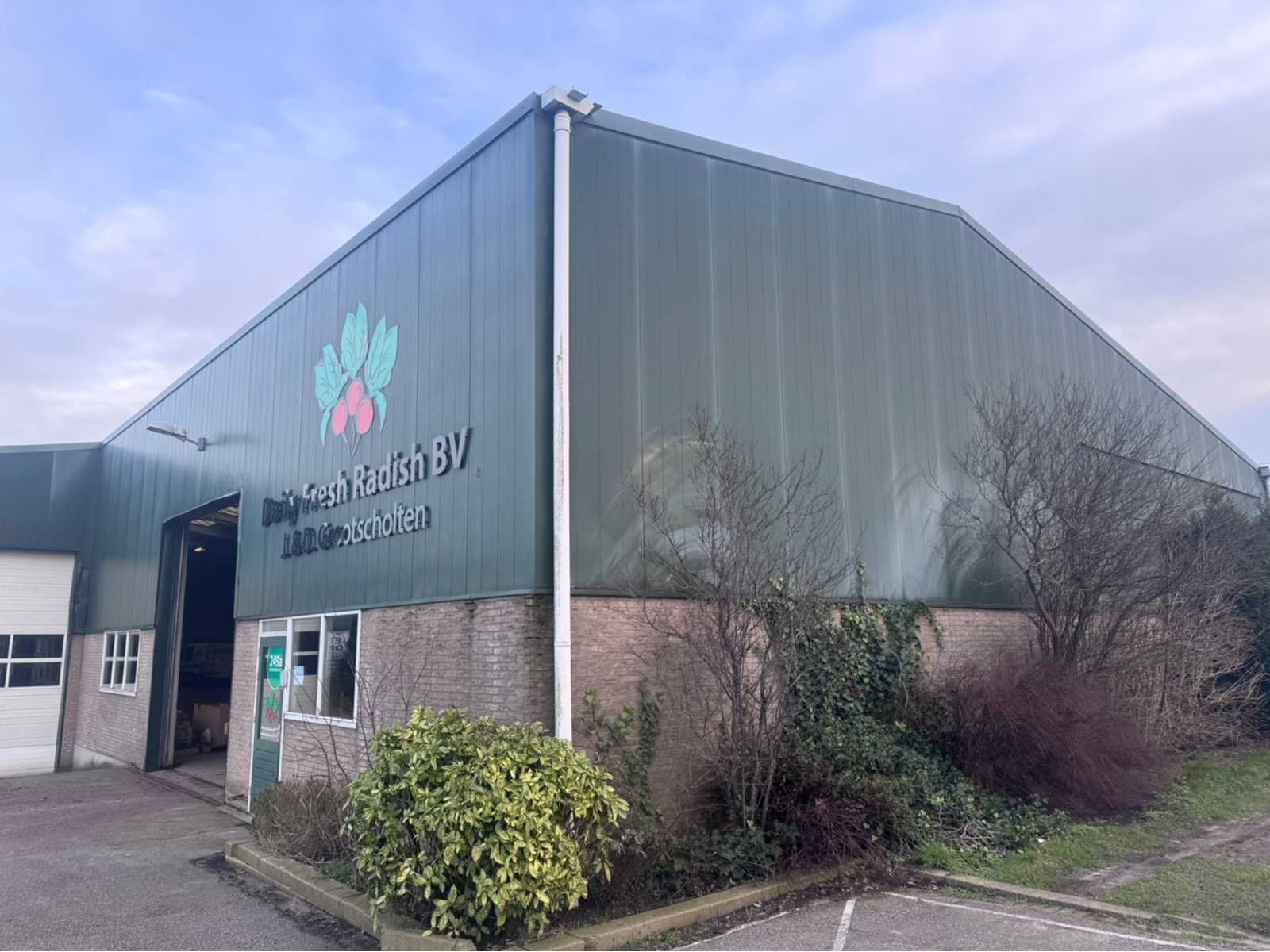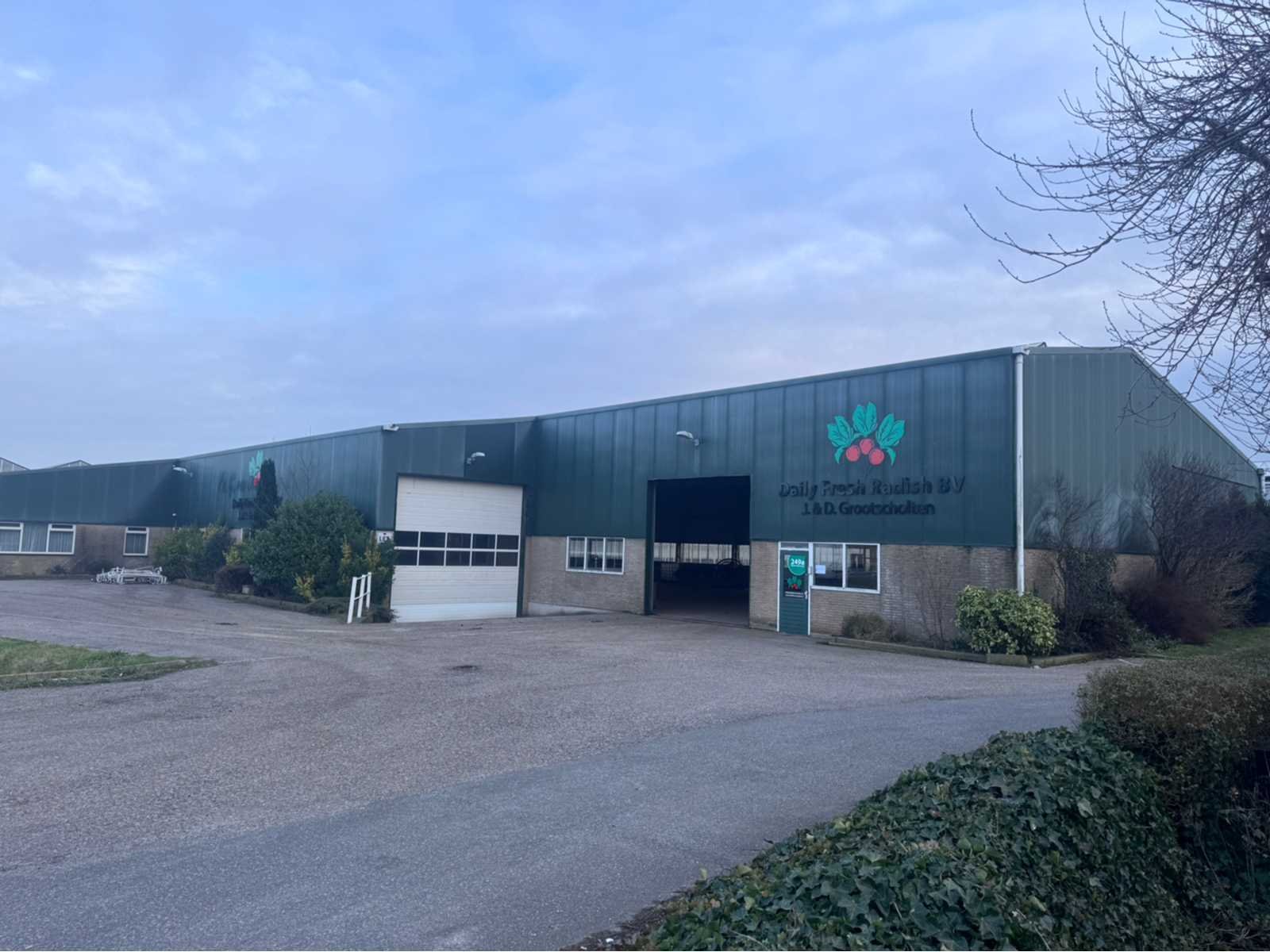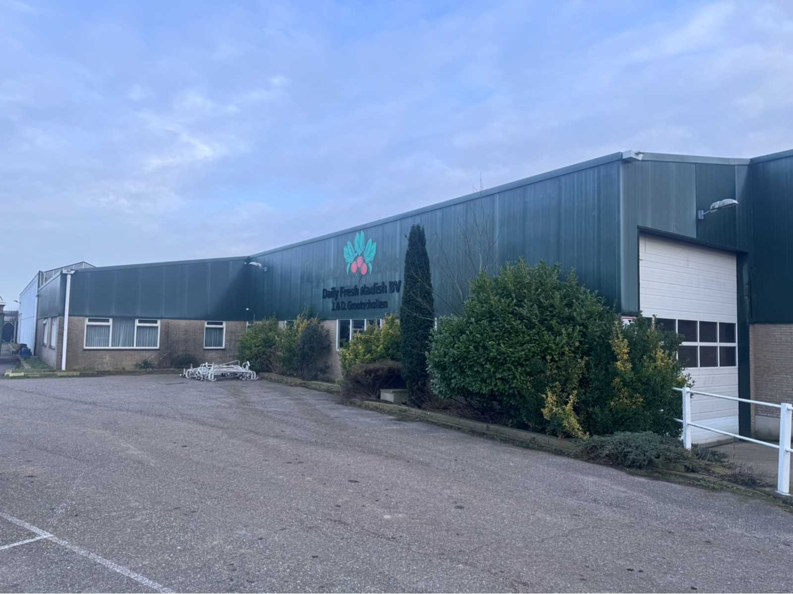 Wit gecoate staalconstructie; vak 1; vrije overspanning van 19980 mm; lengte van 36400 mm; vak 2; aanbouw Dock gedeelte van 5800 mm breed en een lengte van 18800 mm; vak 3; vrije overspanning van 25800 mm; lengte van 14930 mm; vak 4; aanbouw gedeelte van 7690 mm diep en een lengte van 14930 mm; goothoogte aanbouw zijde kas is 5500 mm; nokhoogte is 8300 mm; goothoogte aanbouw vak 4 is 4200 mm; vakmaat 4500 mm; hoofd staanders IPE 300; spantbenen IPE 300; kopgevel staanders IPE 200; met kruisschoren en windverbanden; doorlopende nokluchting met mechanische aandrijving; met 3 overheaddeuren en de aanwezige gevel beplating; met Dock levelaar en bediening; zonnepaneel installatie van 290 panelen; 170 zonnepanelen zijn 270 WP; en 120 zonnepanelen zijn 255 WP; met 4 bijhorende omvormers; totale installatie is 76500 WP; met montage systeem en bijhorende bekabeling tot aan de omvormers; wordt vakkundig gedemonteerd door verkoper en transport klaar gemaakt;