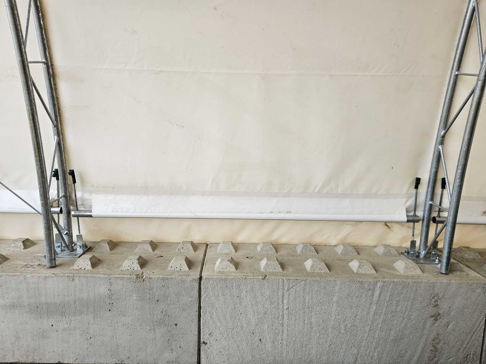 Vrije overspanning van 12000 mm; vakmaat 2500 mm; totaal 8 vakken van 2500 mm; nokhoogte 6000 mm; volblad verzinkte constructie; ongebruikte constructie met nieuw zeil; compleet met druk en trek stangen; voet platen en klein materiaal; wordt netjes verpakt door verkoper; Totaal oppervlakte: 240m² Nok hoogte: 6000mm